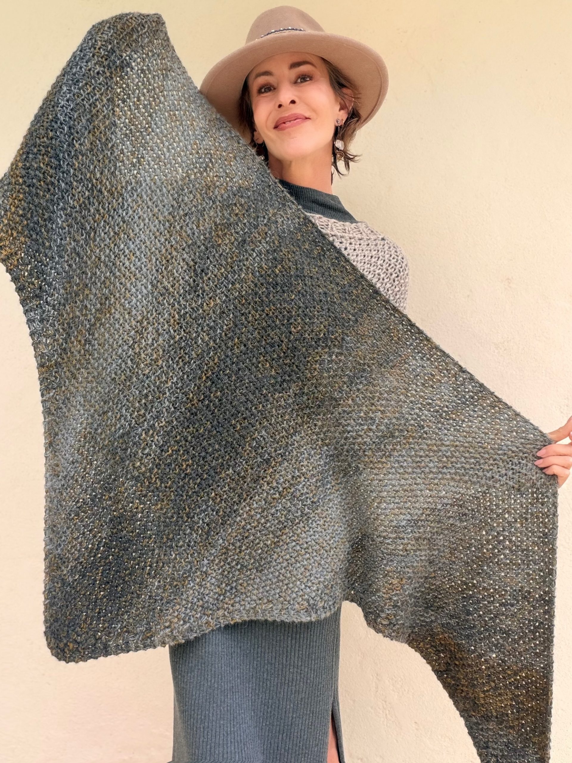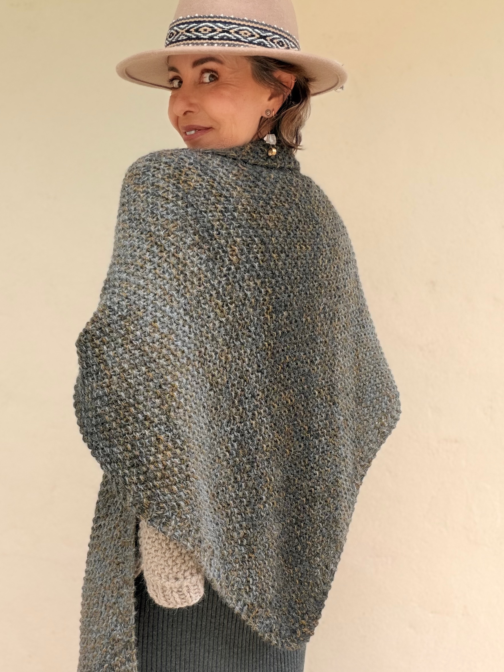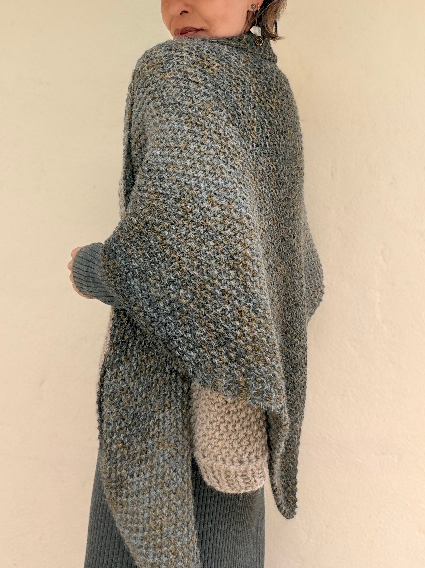 Hand-knitted shawl in soft baby alpaca, a natural fiber known for its lightness, warmth and extraordinary softness. Its triangular-shaped design allows it to be worn in multiple ways, wrapping around the neck or draped over the shoulders in a relaxed and elegant style.