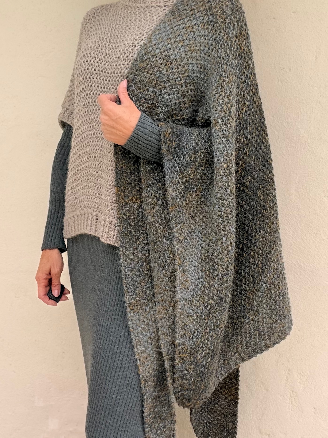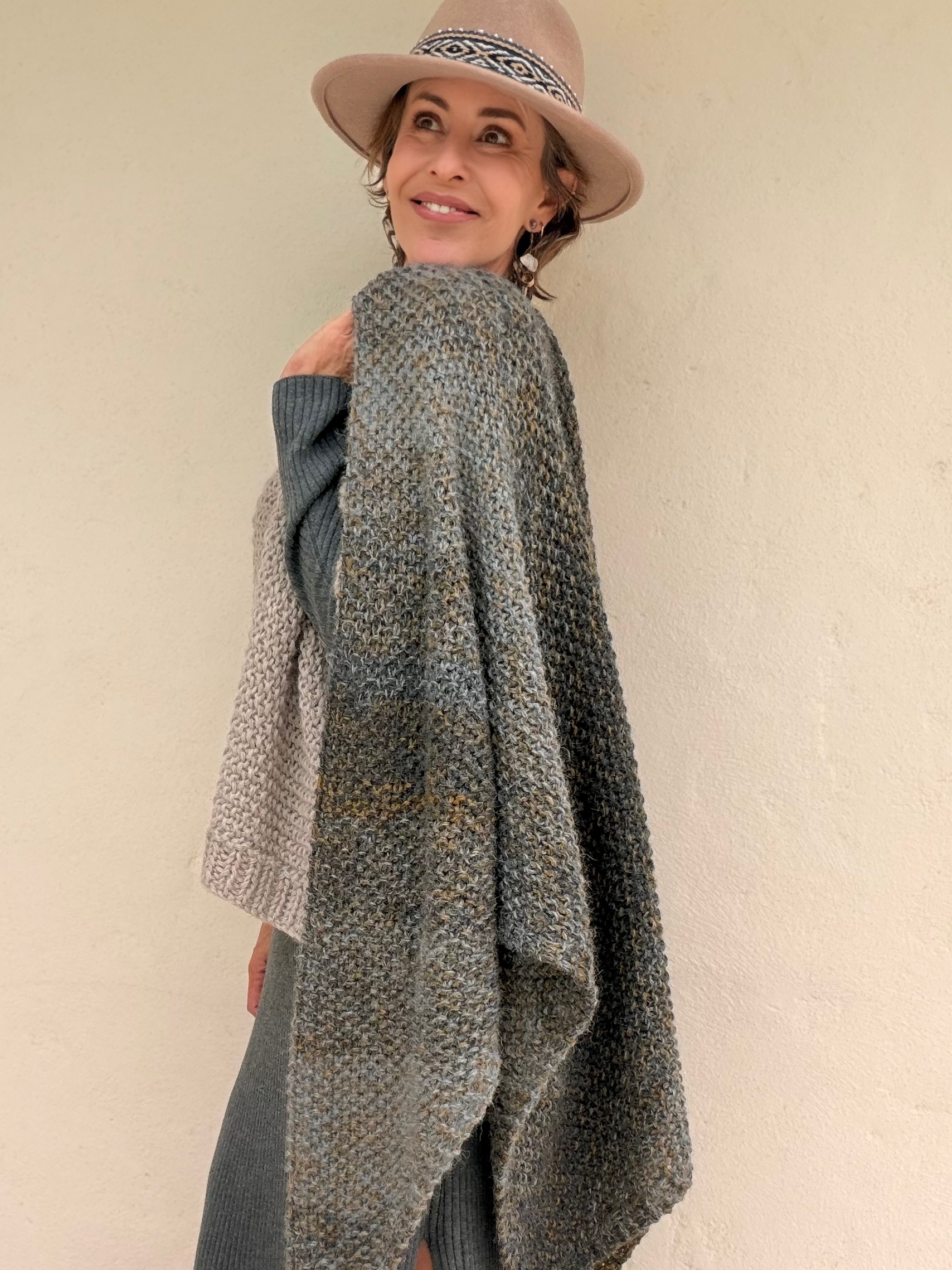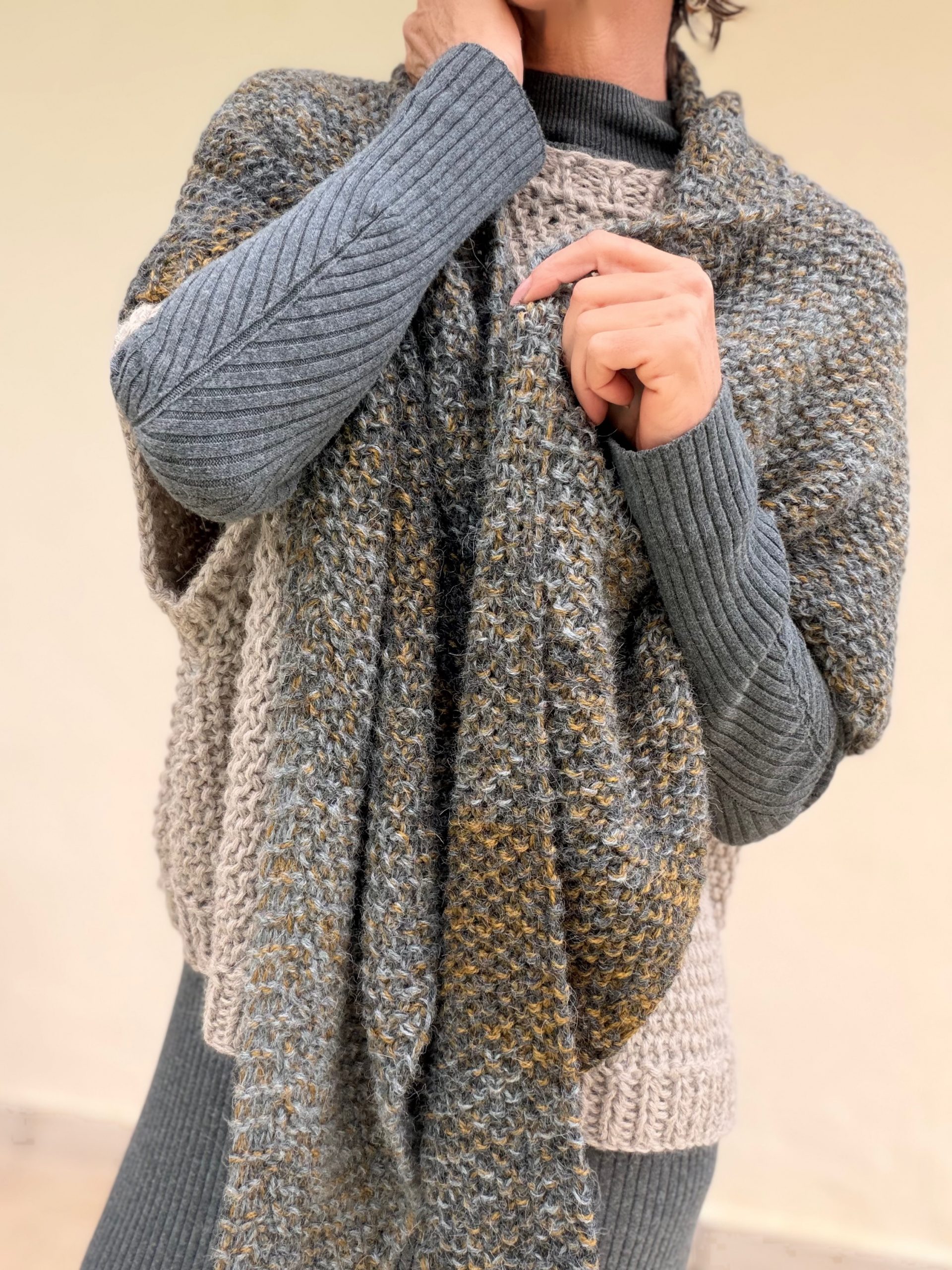 Knitted shawl in baby alpaca wool and gray tones with bronze shades