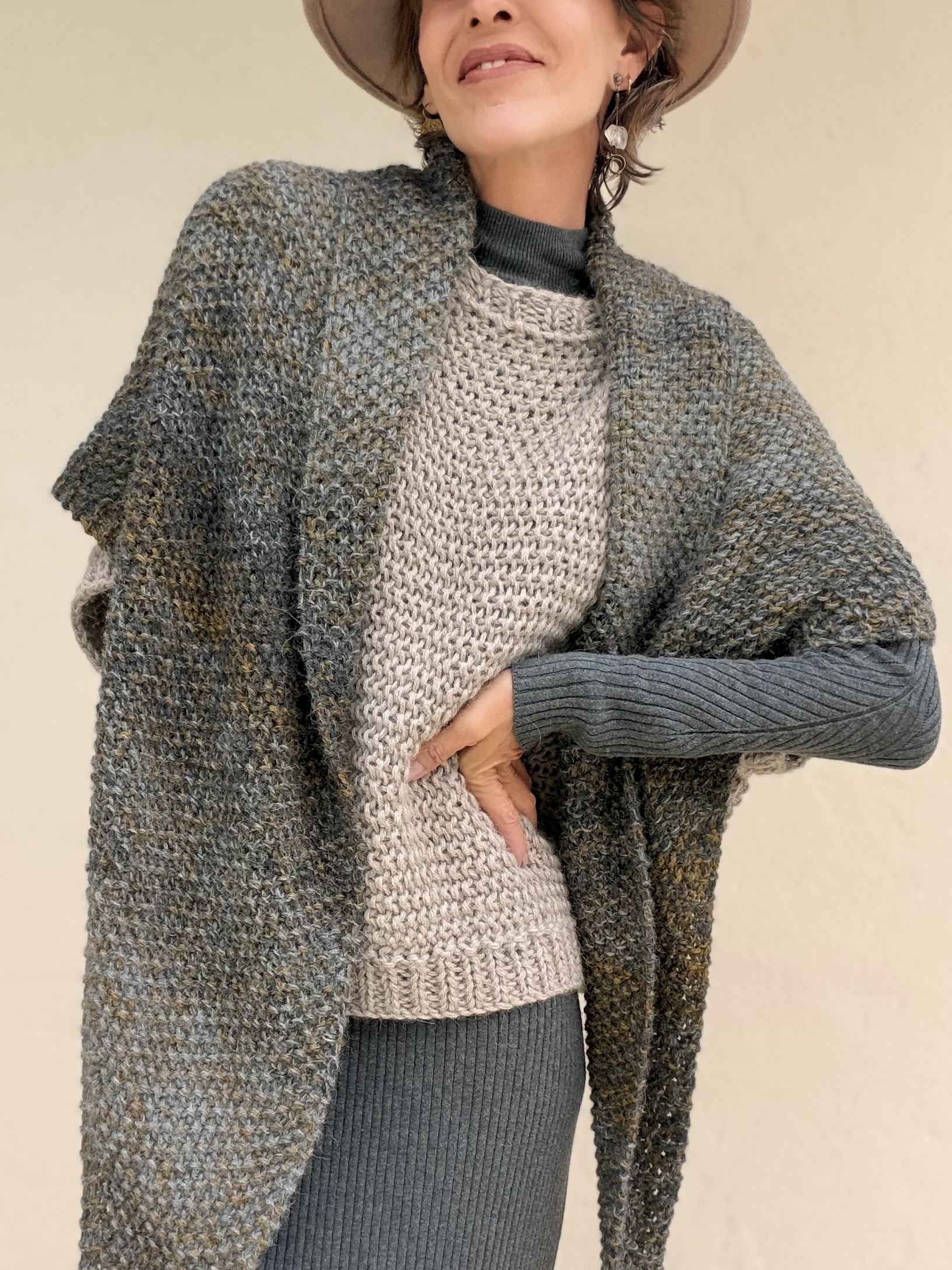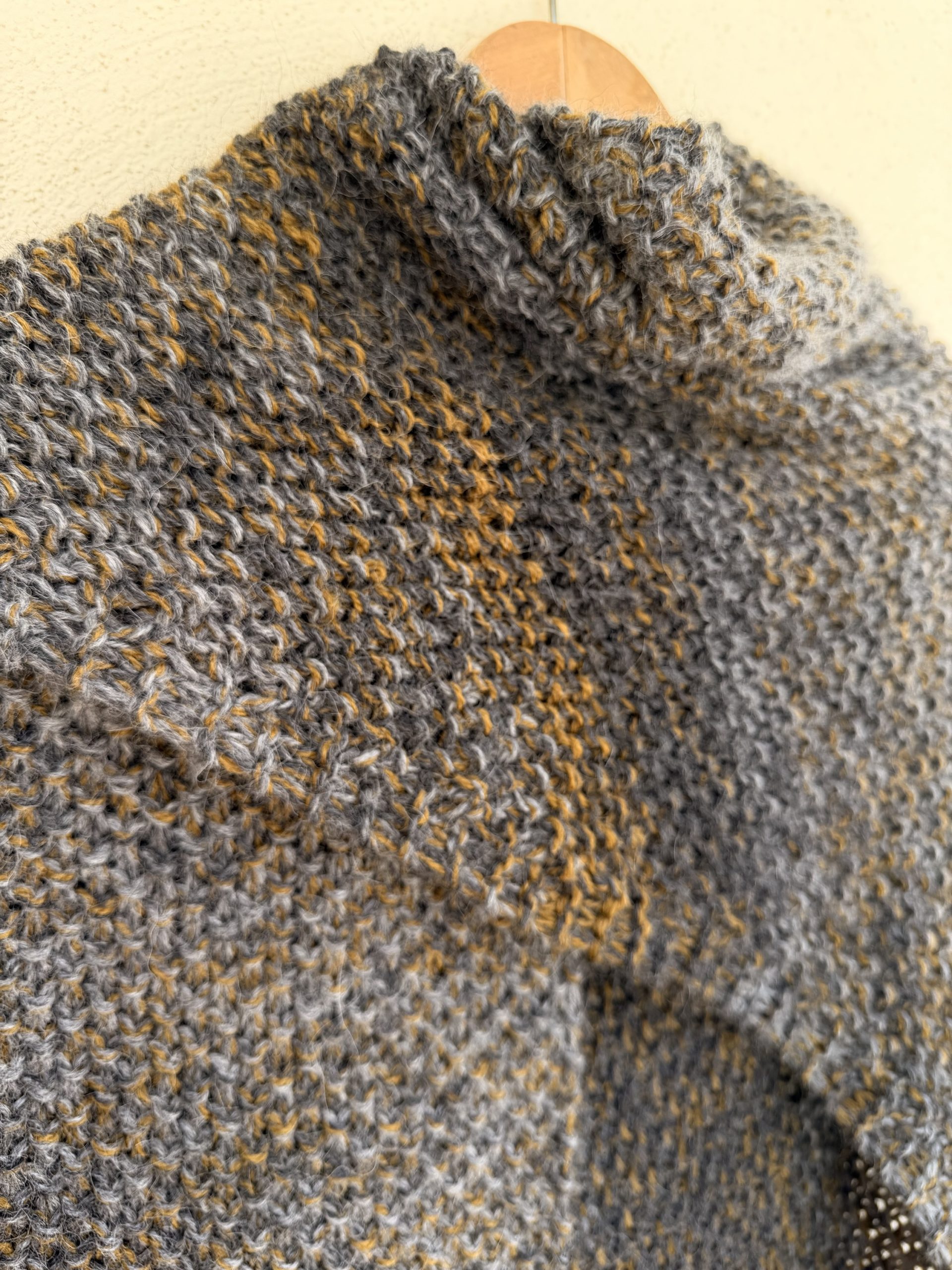 The mixture of gray tones with subtle bronze shades creates a very special marbled effect that adds depth and character to the piece. Its hand-knitted texture enhances the charm of a garment made with time and dedication.