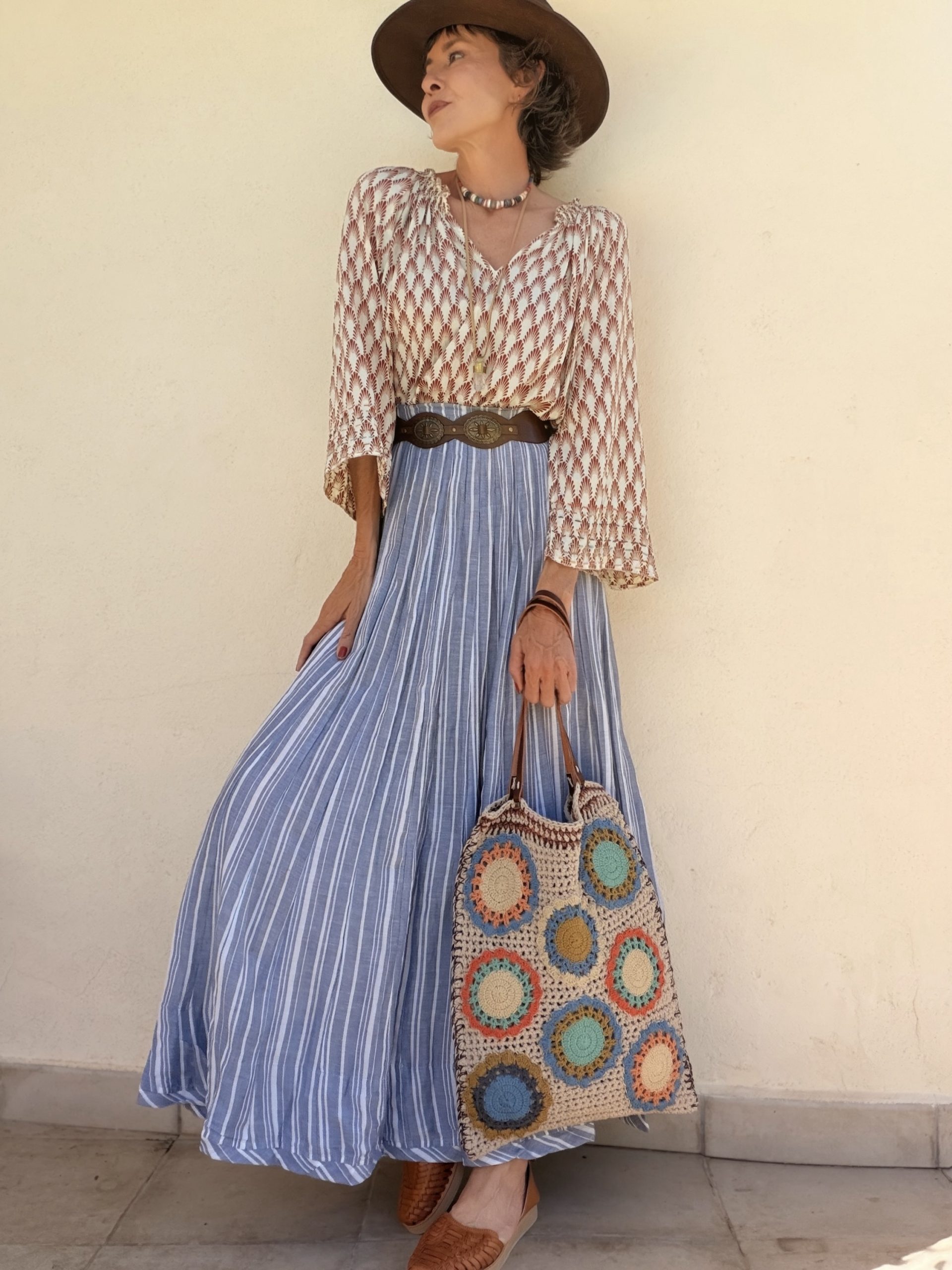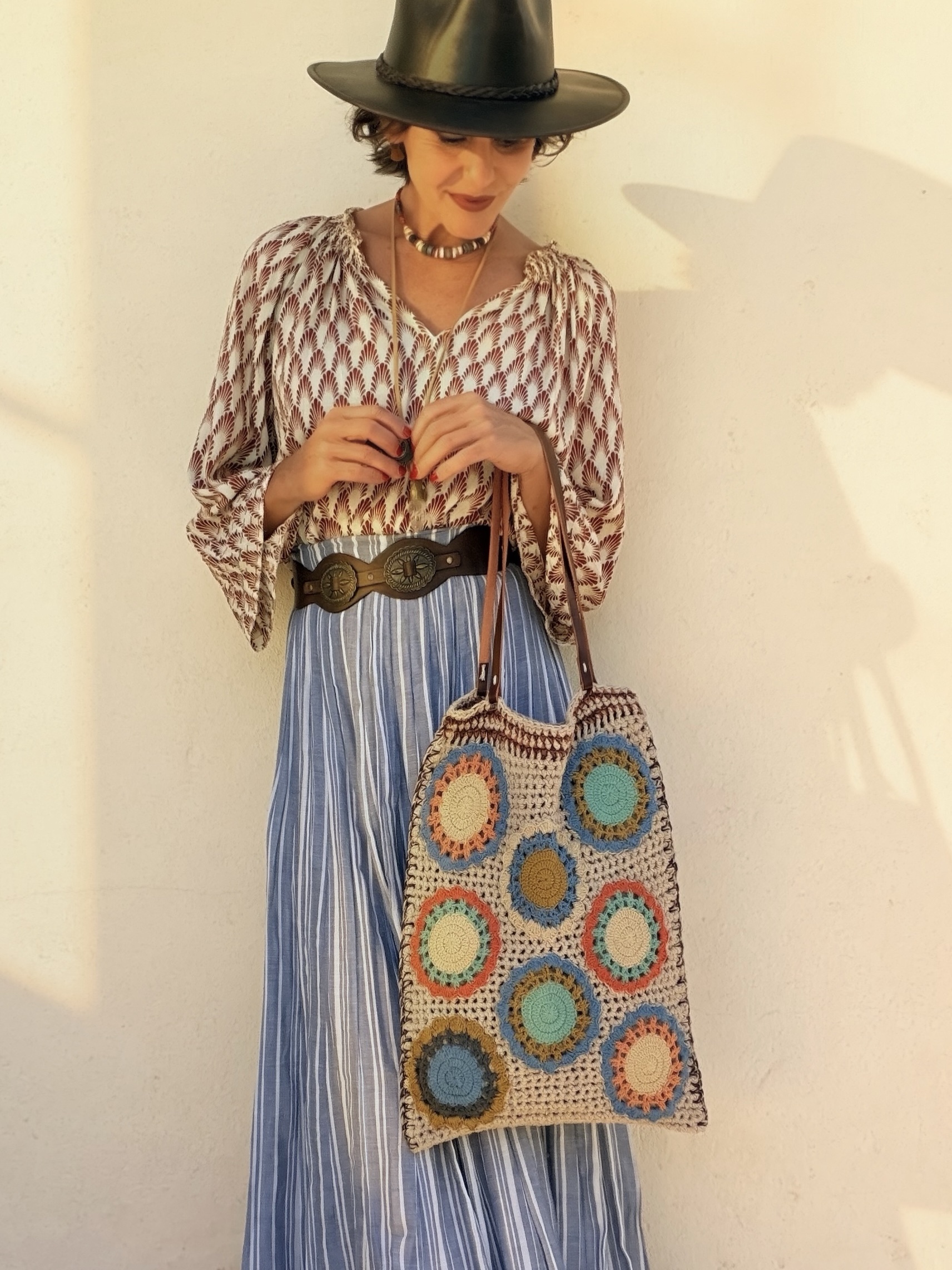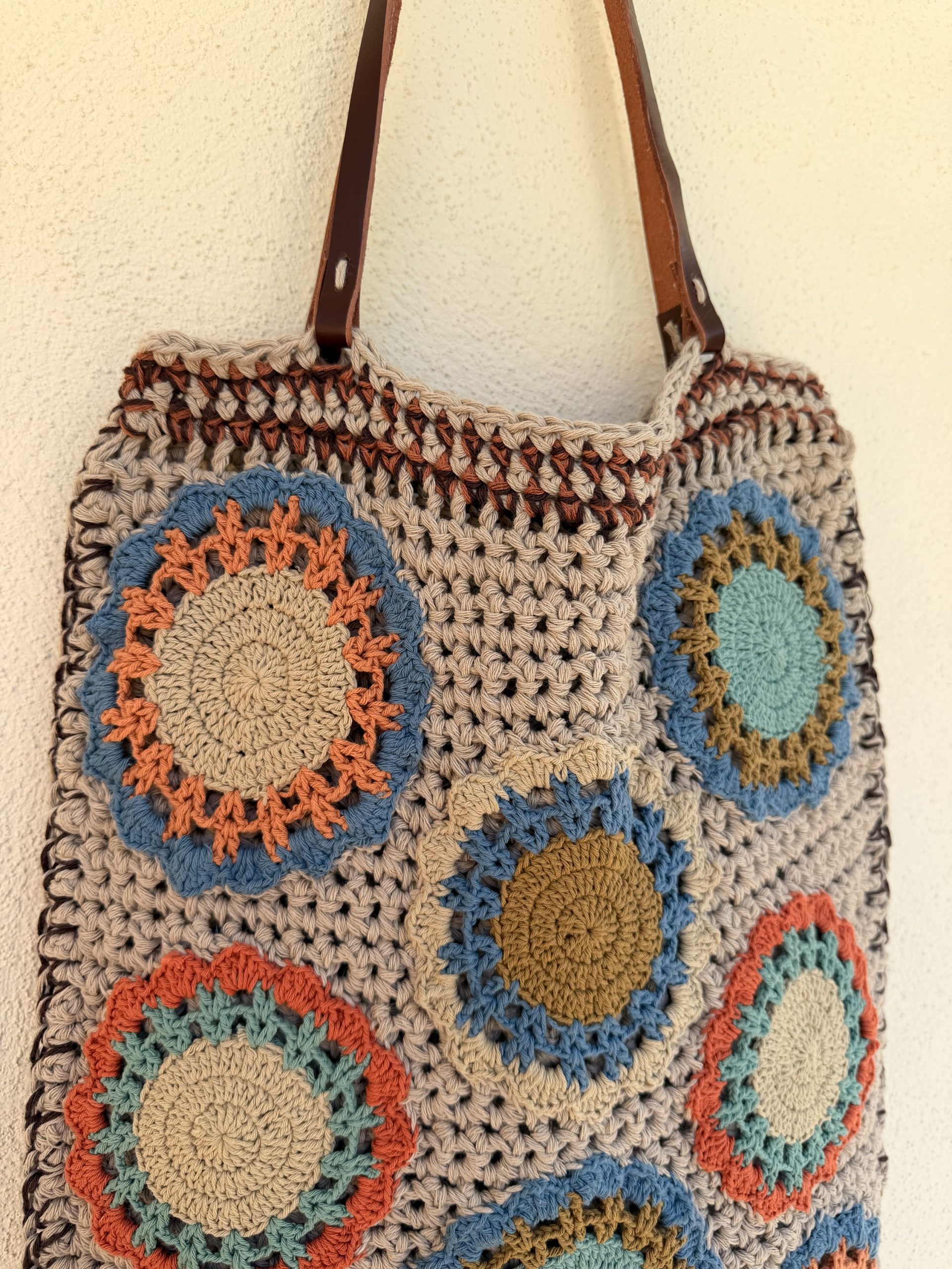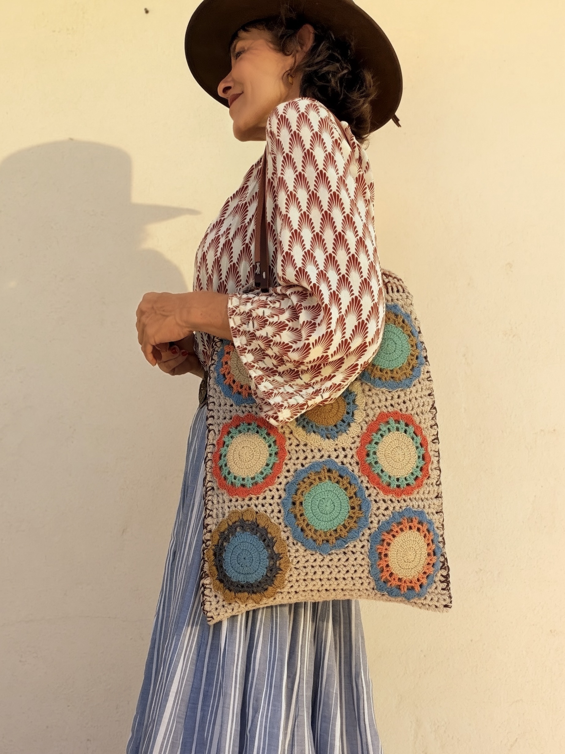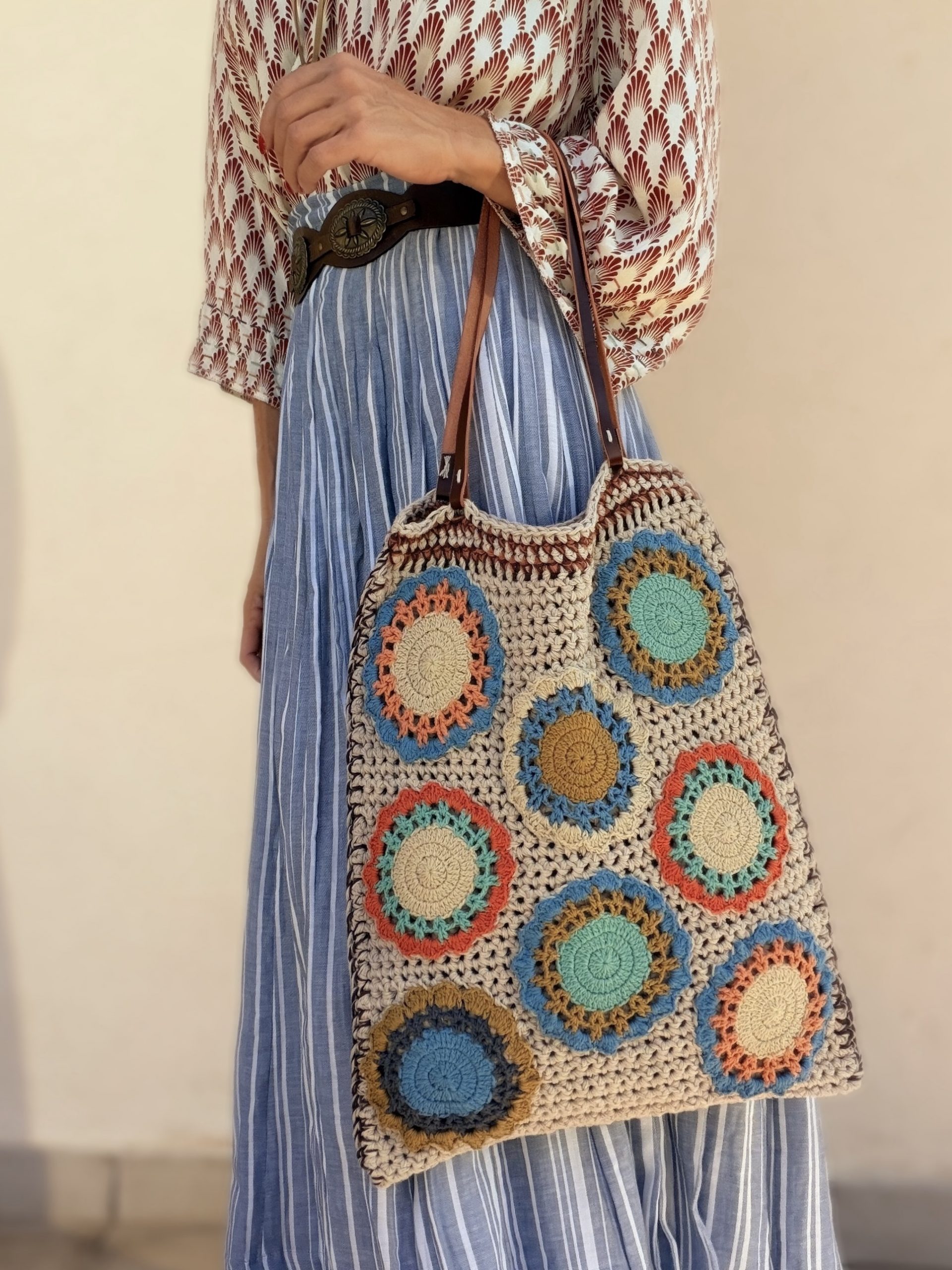 Handmade bag hand crocheted with natural cotton thread. Its design stands out for the multicolored circular motifs that provide a bohemian and cheerful air.