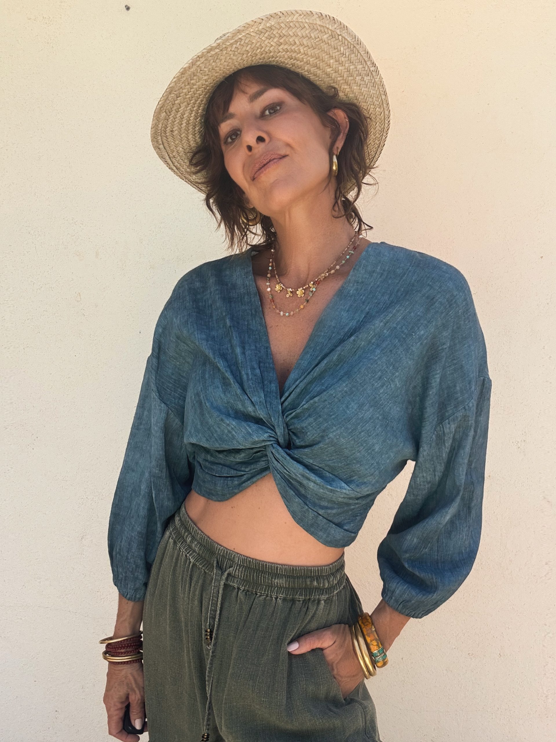Crop top made in rustic cotton to give it more body, and color with washed effect. One size fits all, with midi pantie sleeves and loose elastic for shaping without tightening. The design with central knot and cut out effect on the abdomen provides a sensual and summery look, without losing comfort and elegance.