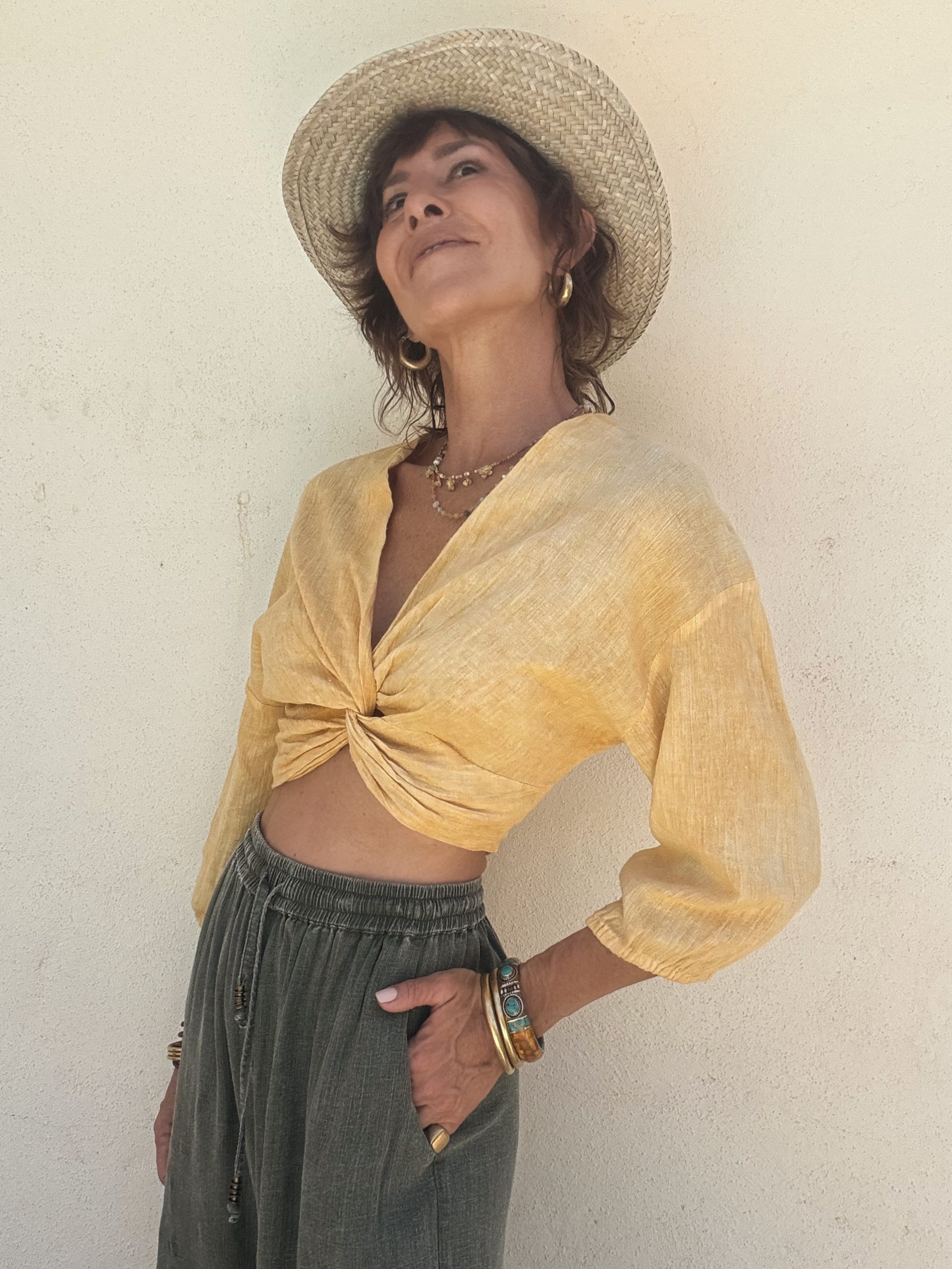Crop top made in rustic cotton to give it more body, and color with washed effect. One size fits all, with midi pantie sleeves and loose elastic for shaping without tightening. The design with central knot and cut out effect on the abdomen provides a sensual and summery look, without losing comfort and elegance.