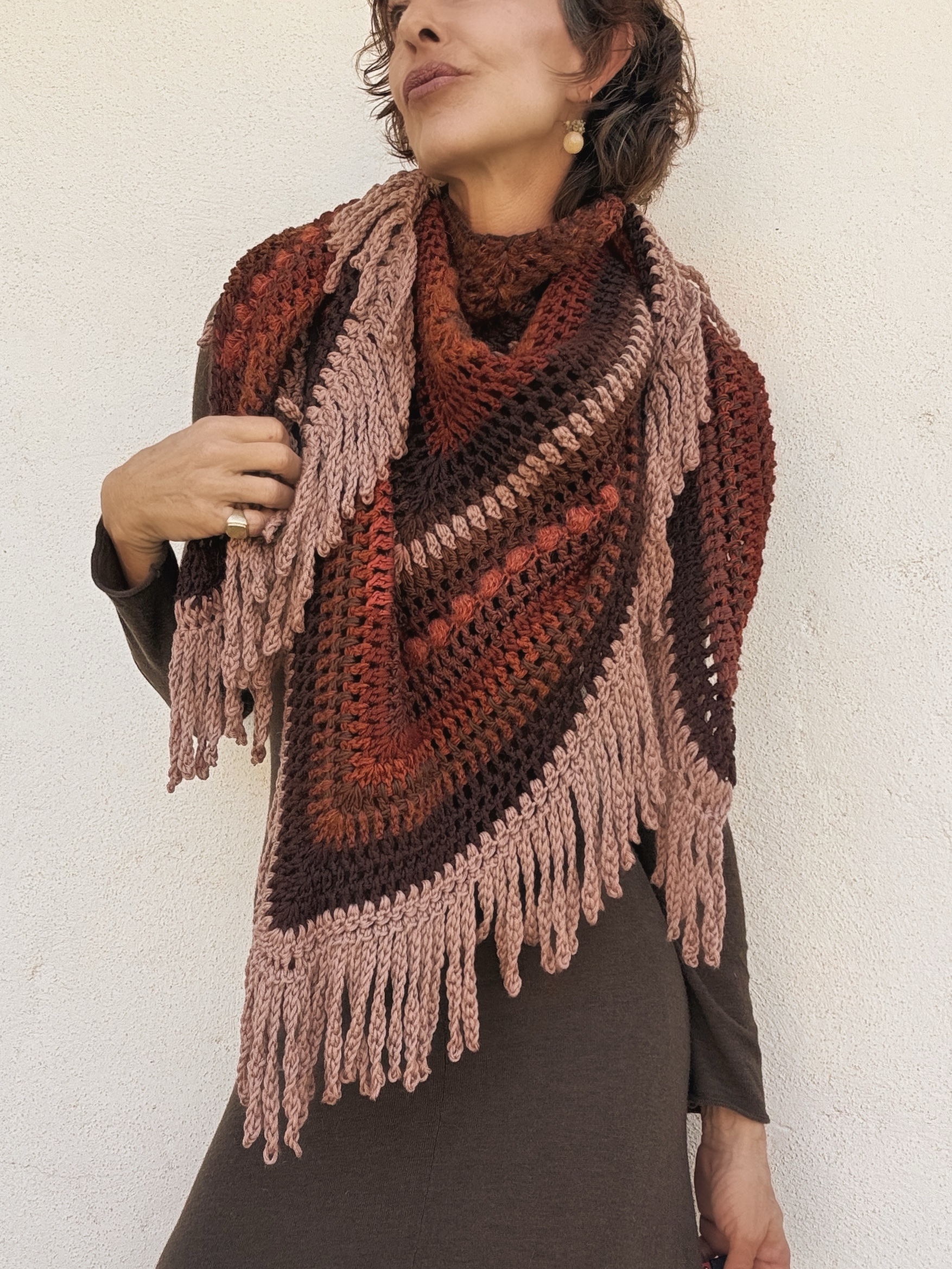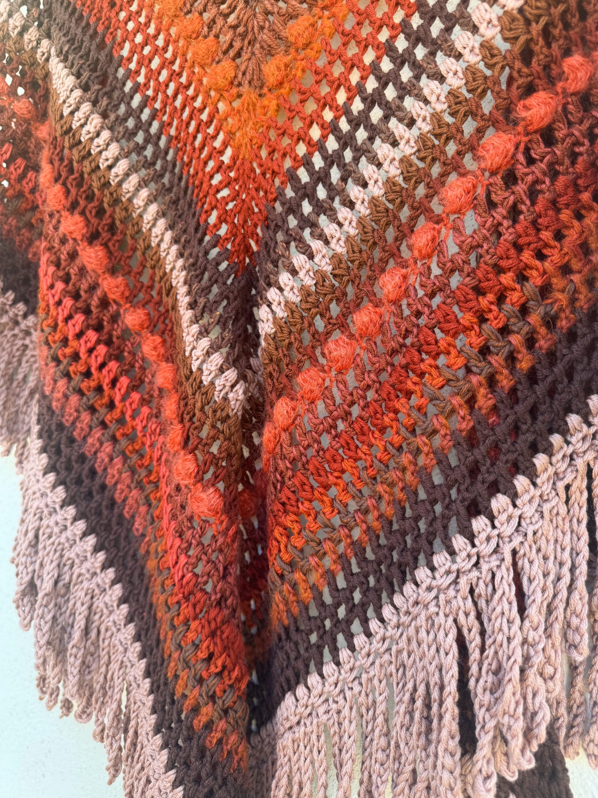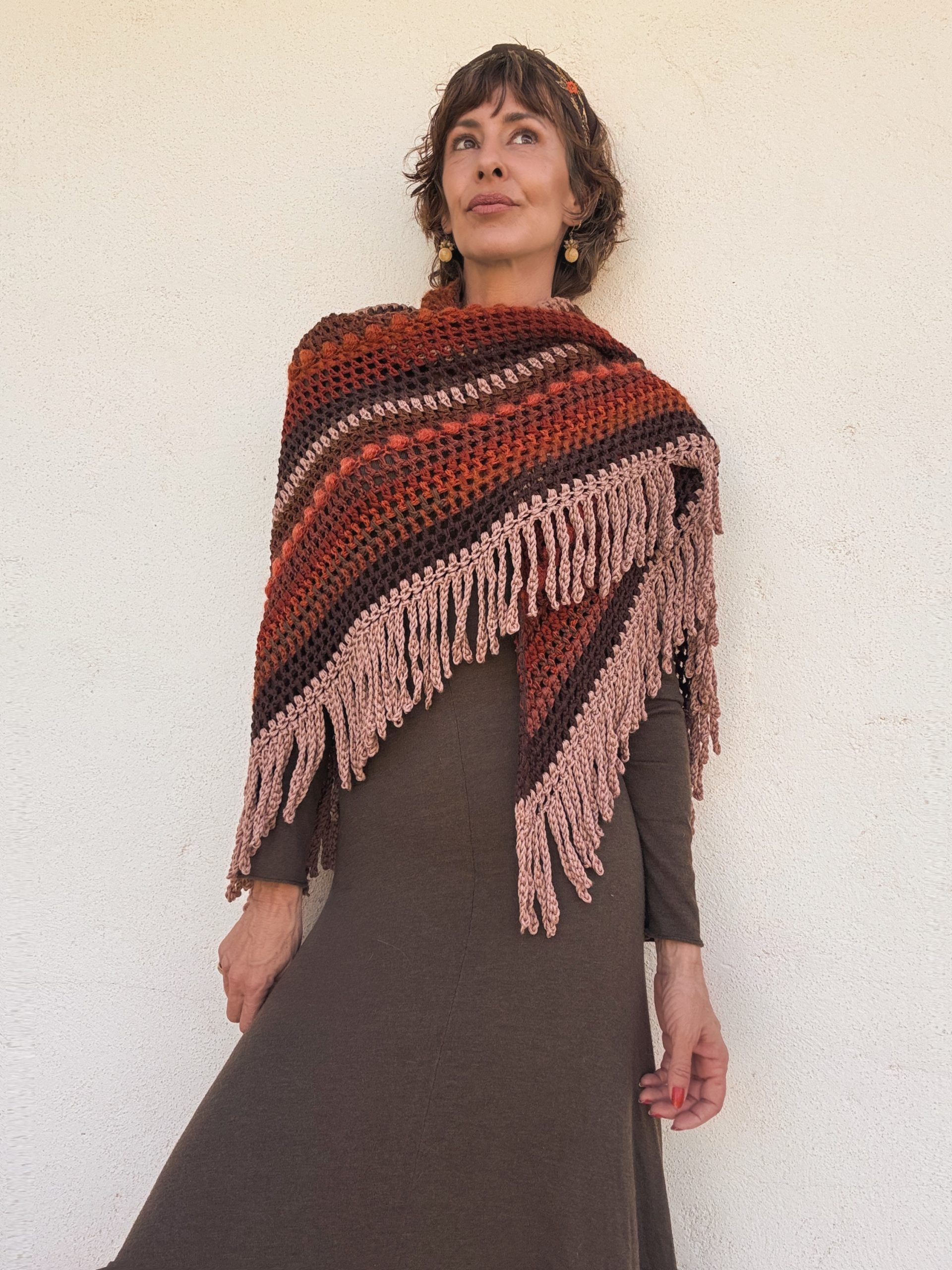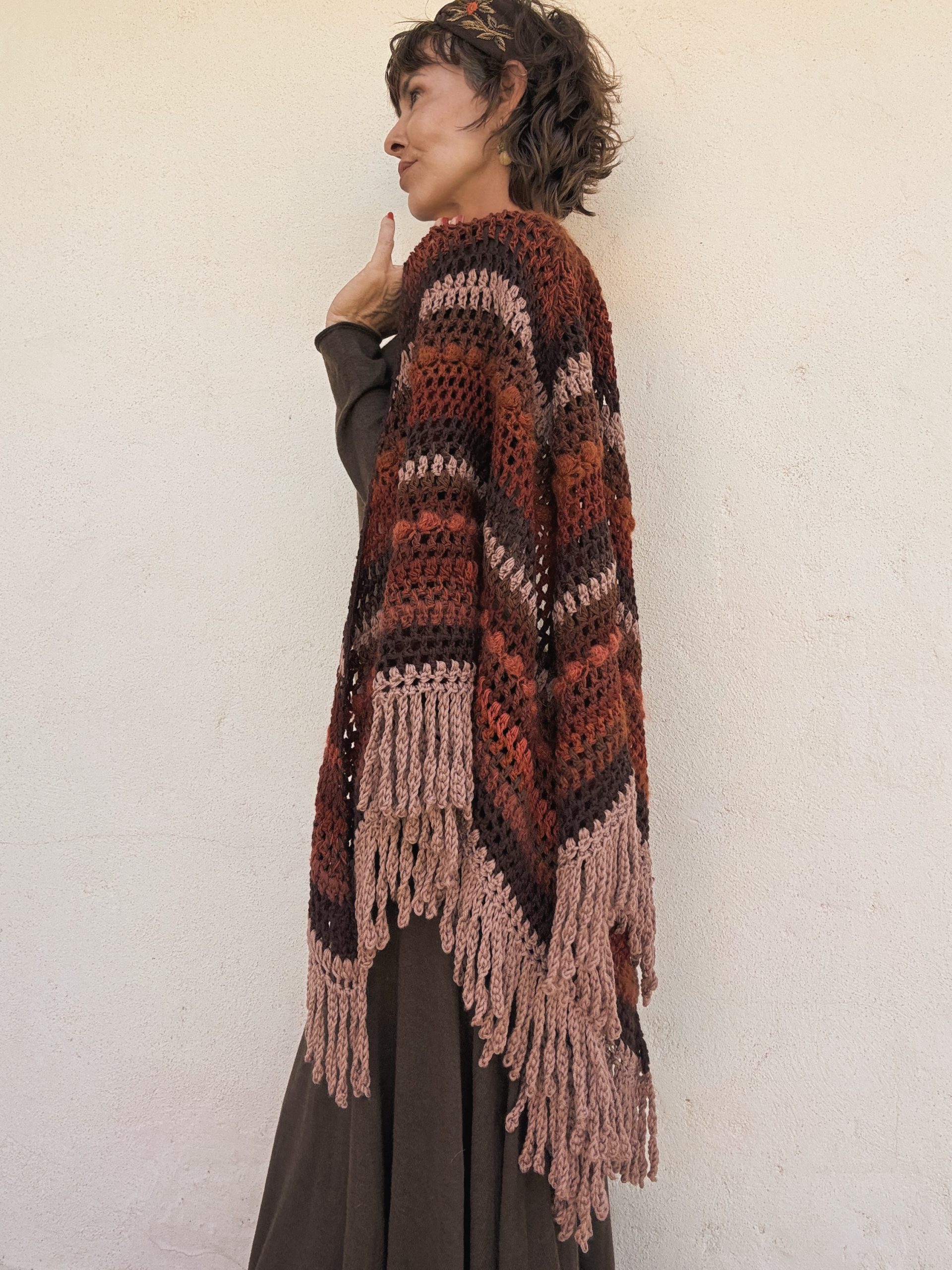 Hand crocheted Merino wool and mohair shawl, with a harmonious blend of warm colors: intense reds, earthy browns and toasted pink. Each stitch combines soft and light textures that add volume and movement. The bangs on the edges complete the piece with a handmade and bohemian touch. A unique garment, enveloping and full of character.
