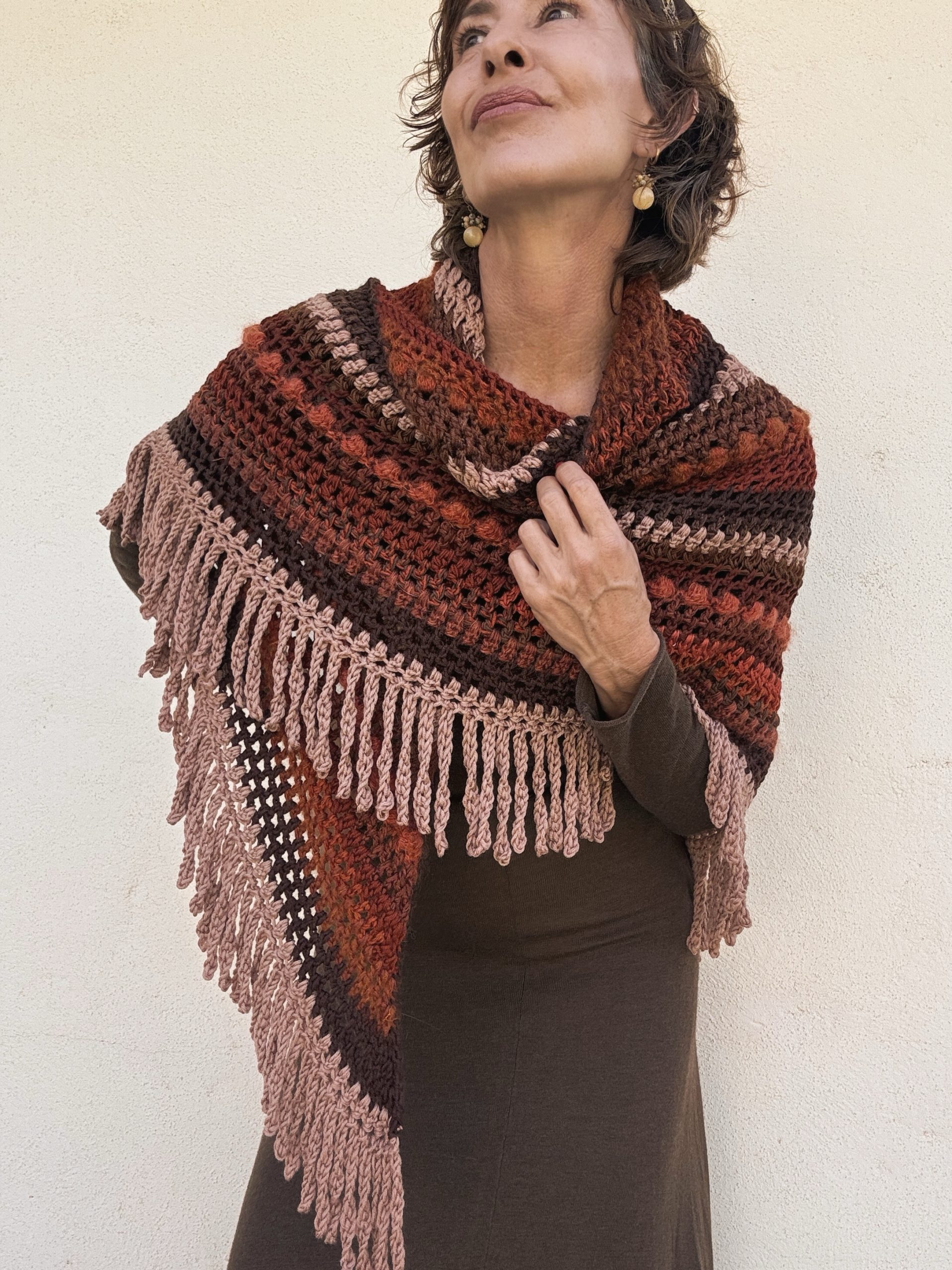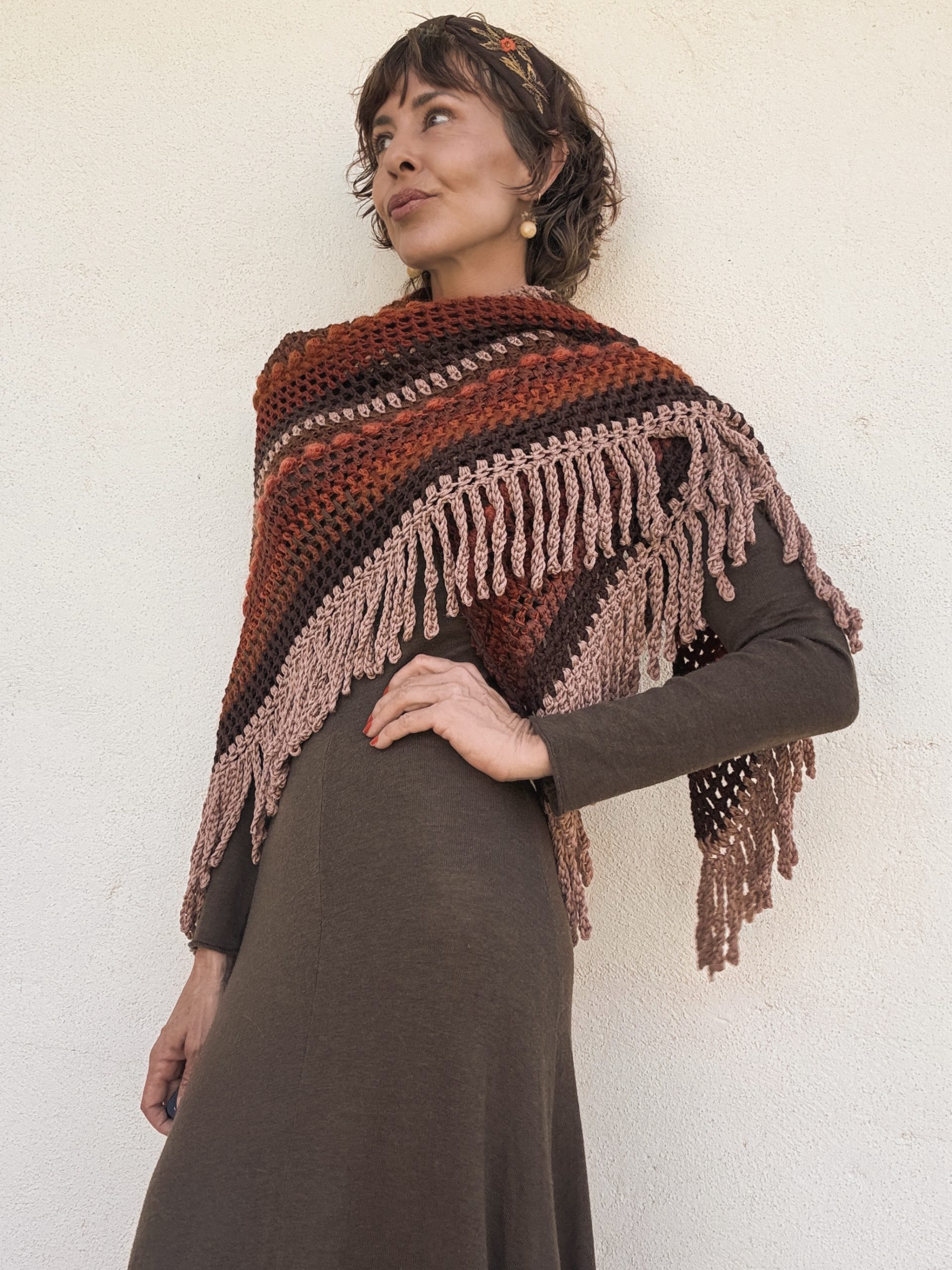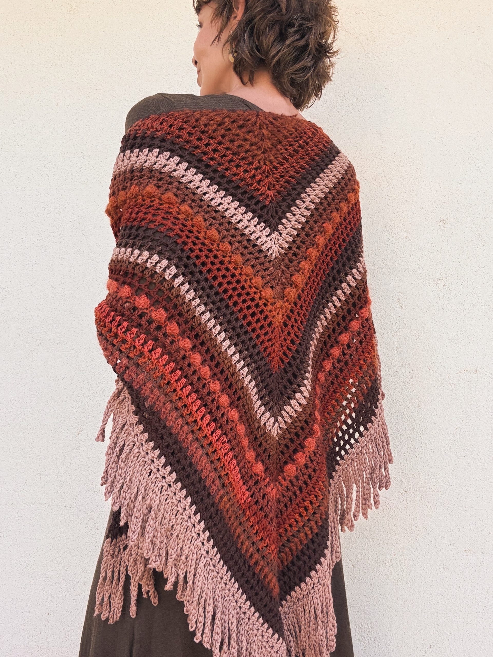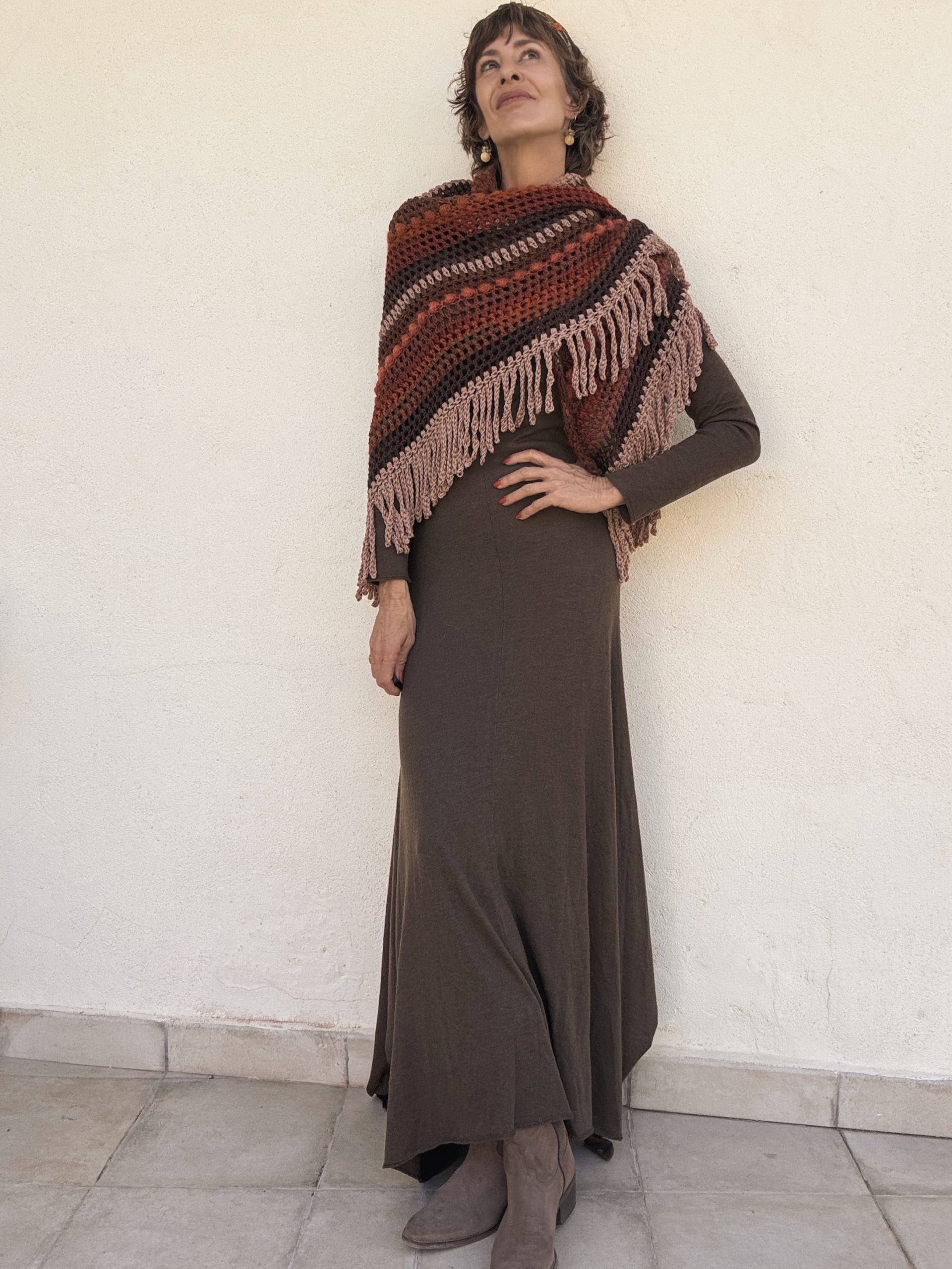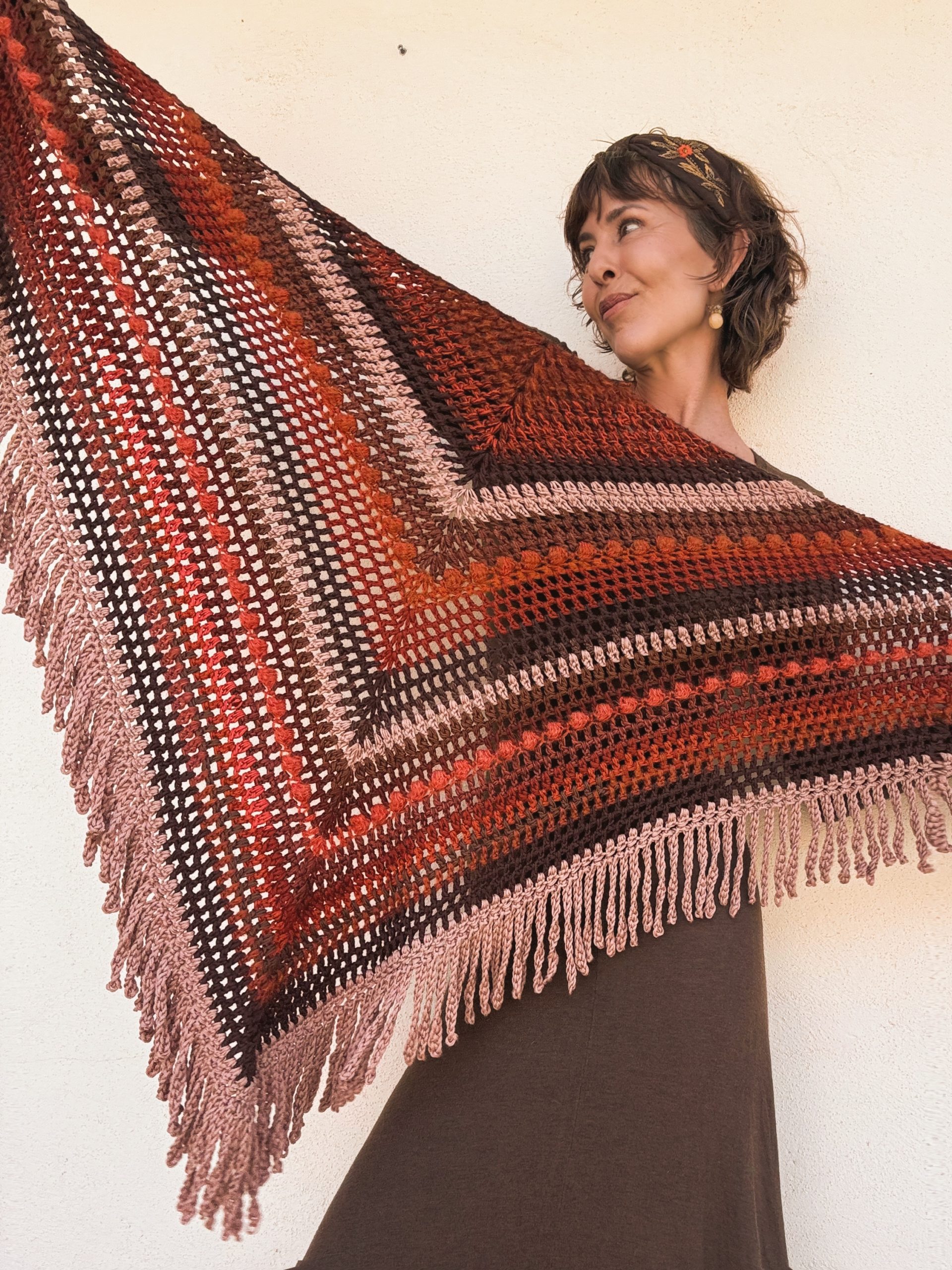 Hand crocheted Merino wool and mohair shawl, with a harmonious blend of warm colors: intense reds, earthy browns and toasted pink. Each stitch combines soft and light textures that add volume and movement. The bangs on the edges complete the piece with a handmade and bohemian touch. A unique garment, enveloping and full of character.