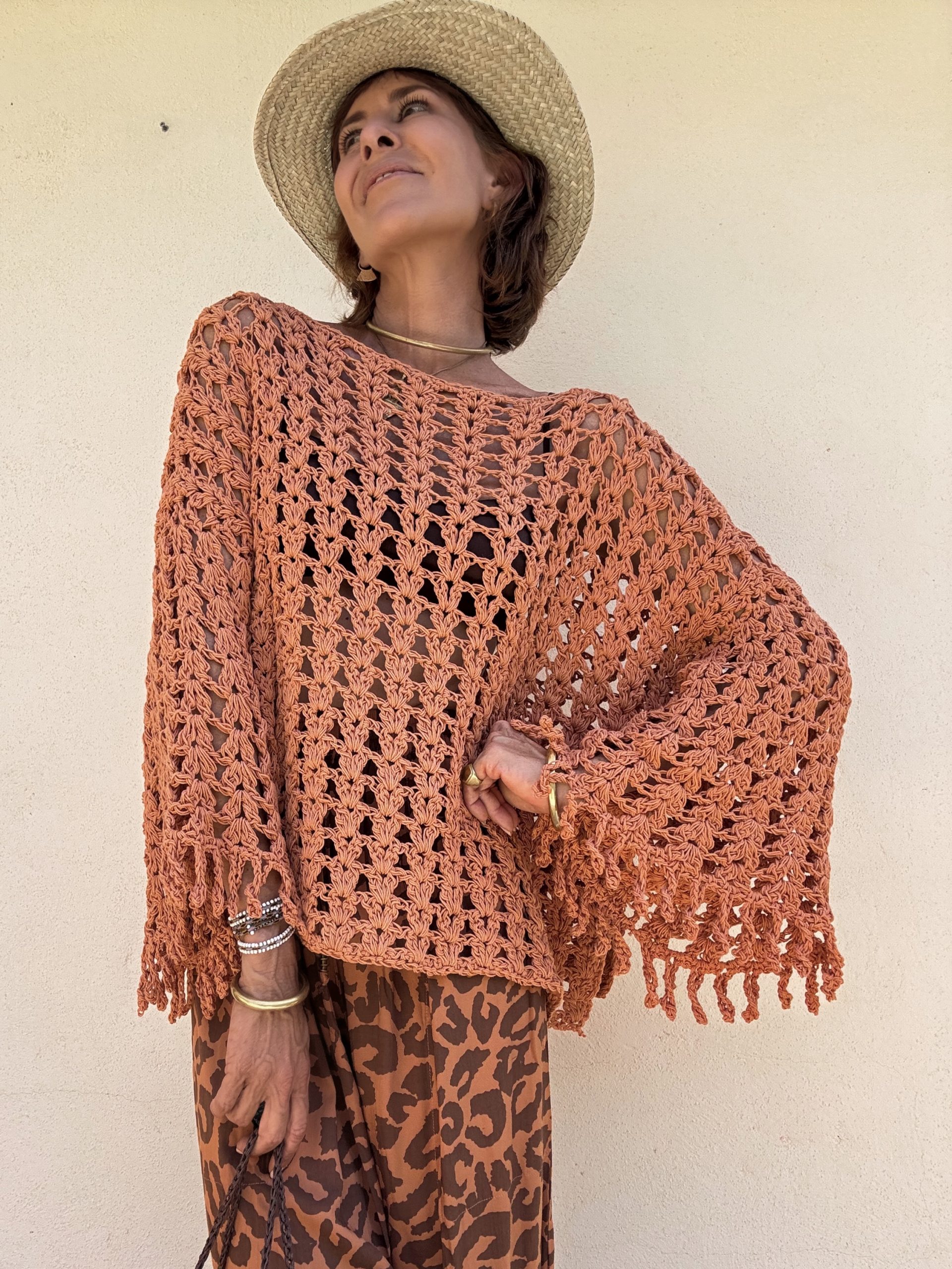 Hand crocheted with natural cotton in a luminous coral tone. One size fits all, with 3/4 sleeves and a delicate fringe finish also crocheted. Its light and handcrafted design makes it an ideal garment for summer evenings or as a stylish overshirt.