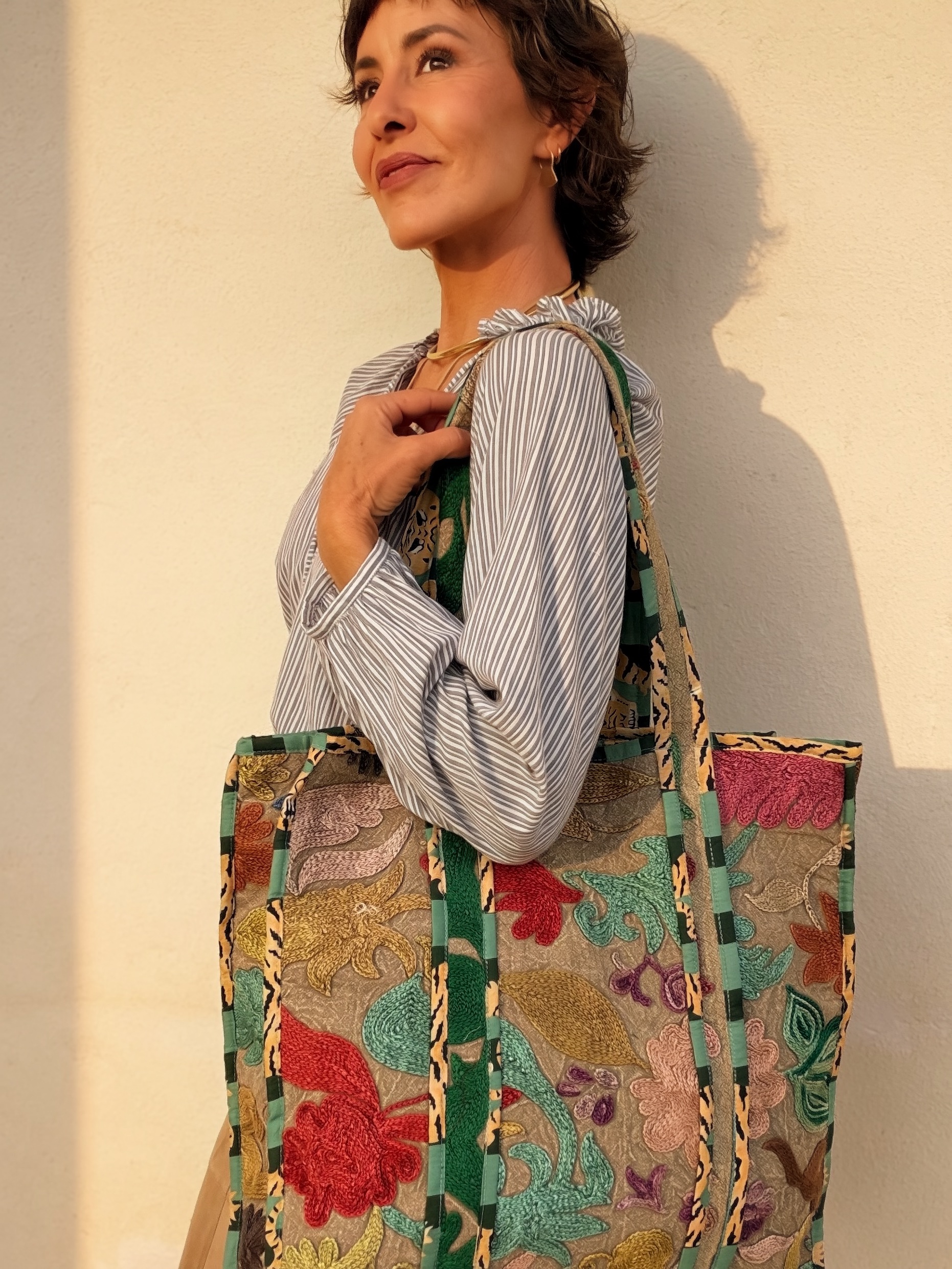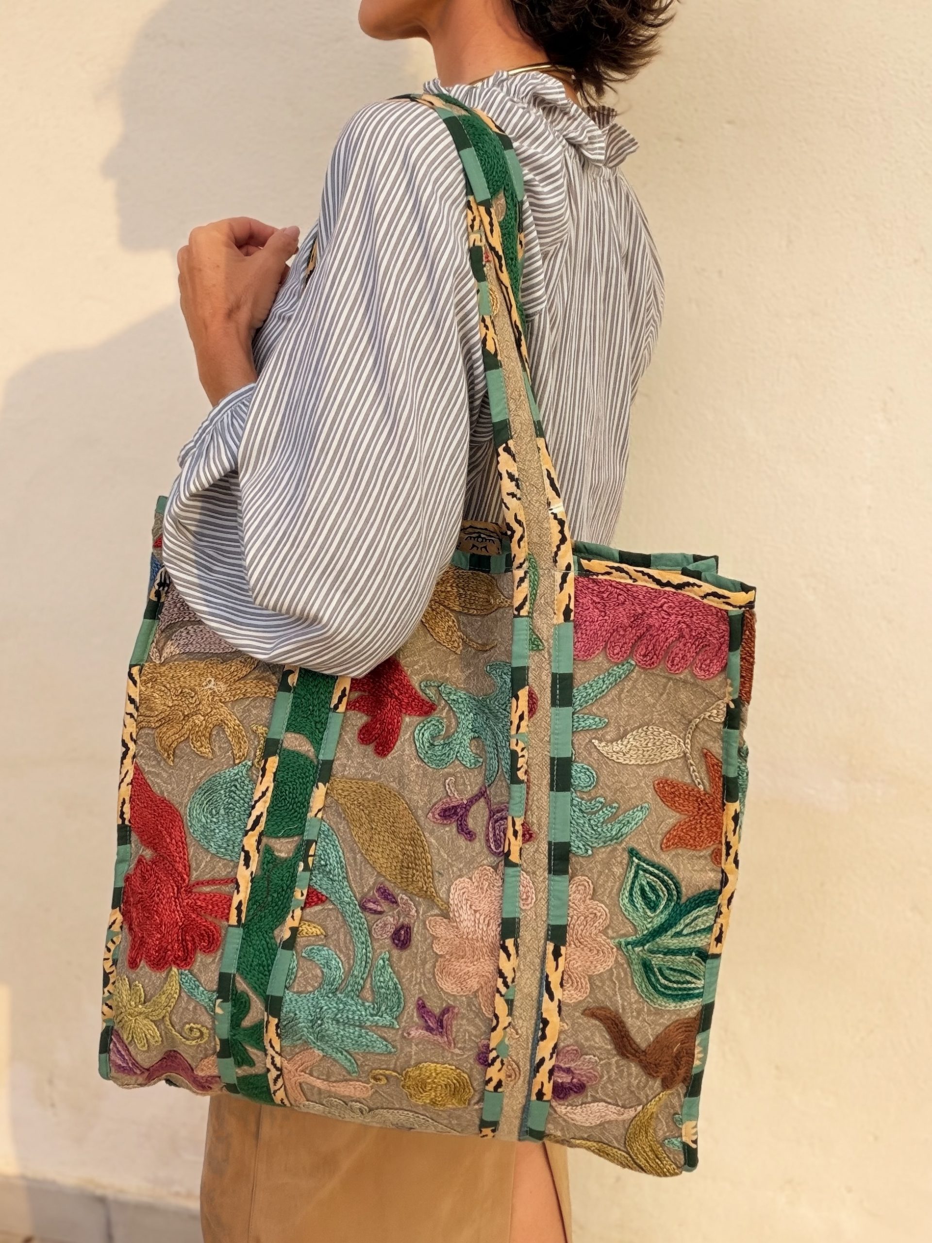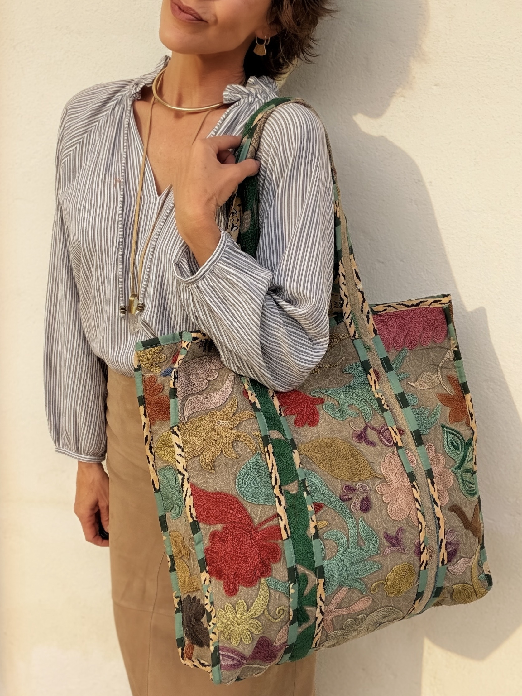 Suzani bag hand embroidered with delicate traditional motifs that make each piece a unique design. Made of cotton fabric and inner lining for durability and practicality.