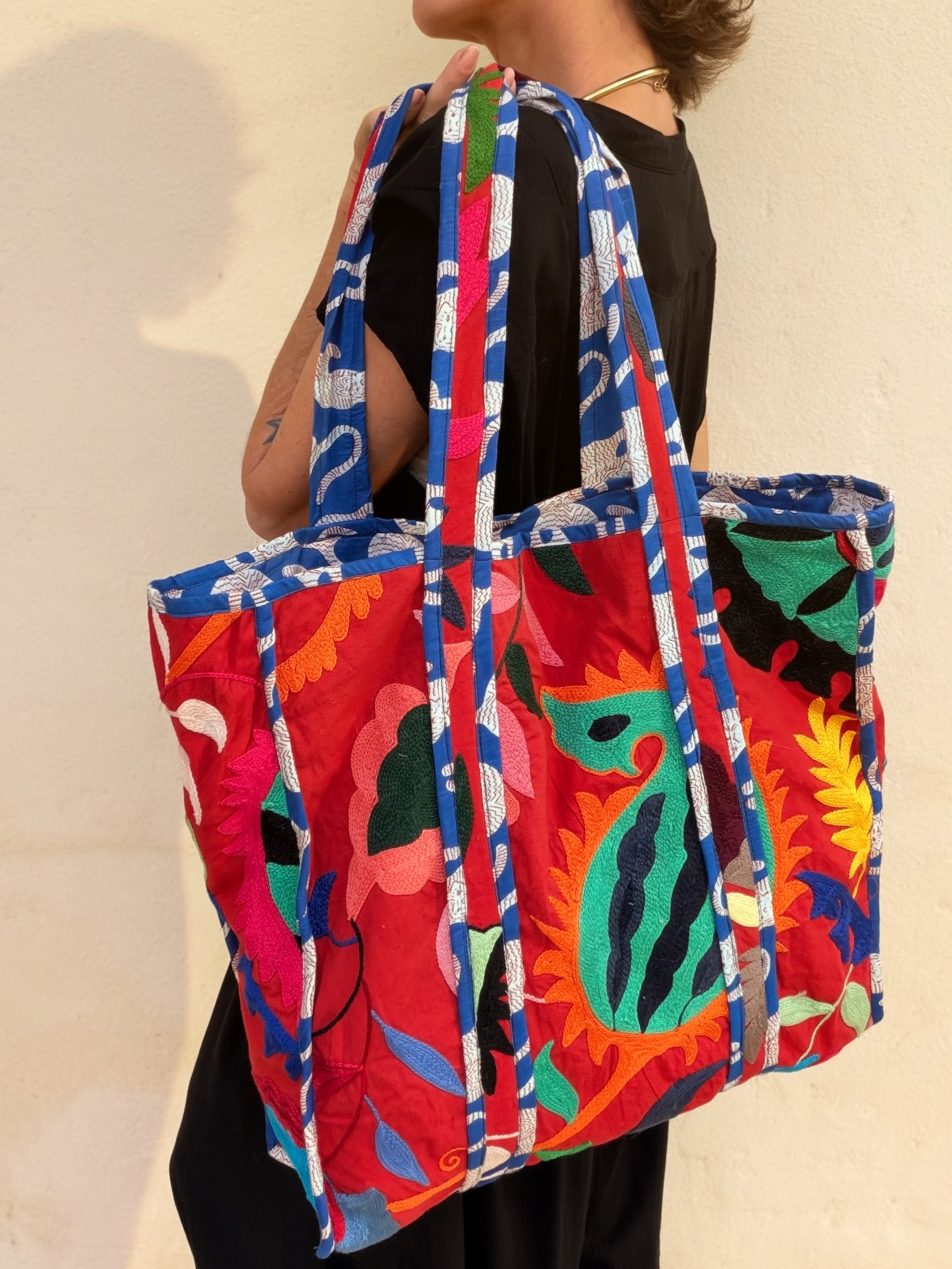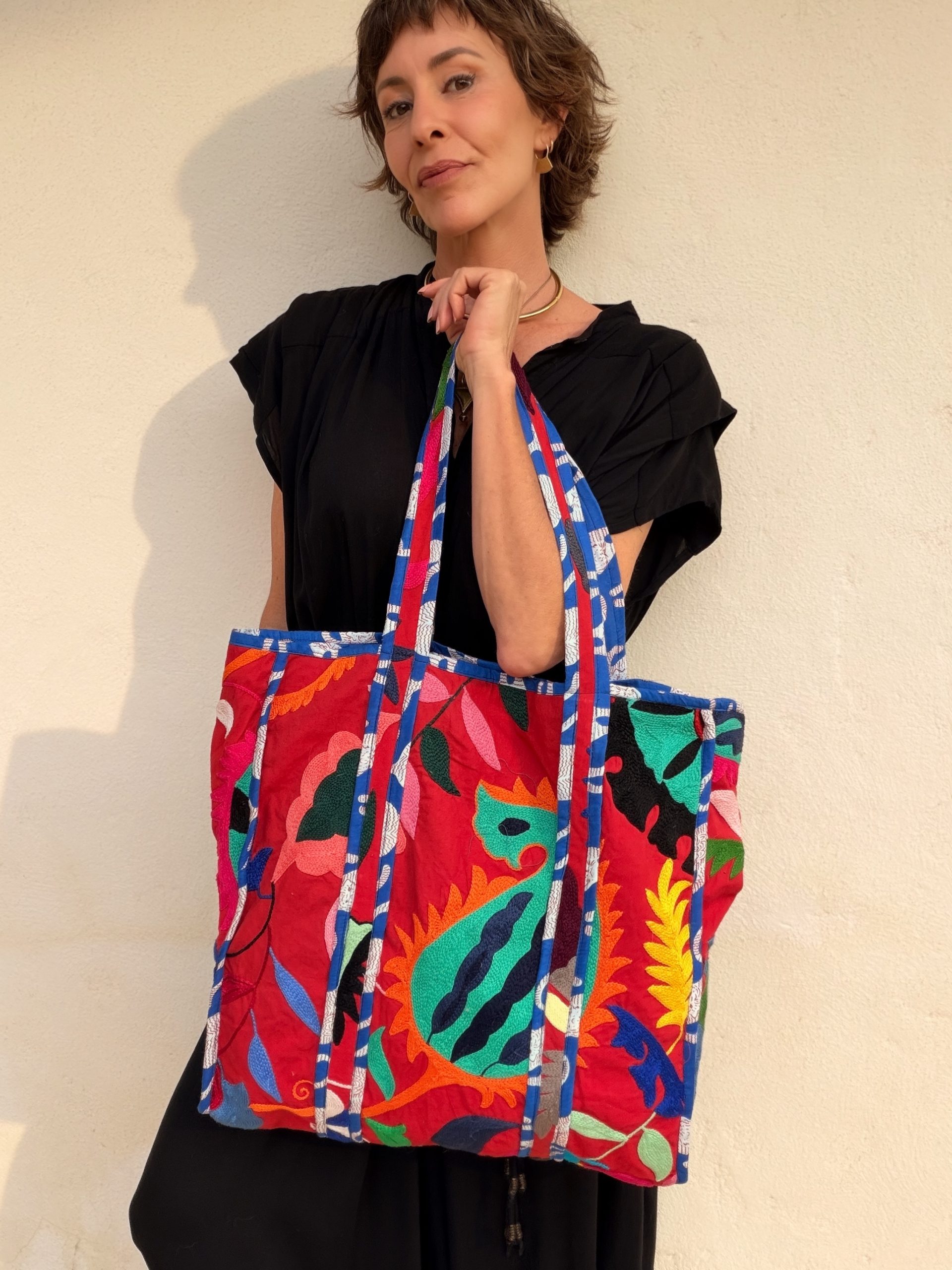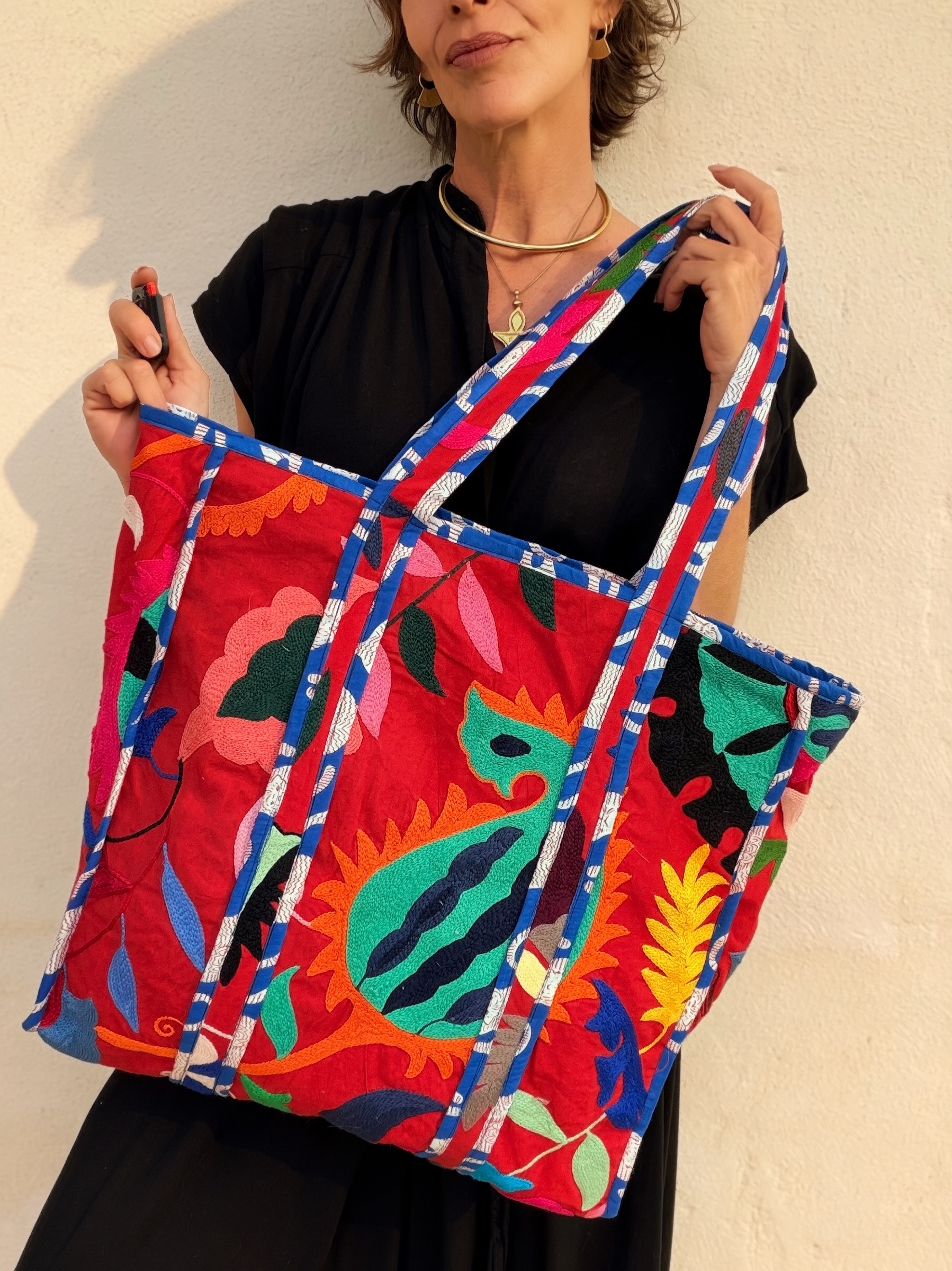 Suzani bag hand embroidered with delicate traditional motifs that make each piece a unique design. Made of cotton fabric and inner lining for durability and practicality.