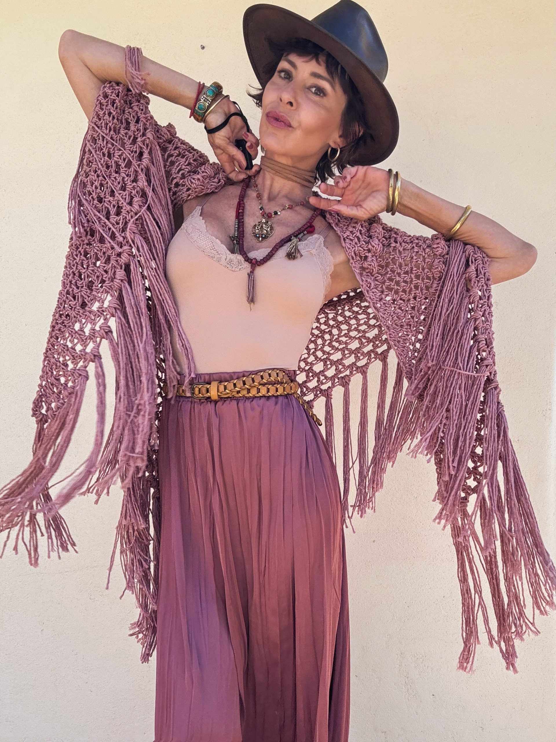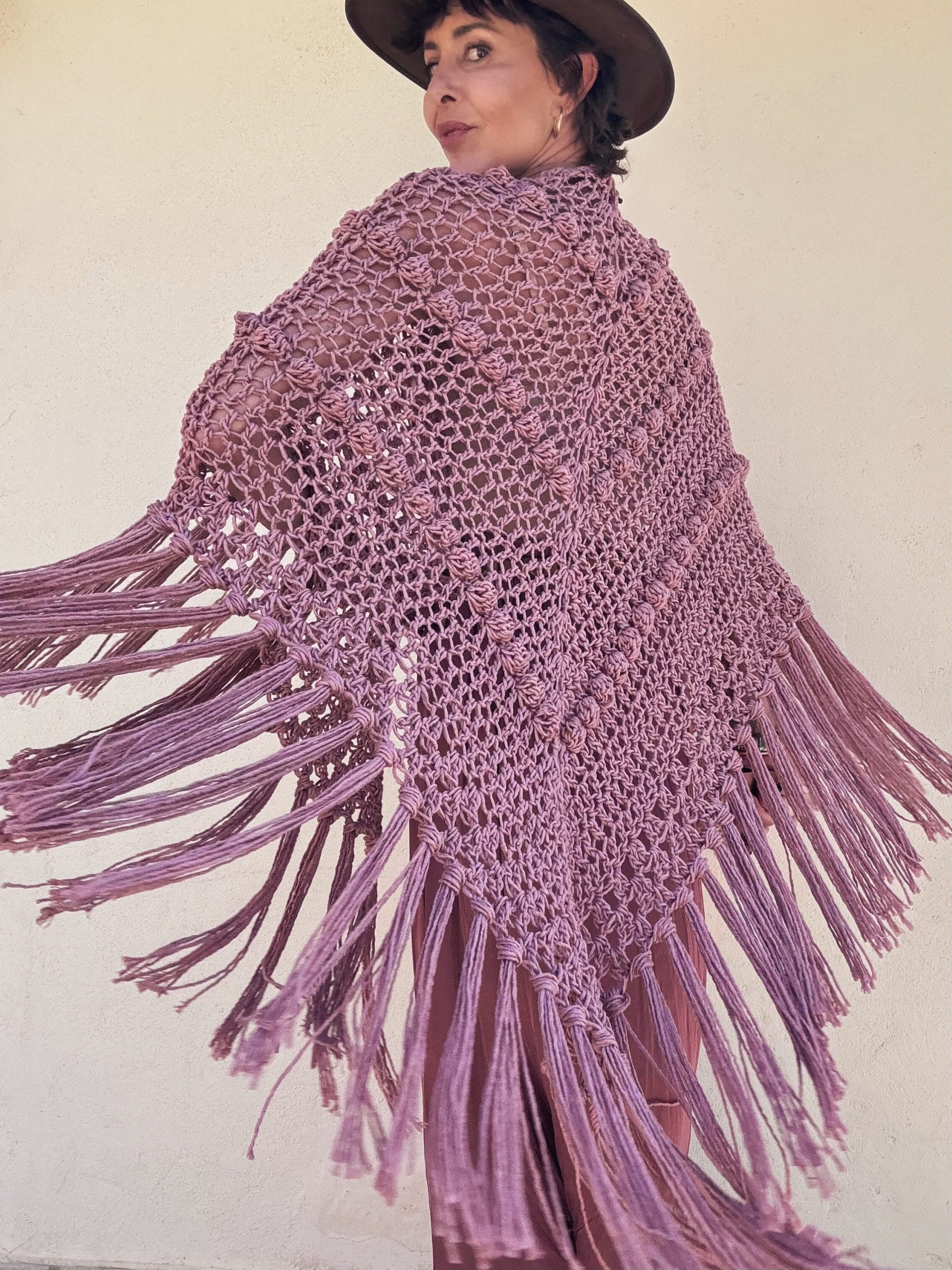 Tejido en punto crochet con hilo de bambú y algodón en varios tonos de coral. El bambú le aporta un brillo satinado q contrasta muy bien con el mate del algodón creando un efecto muy bonito