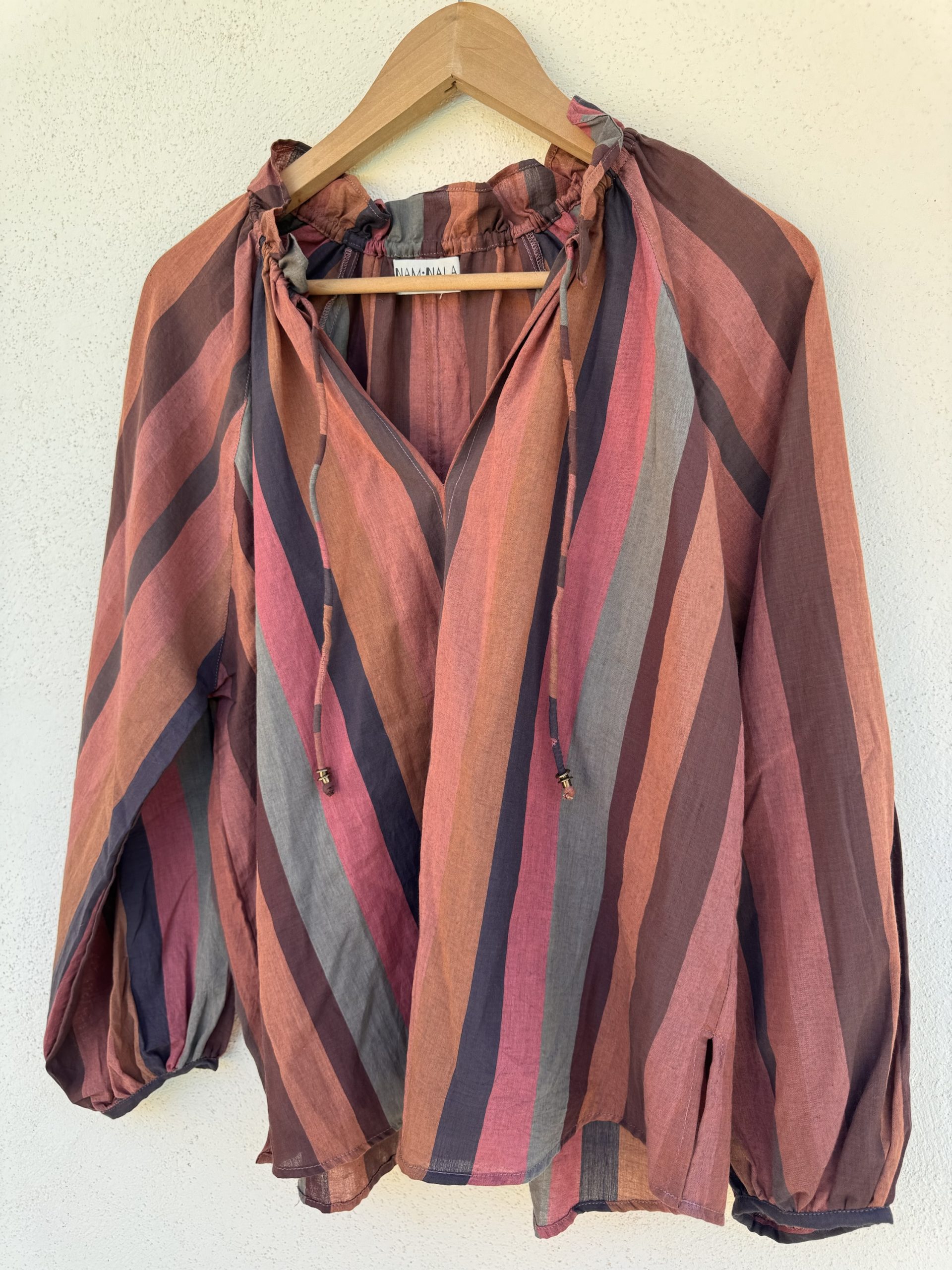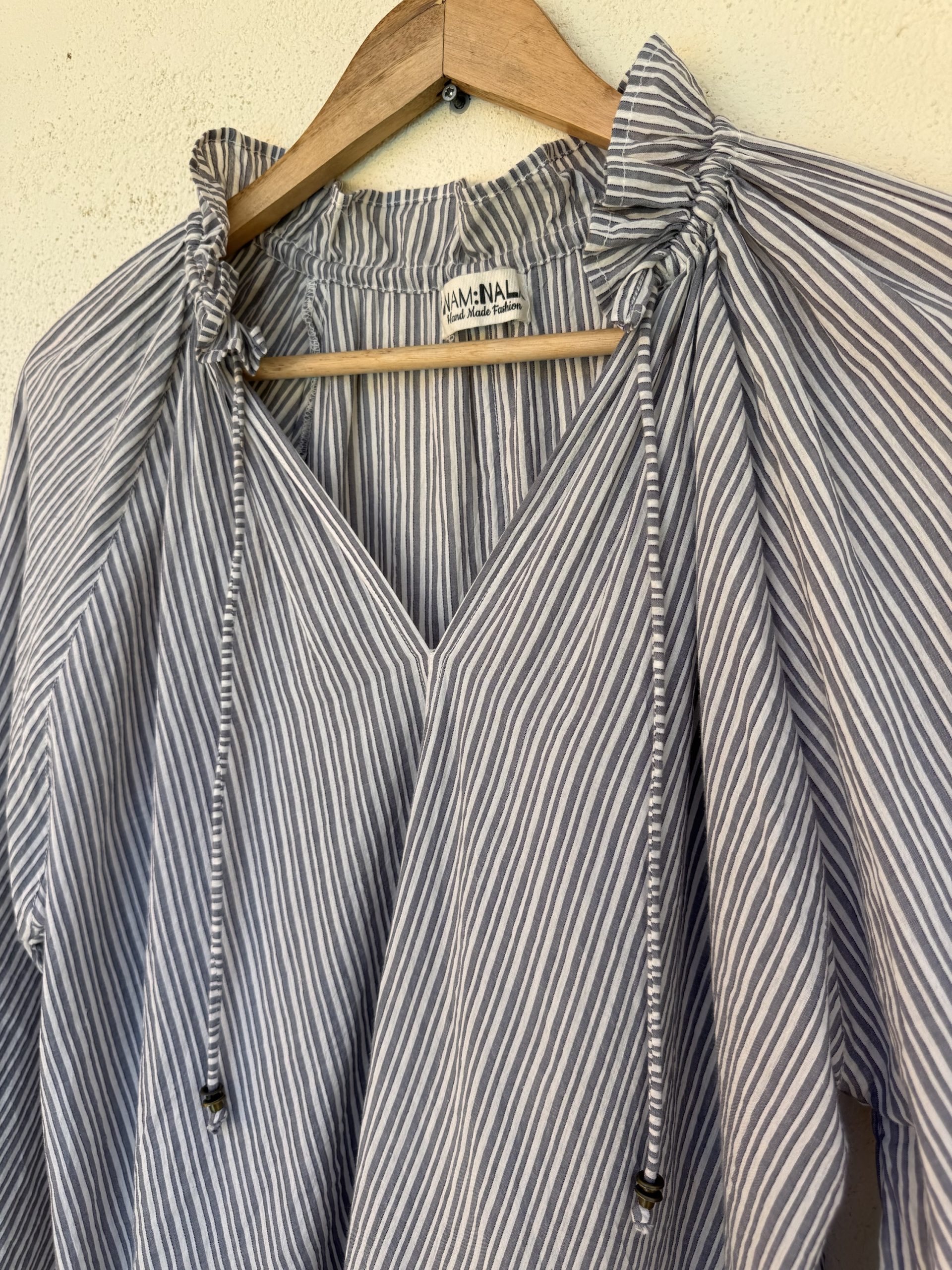 Handloom cotton blouse, naturally dyed with non-toxic dyes. Light and breathable, featuring a gathered neckline with adjustable ties and balloon sleeves that add a touch of bohemian elegance. A versatile one-size piece that comfortably adapts to different styles and body shapes, designed for conscious and natural living.