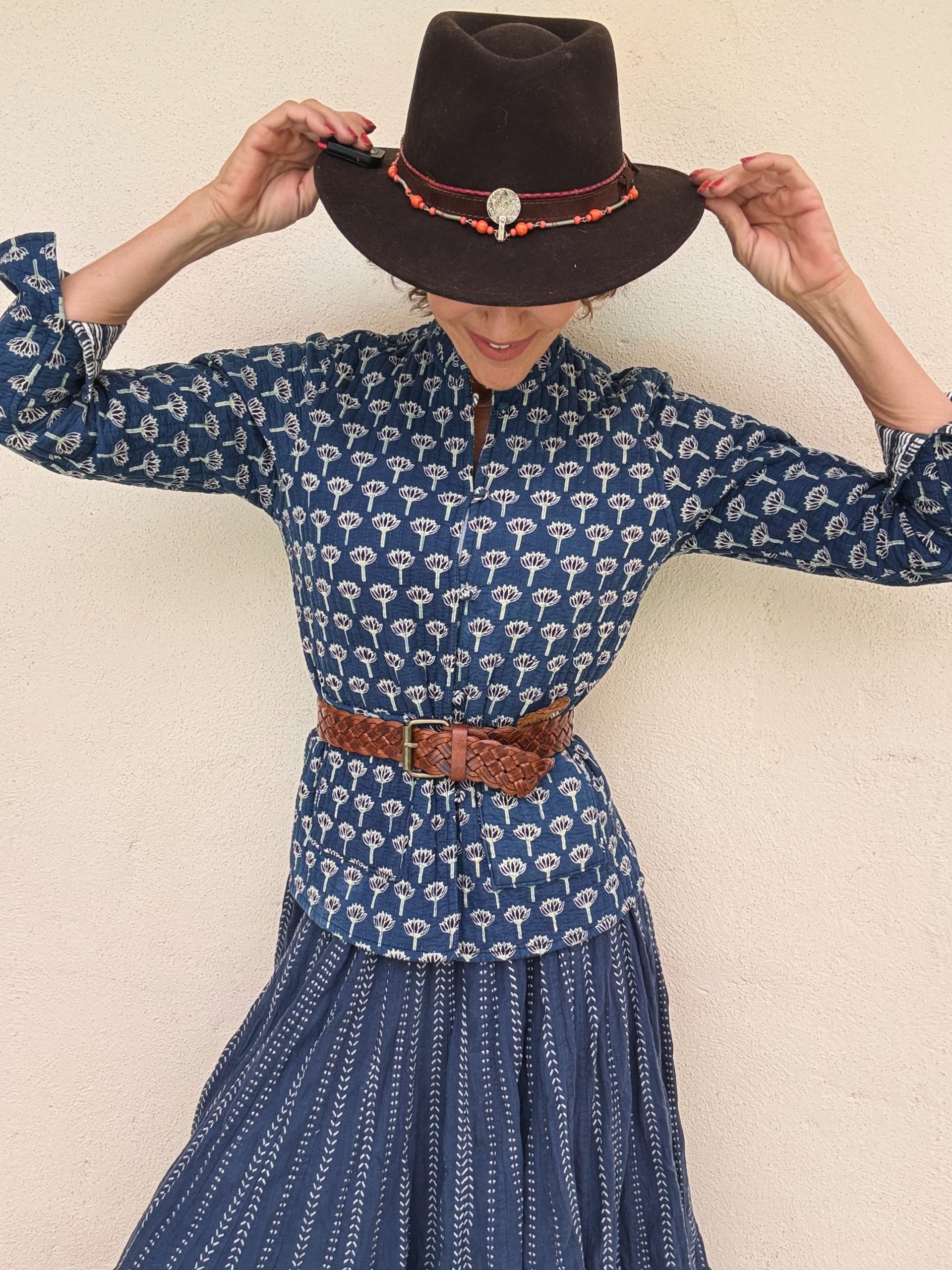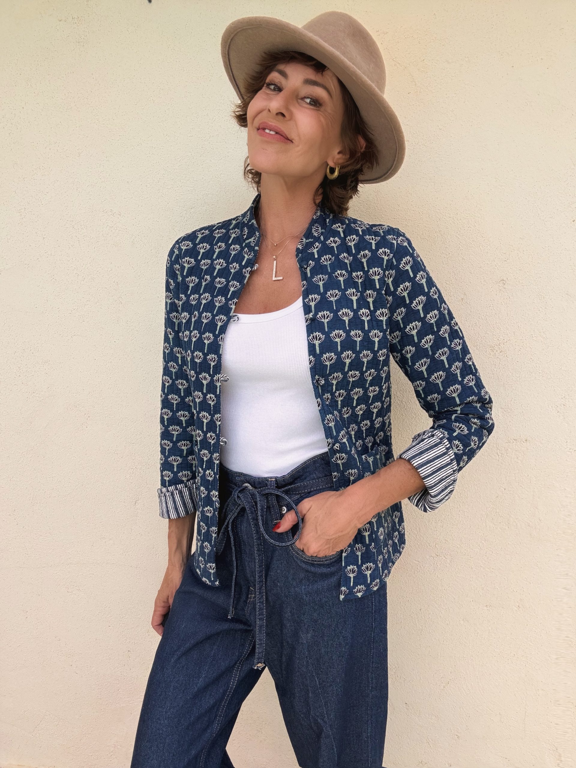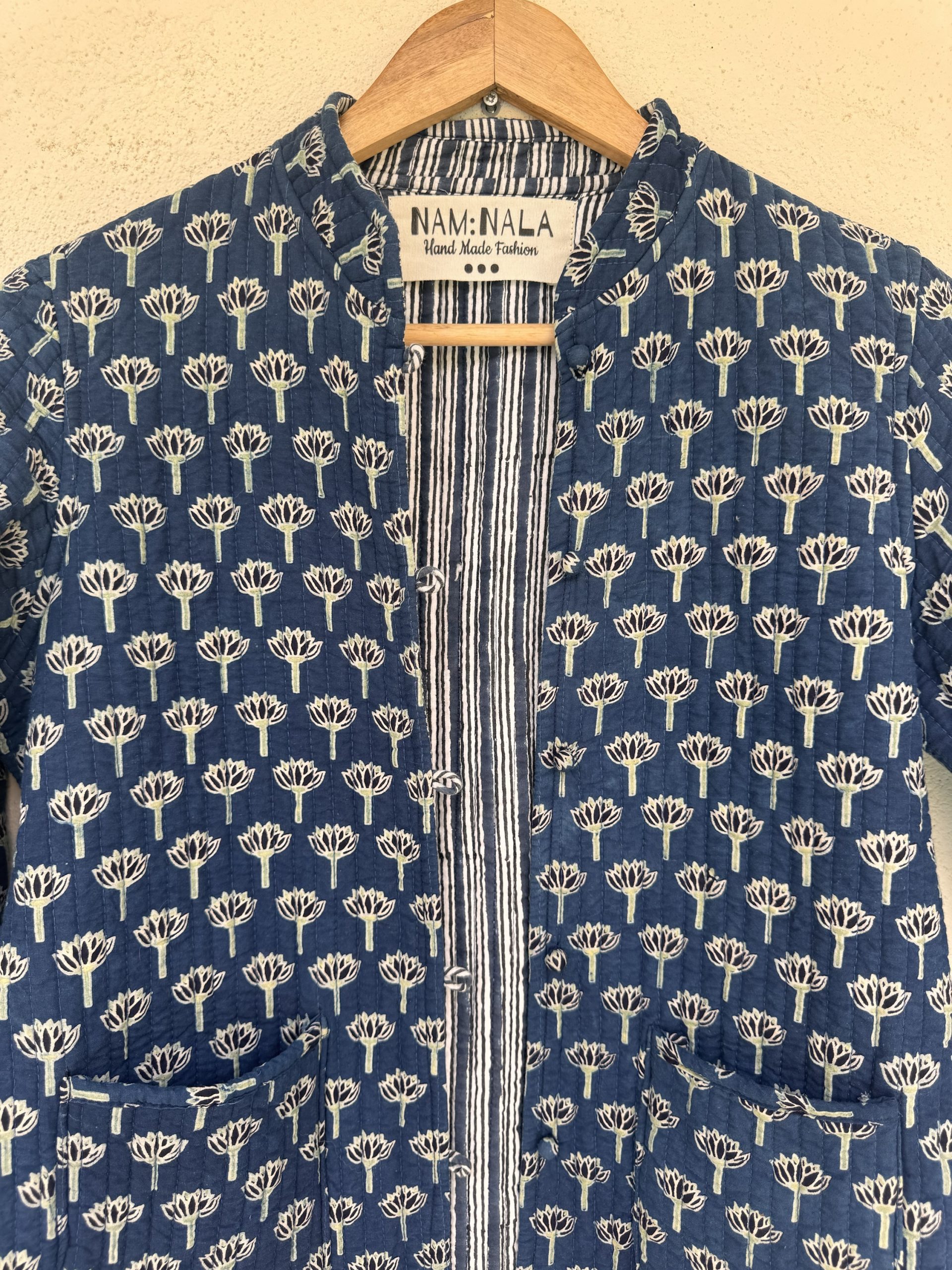 Quilted jacket made with hand made block print fabric in cotton with front pockets. Handcrafted design in blue, perfect for the autumn season. Lightweight and versatile, it can be styled with a belt or worn loose.