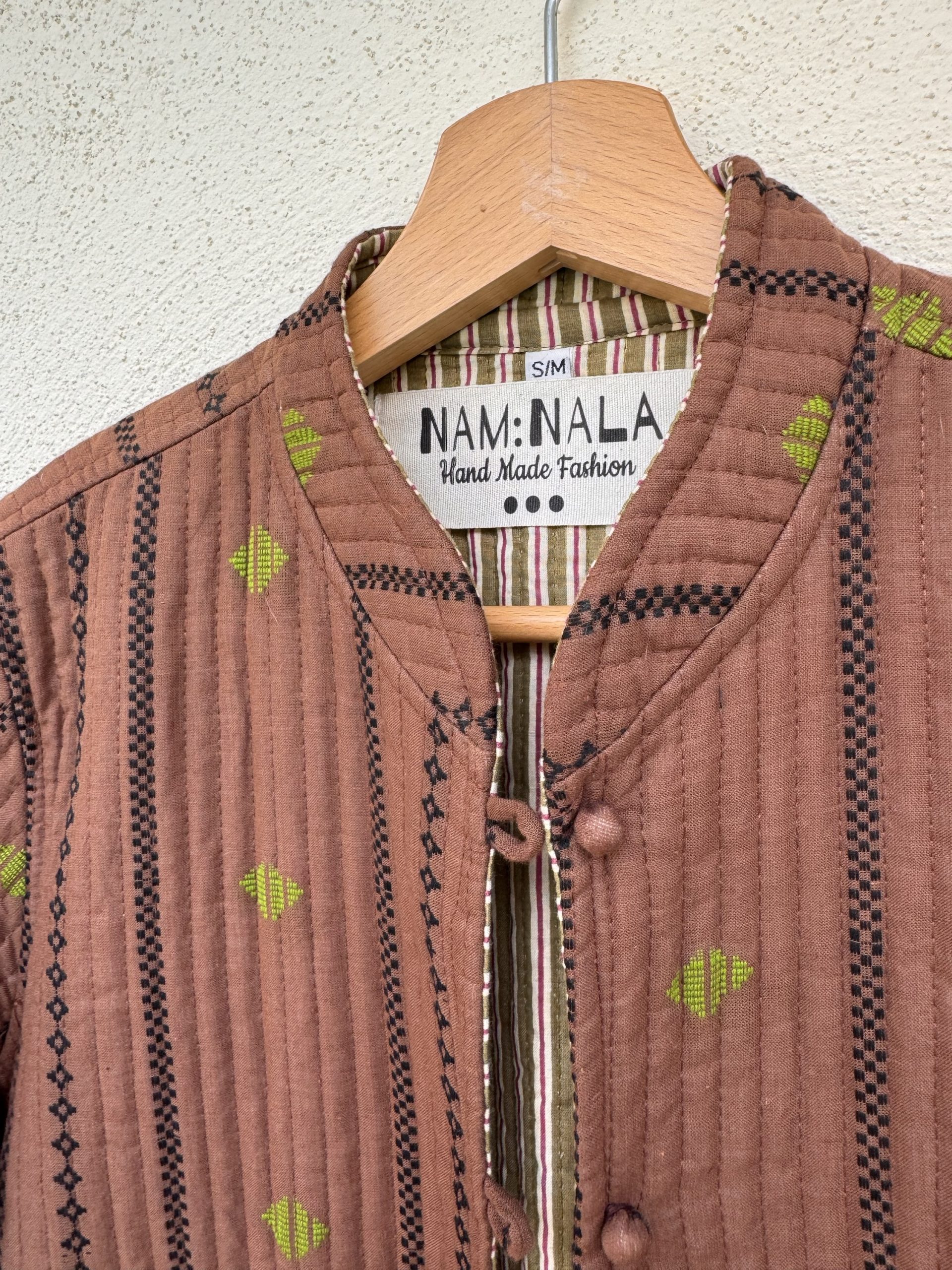 Quilted jacket made from hand loom fabric in cotton with front pockets. Handcrafted design in dark tones with geometric details, perfect for the autumn season. Lightweight and versatile, it can be styled with a belt or worn loose.