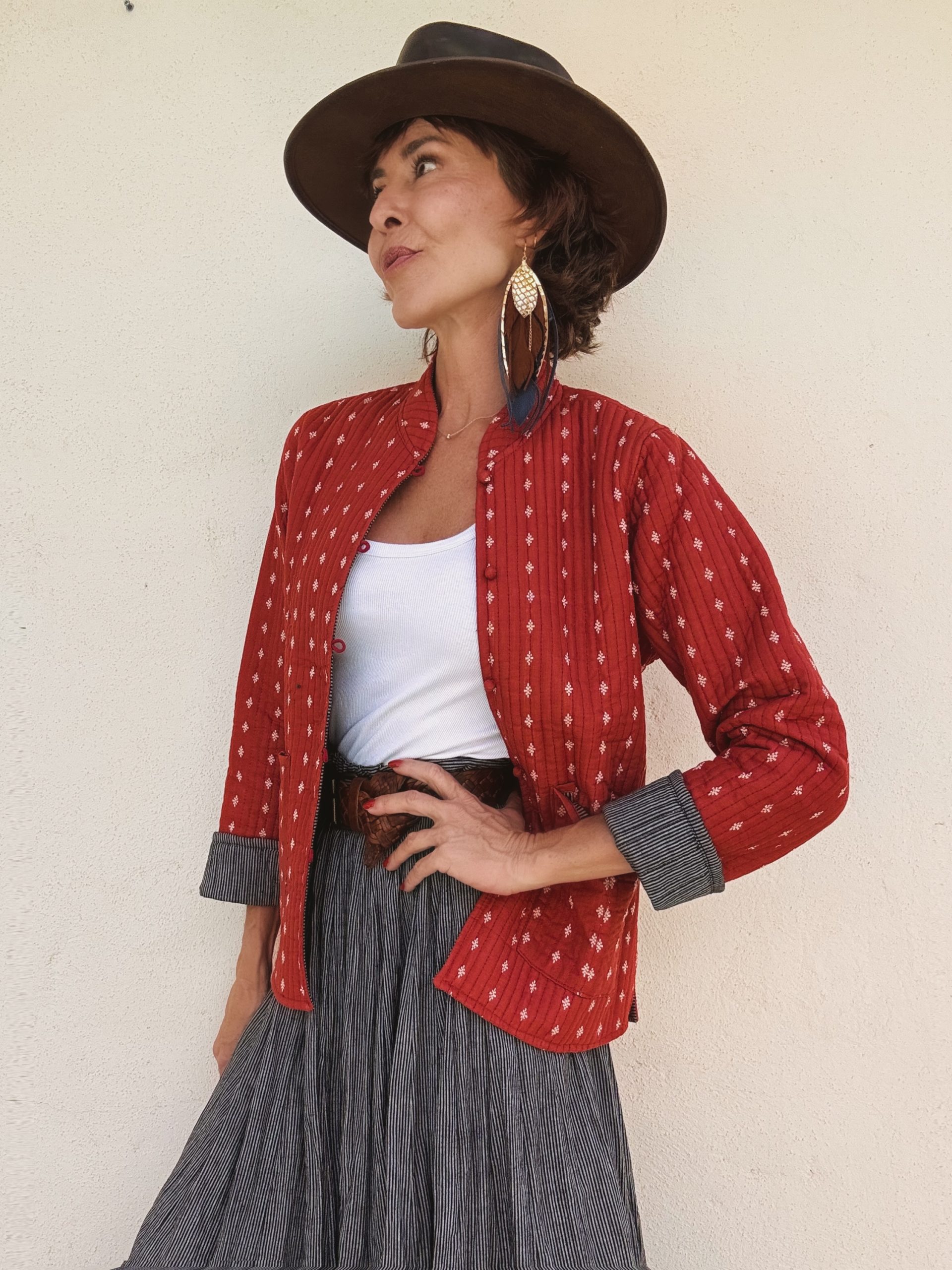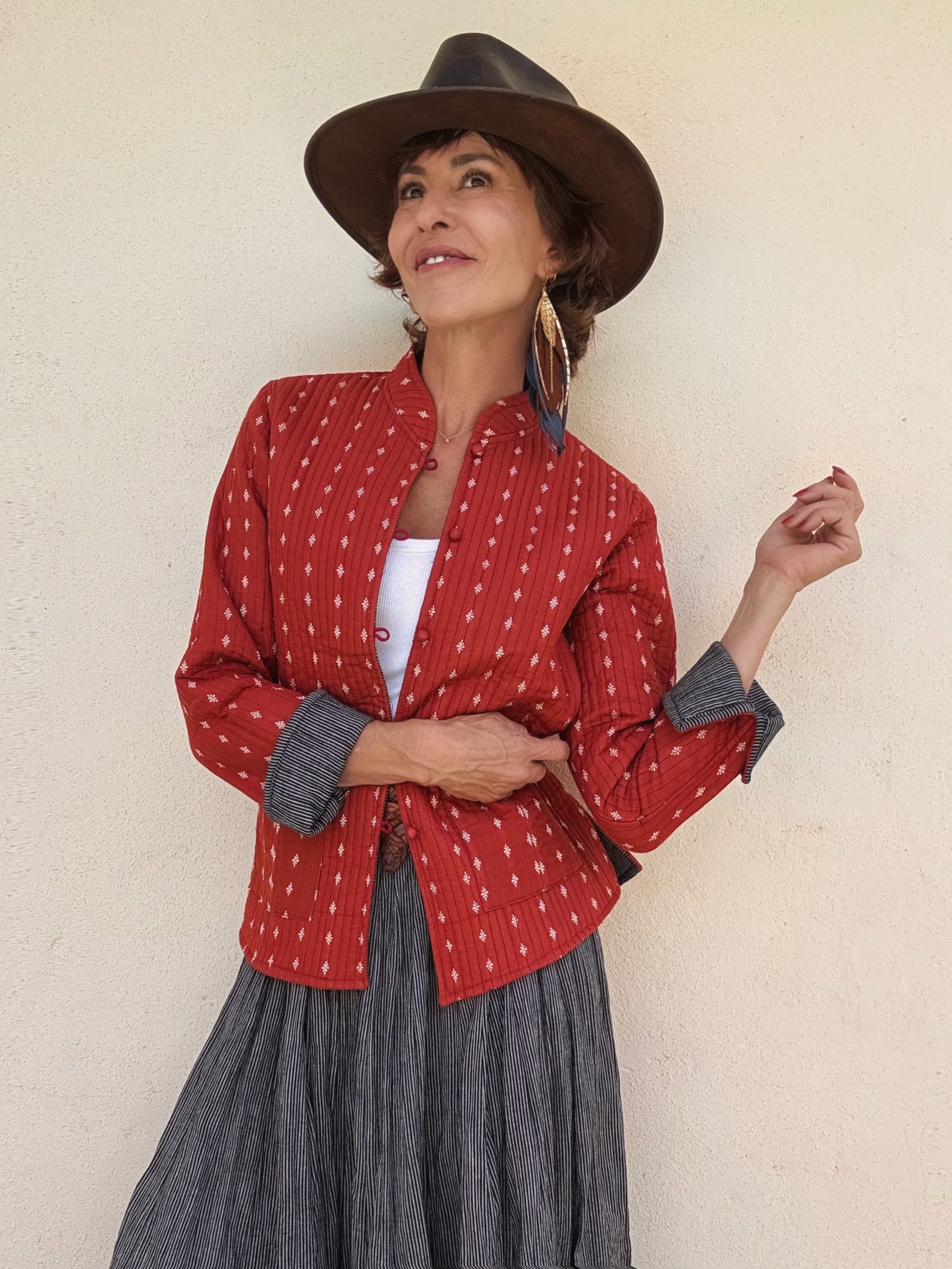Quilted jacket made from hand loom fabric in cotton with front pockets. Handcrafted design in red with geometric details, perfect for the autumn season. Lightweight and versatile, it can be styled with a belt or worn loose.