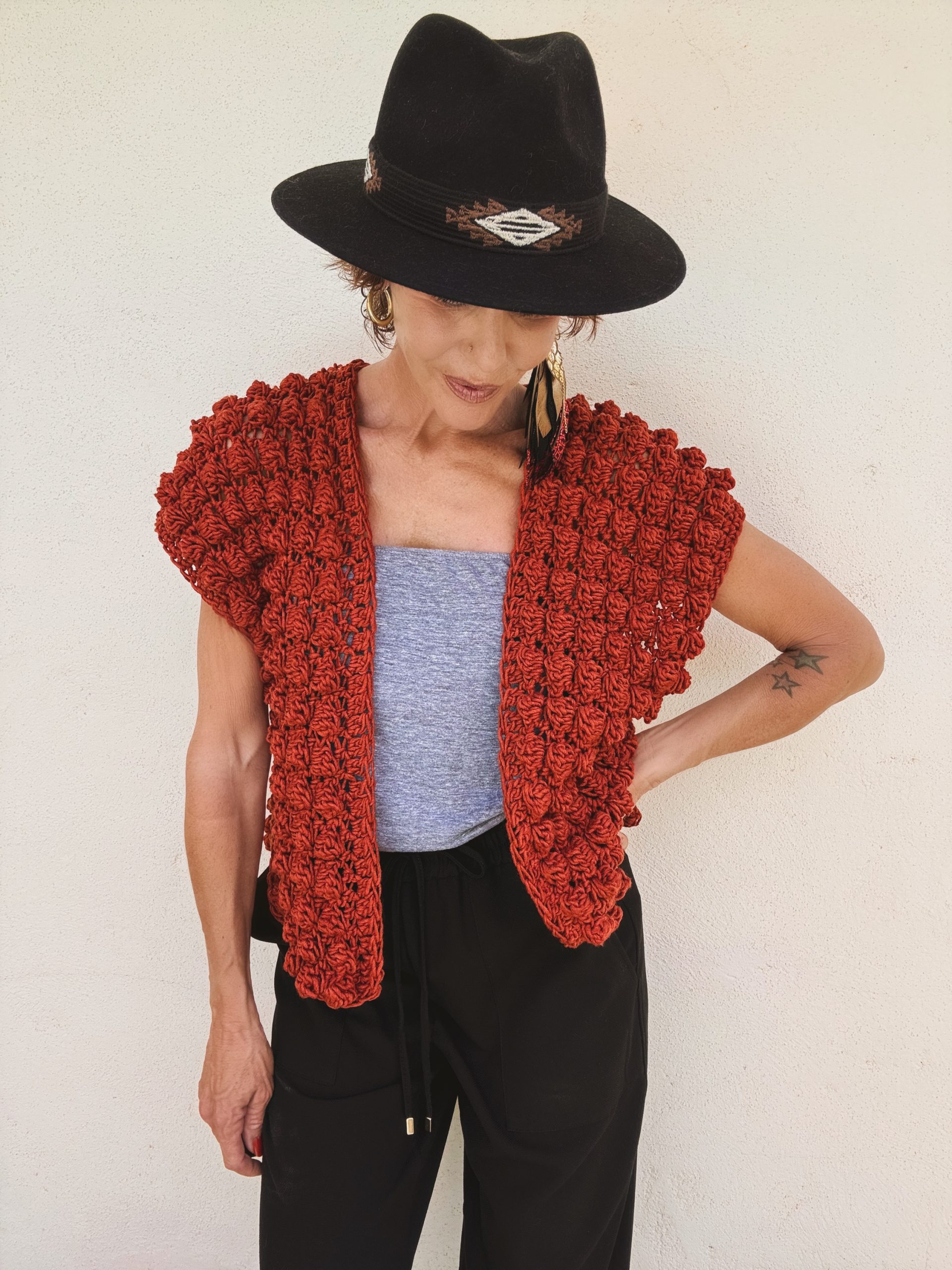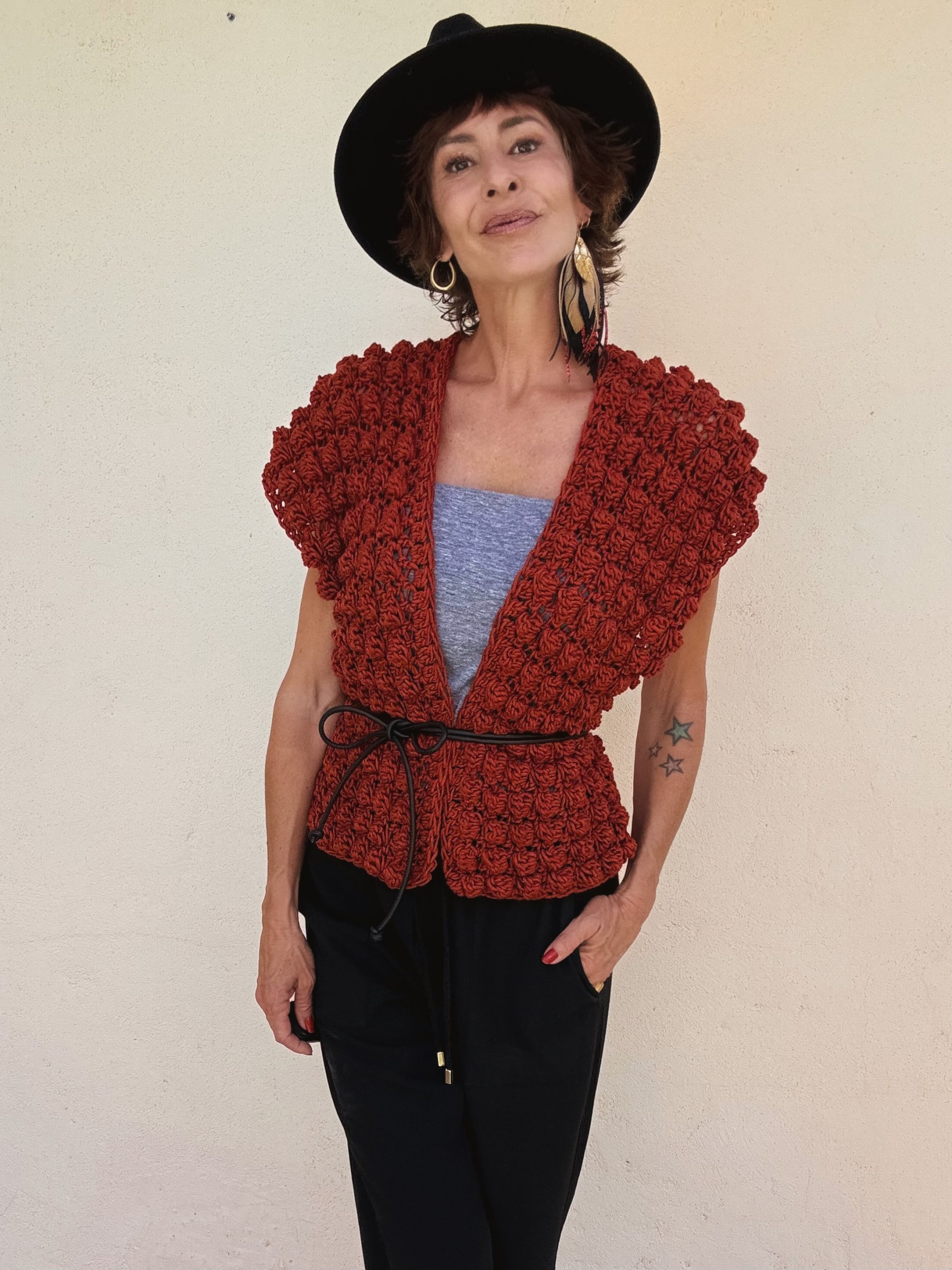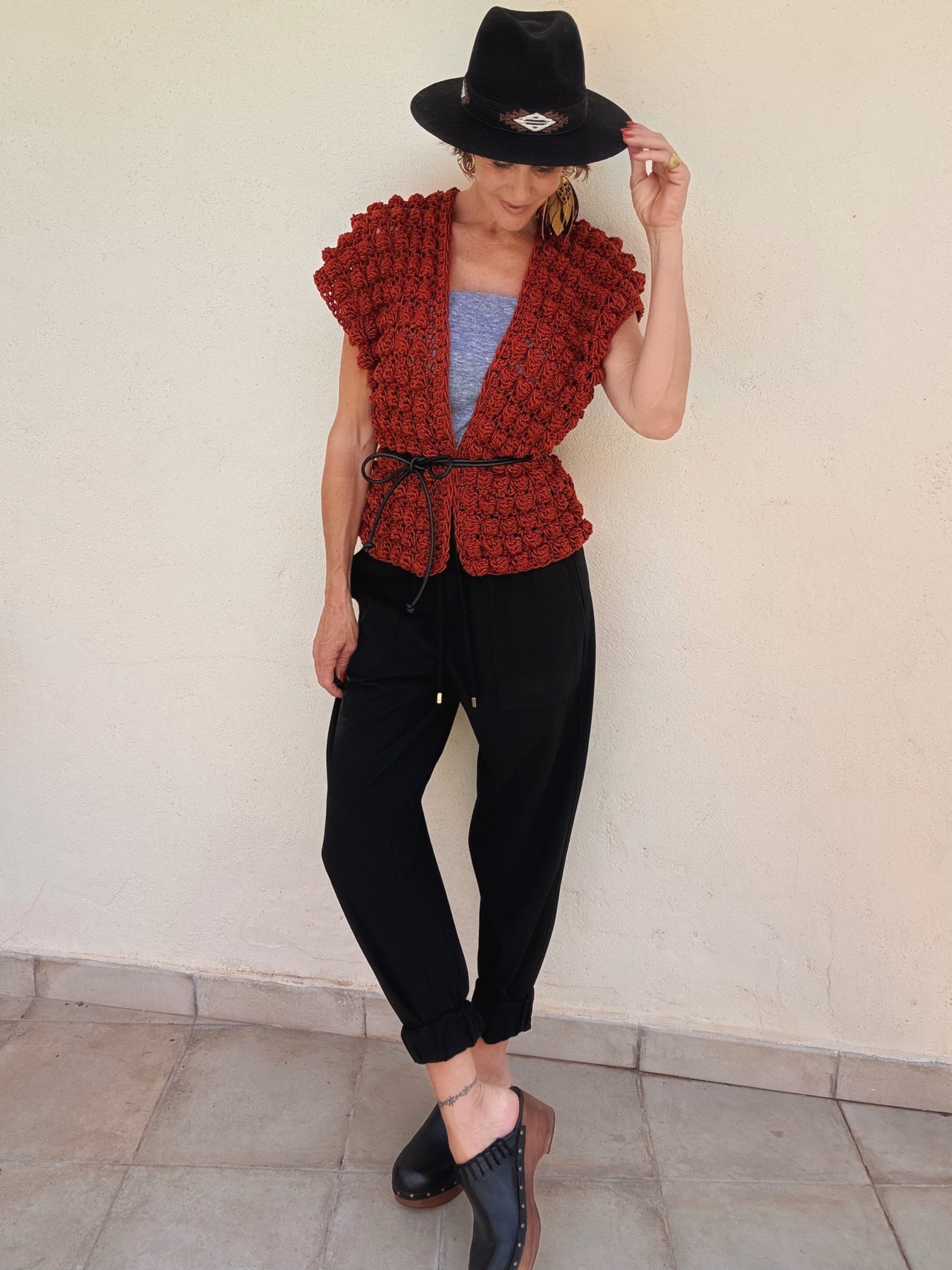 Handmade crochet vest crafted with vegan wool in a brick red color. An artisanal piece with a unique textured pattern, light and versatile, perfect to wear over t-shirts, dresses, or blouses. Its open design and raised stitch details give it a bohemian and natural feel, ideal for everyday wear or to add a special touch to your mid-season outfits. One size fits all