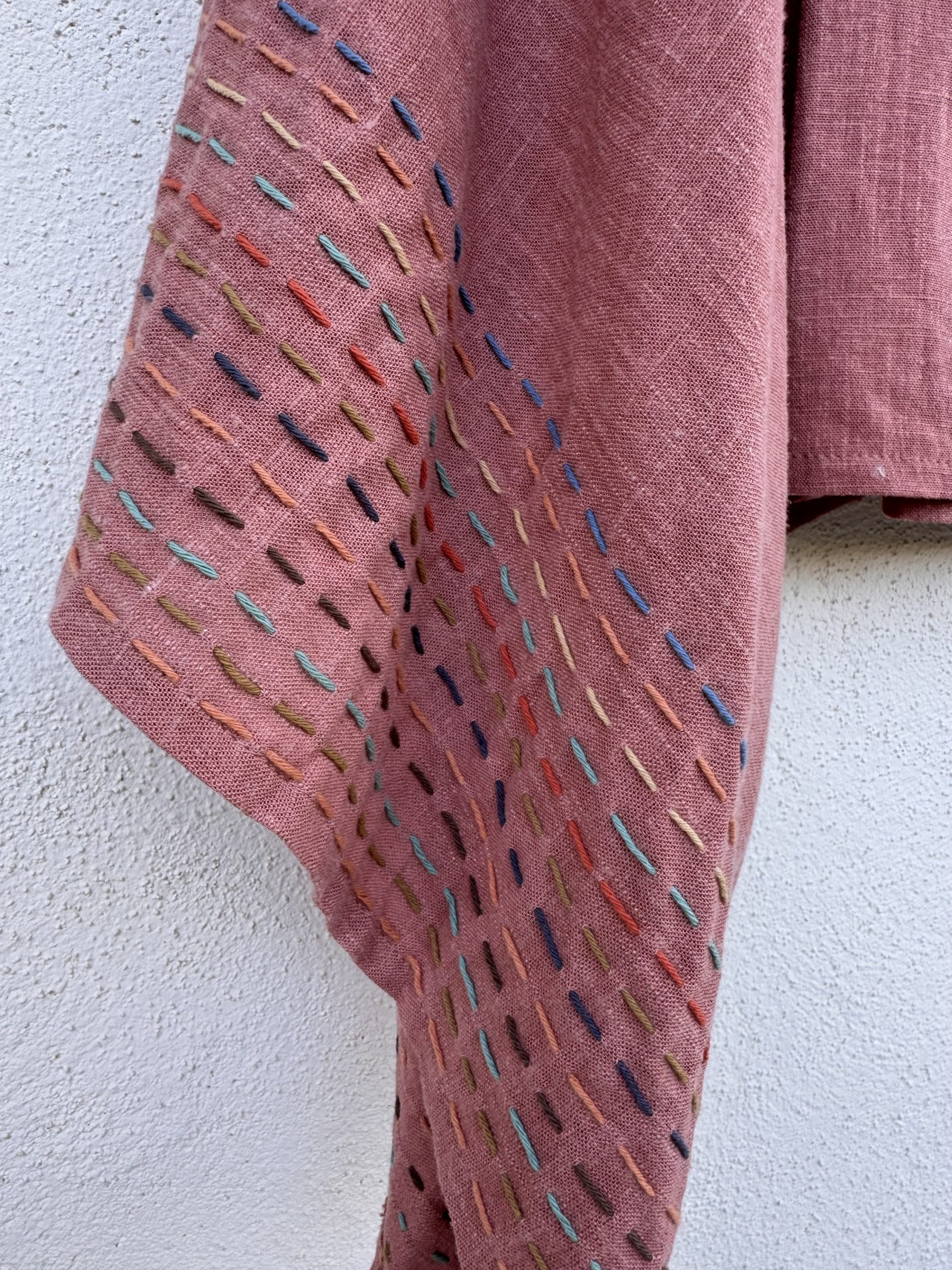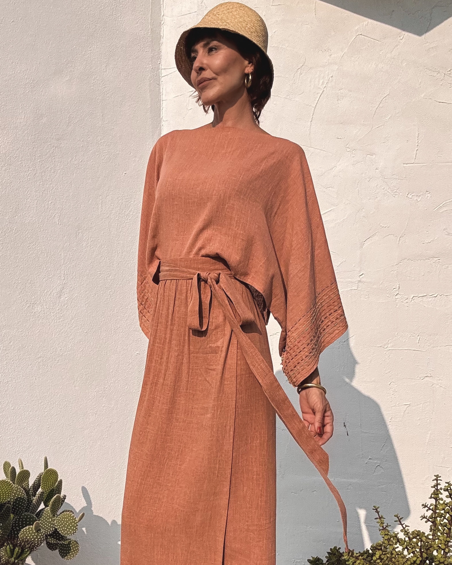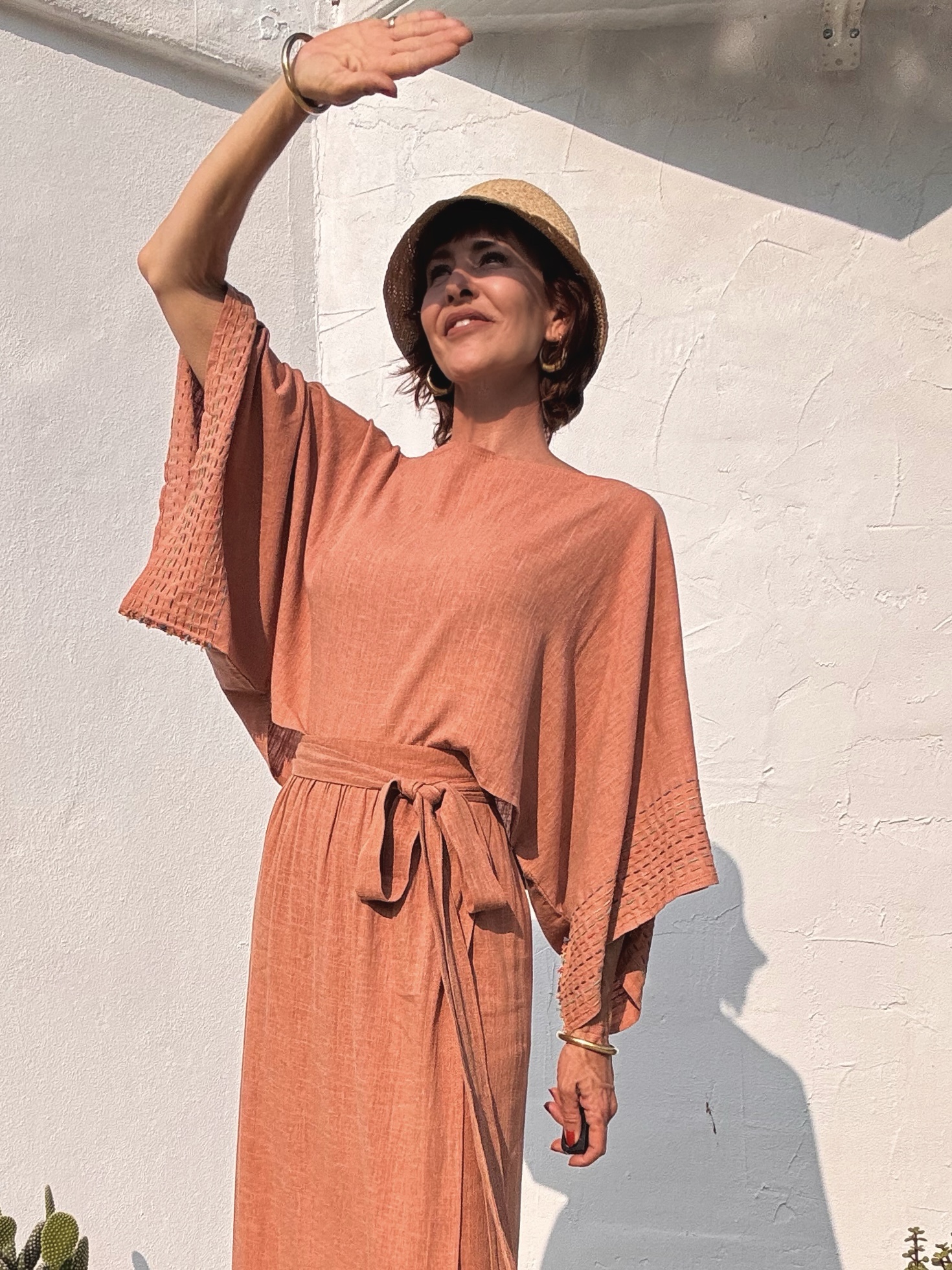 Top made from washed coral-colored linen, featuring a soft drape and wide sleeves adorned with delicate contrast stitching. A light, timeless piece with a handcrafted soul. One size fits all.