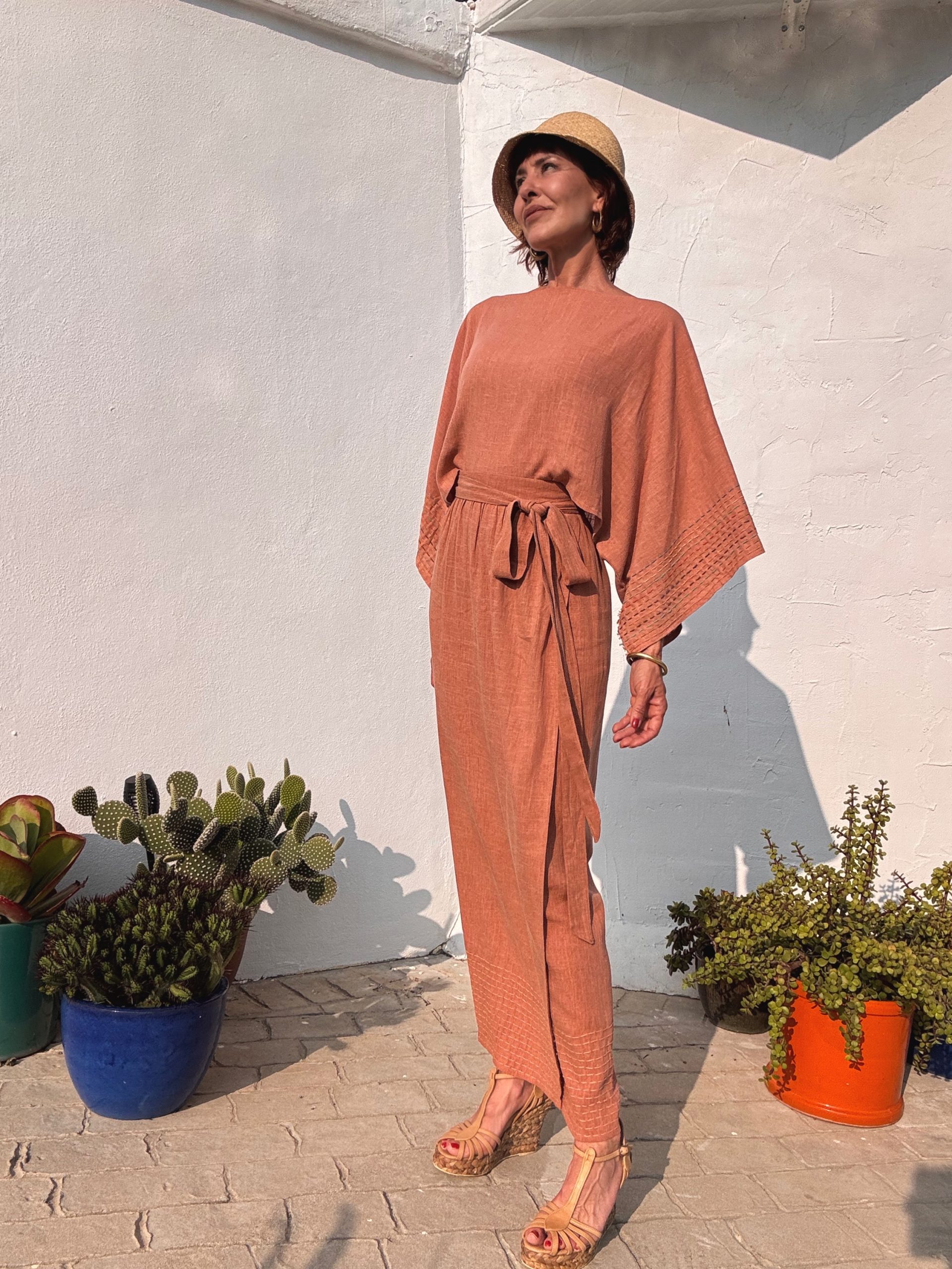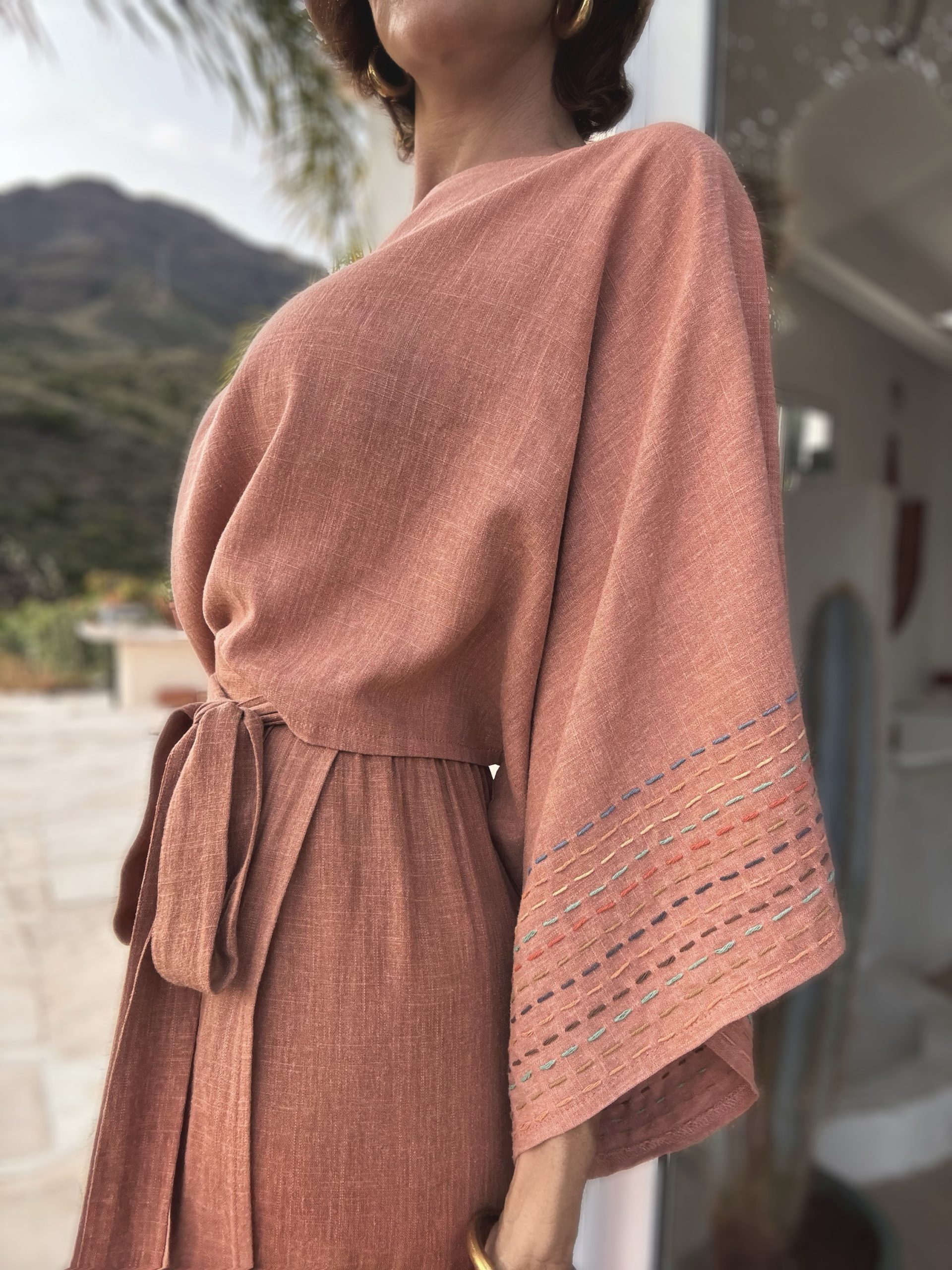 Top confeccionado en lino lavado color coral, con caída fluida y mangas amplias decoradas con delicados pespuntes en contraste. Una pieza ligera, atemporal y de espíritu artesanal. Talla única. Hecho con calma, pensado para durar.