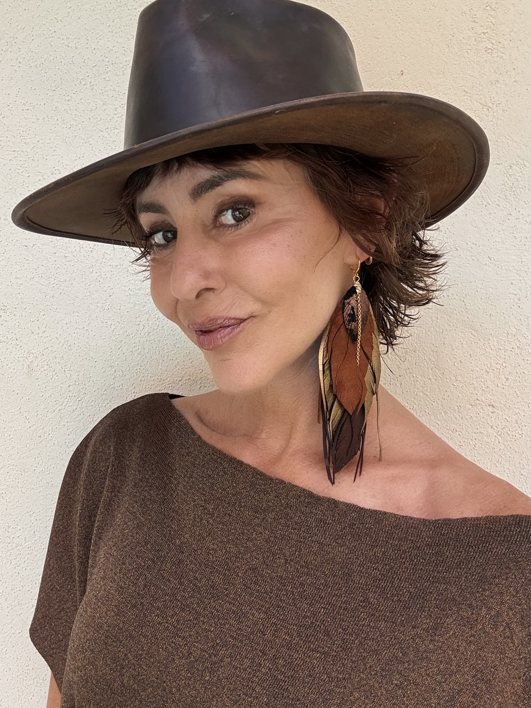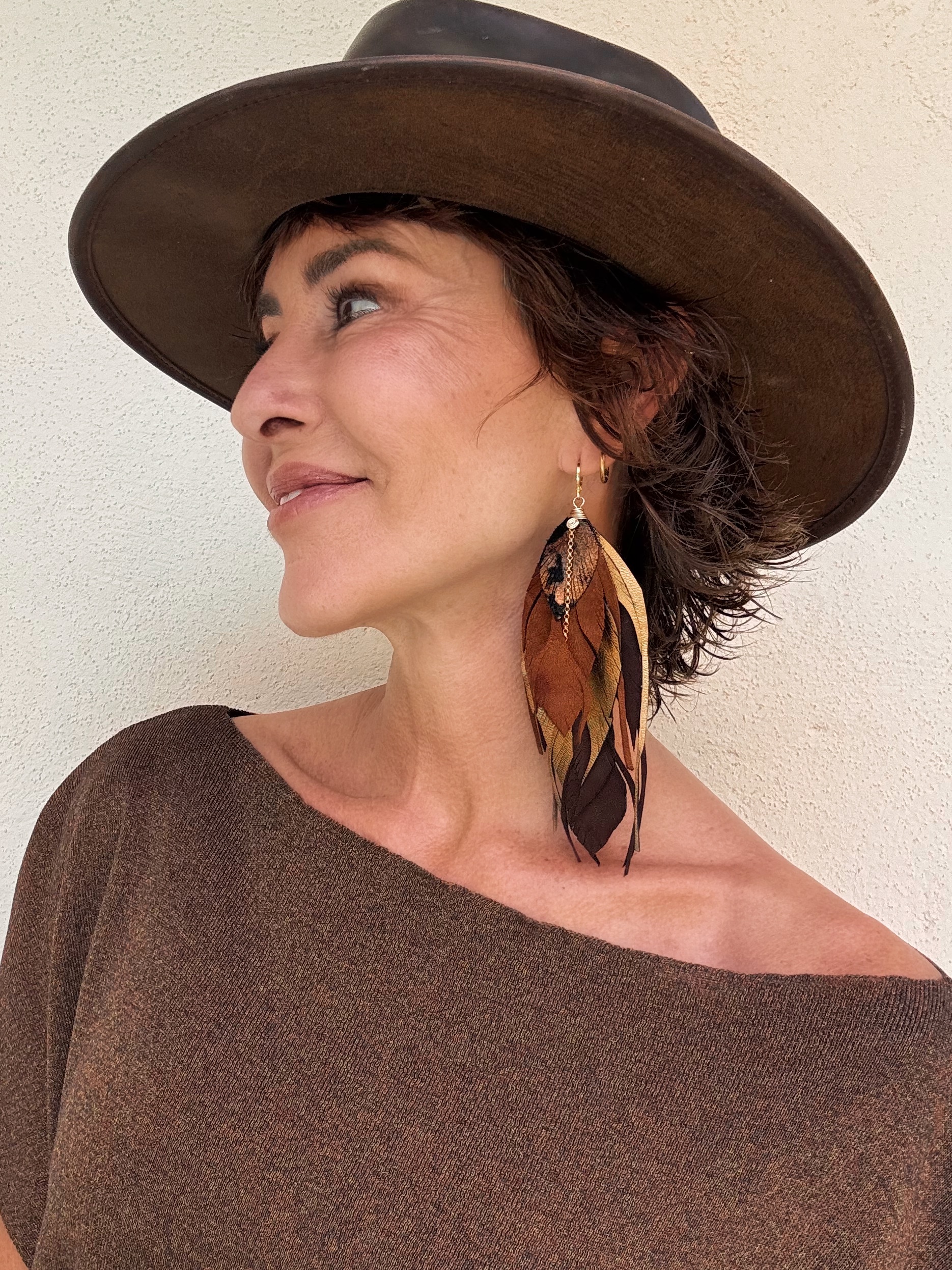 Handcrafted feather-shaped earring, made from leather with a delicate mix of textures and colors for a bohemian, nature-inspired style. Adorned with a gold-plated chain and hook. A unique piece that adds movement and character to any outfit.