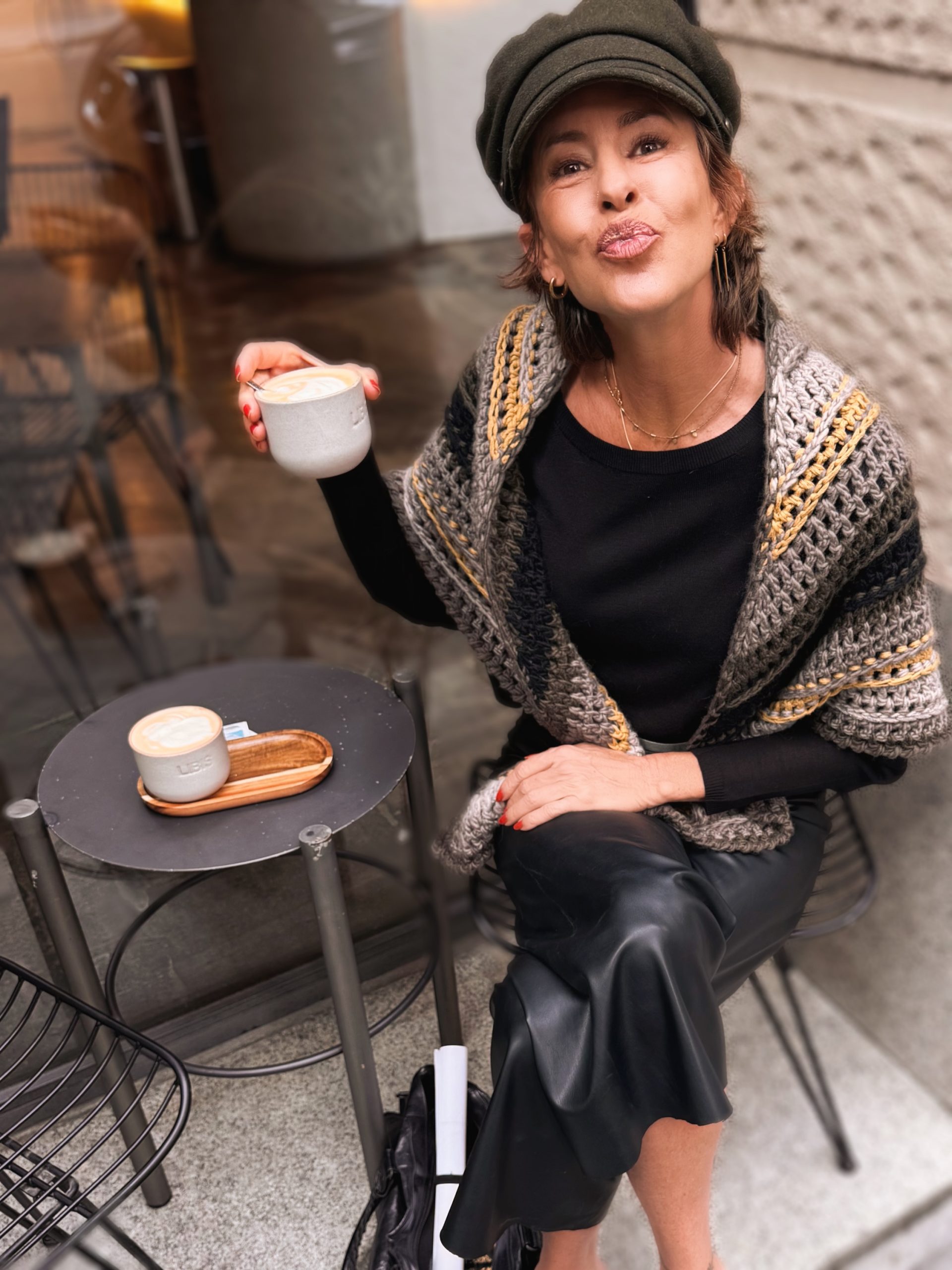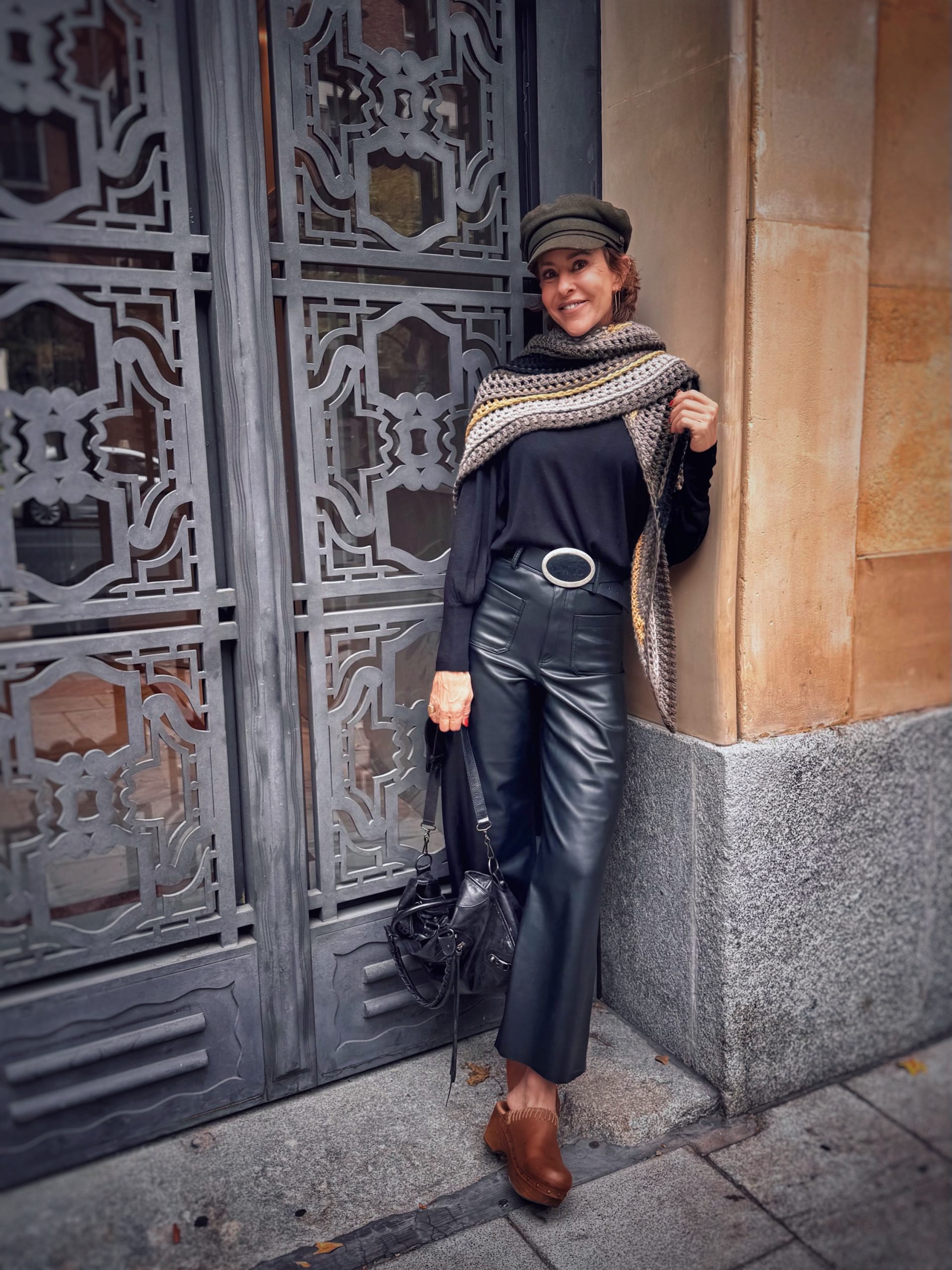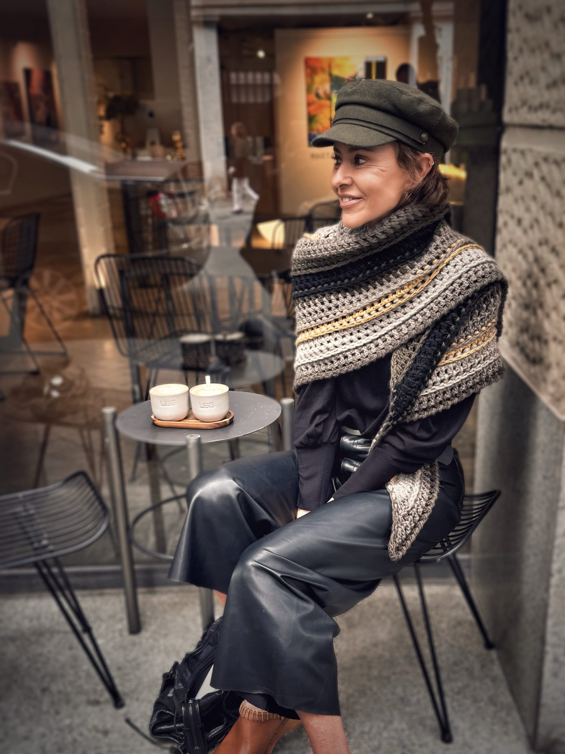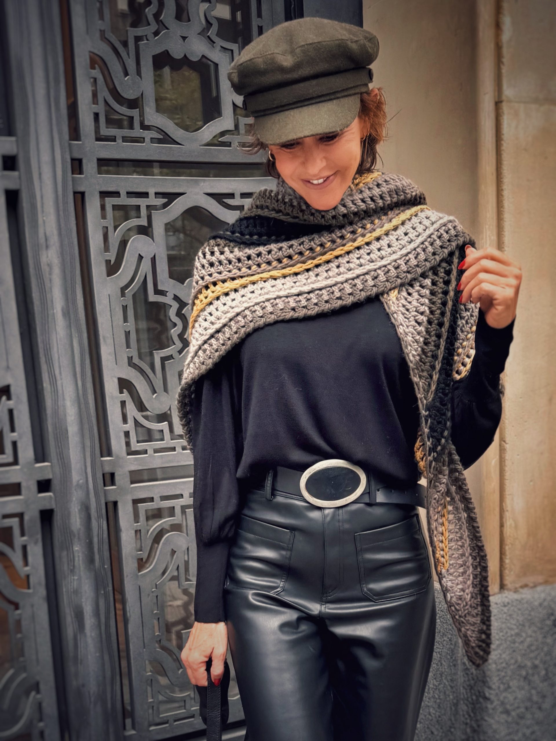 Chal triangular tejido a mano en crochet con lana suave y cálida. Combina tonos grises, negros y mostaza en franjas geométricas que le dan un aire contemporáneo y versátil. Perfecto para abrigar con estilo en otoño e invierno, una pieza única de moda lenta hecha con dedicación artesanal.