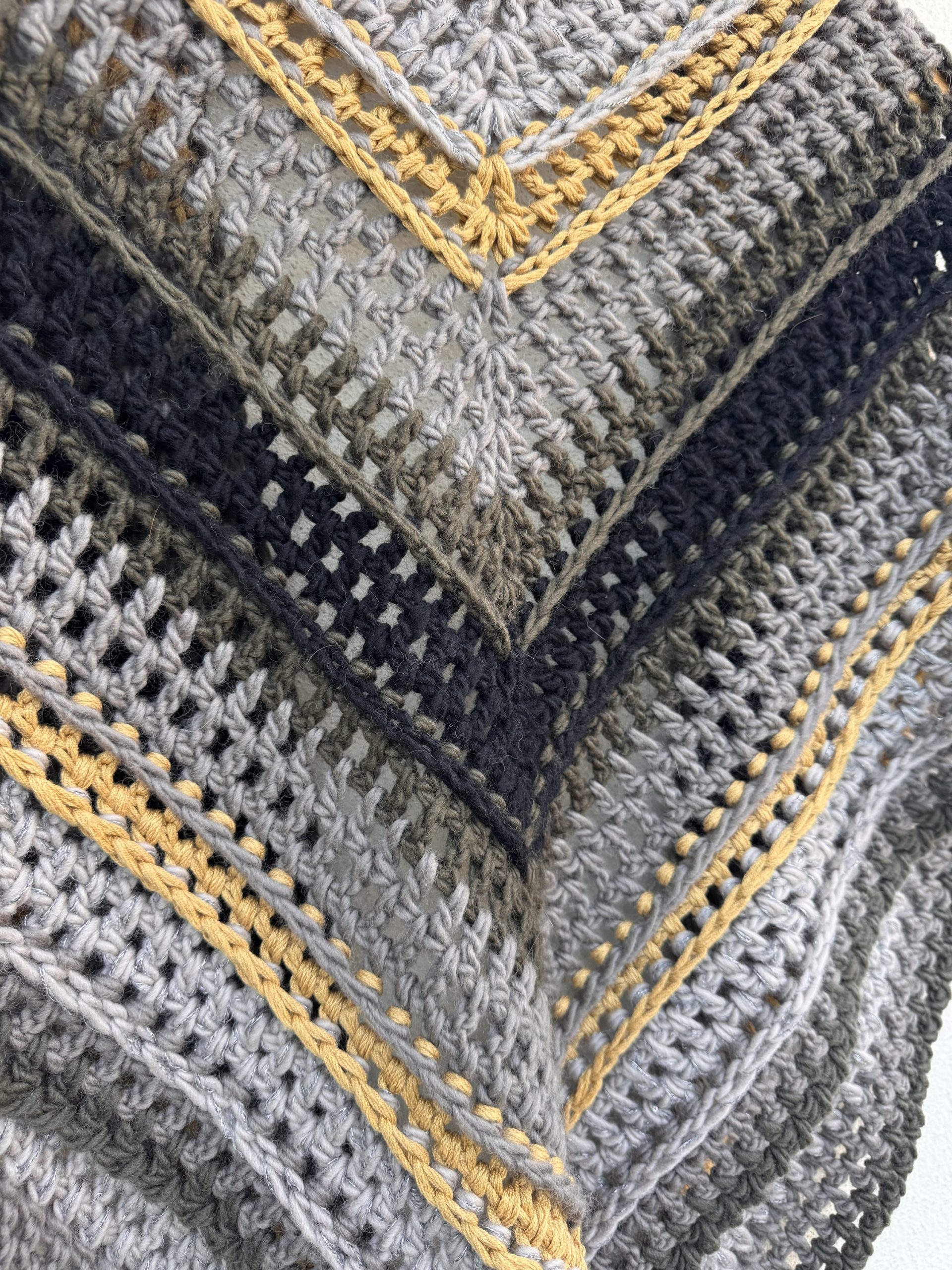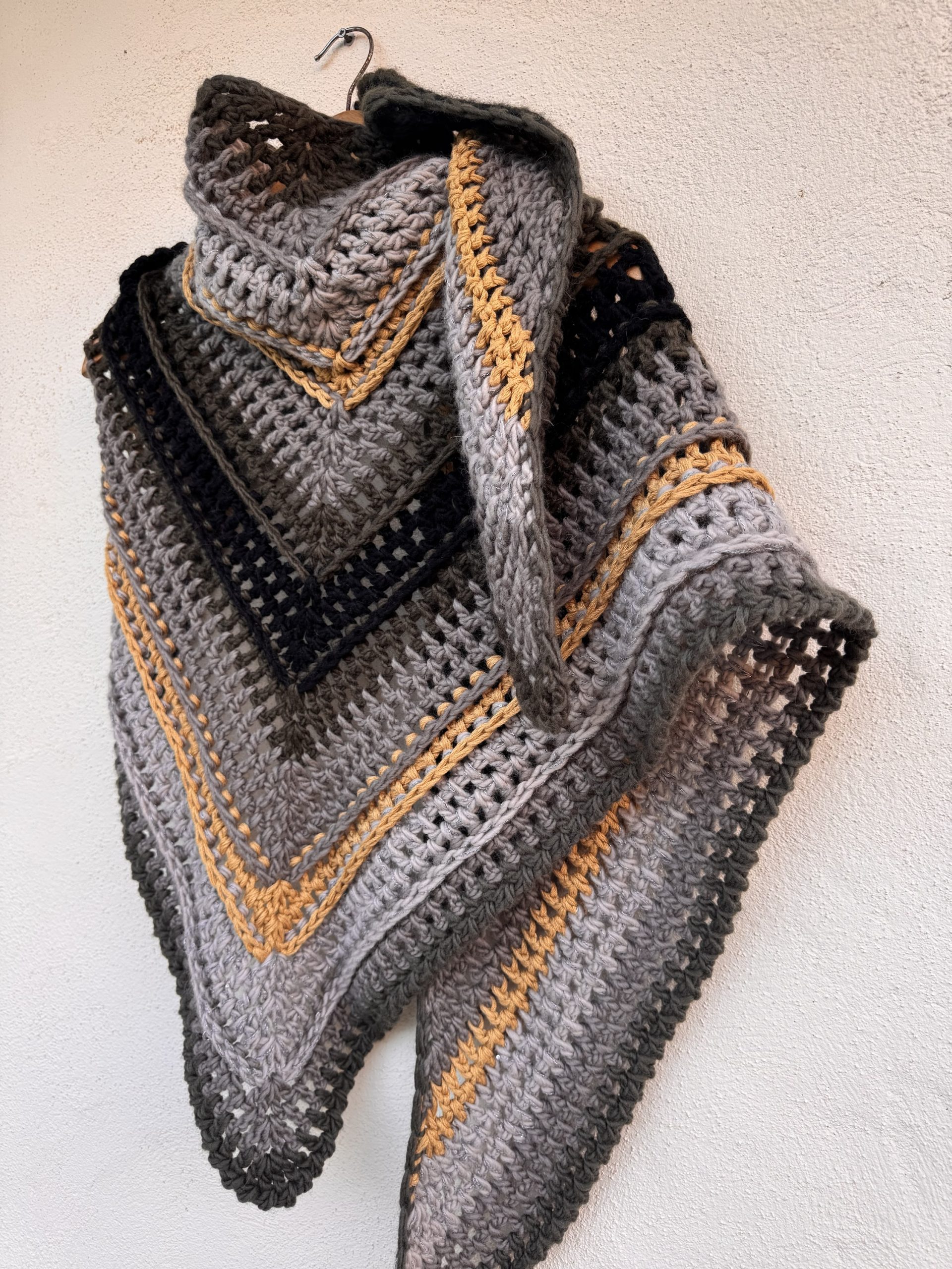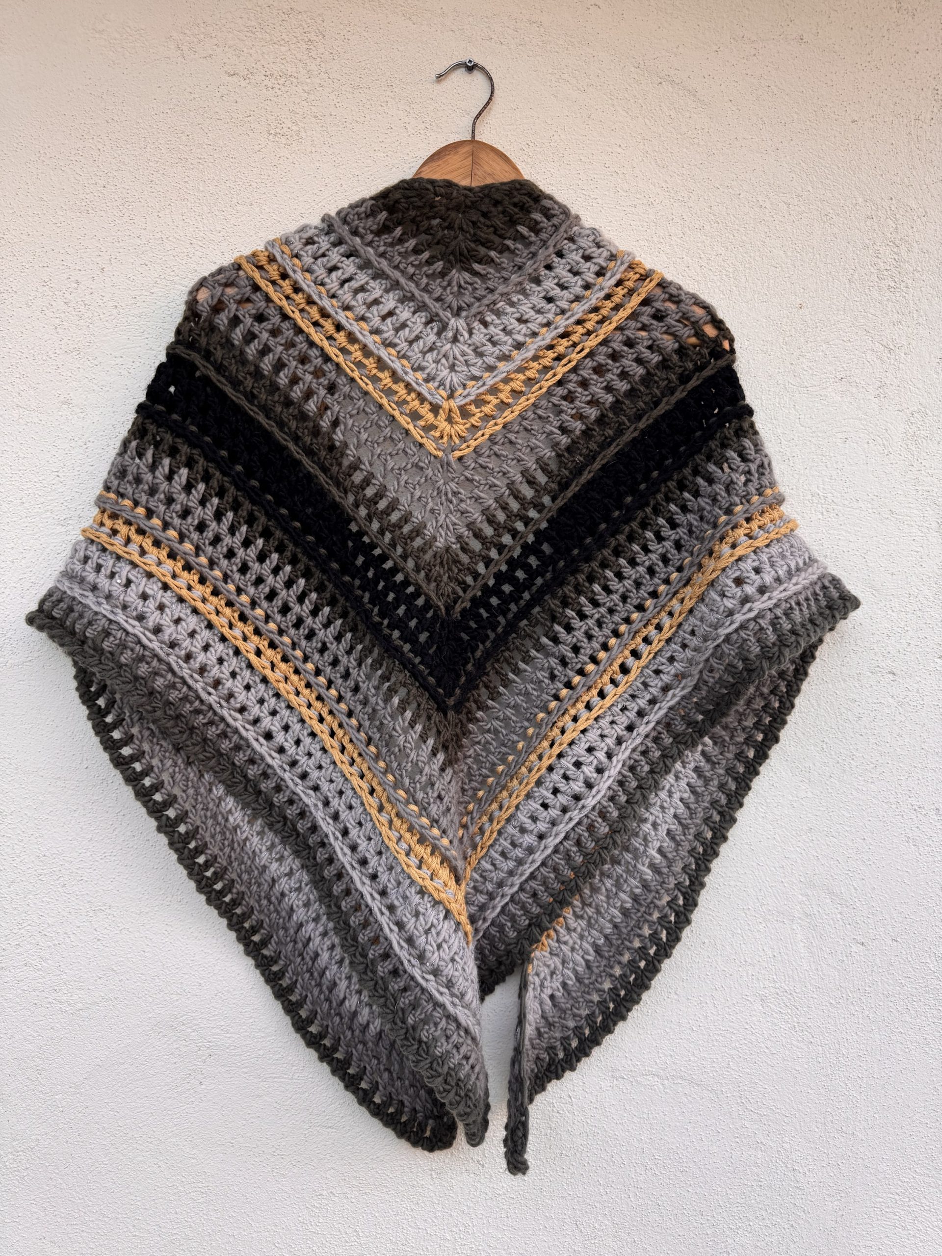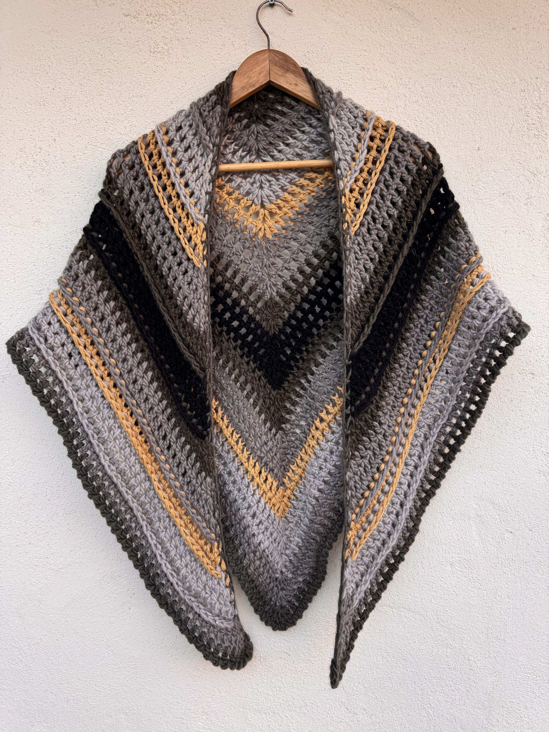 Handmade triangular crochet shawl crafted in soft wool. Featuring a mix of grey, black and mustard tones in geometric stripes, it blends warmth and modern style. A unique slow fashion piece, perfect for autumn and winter.