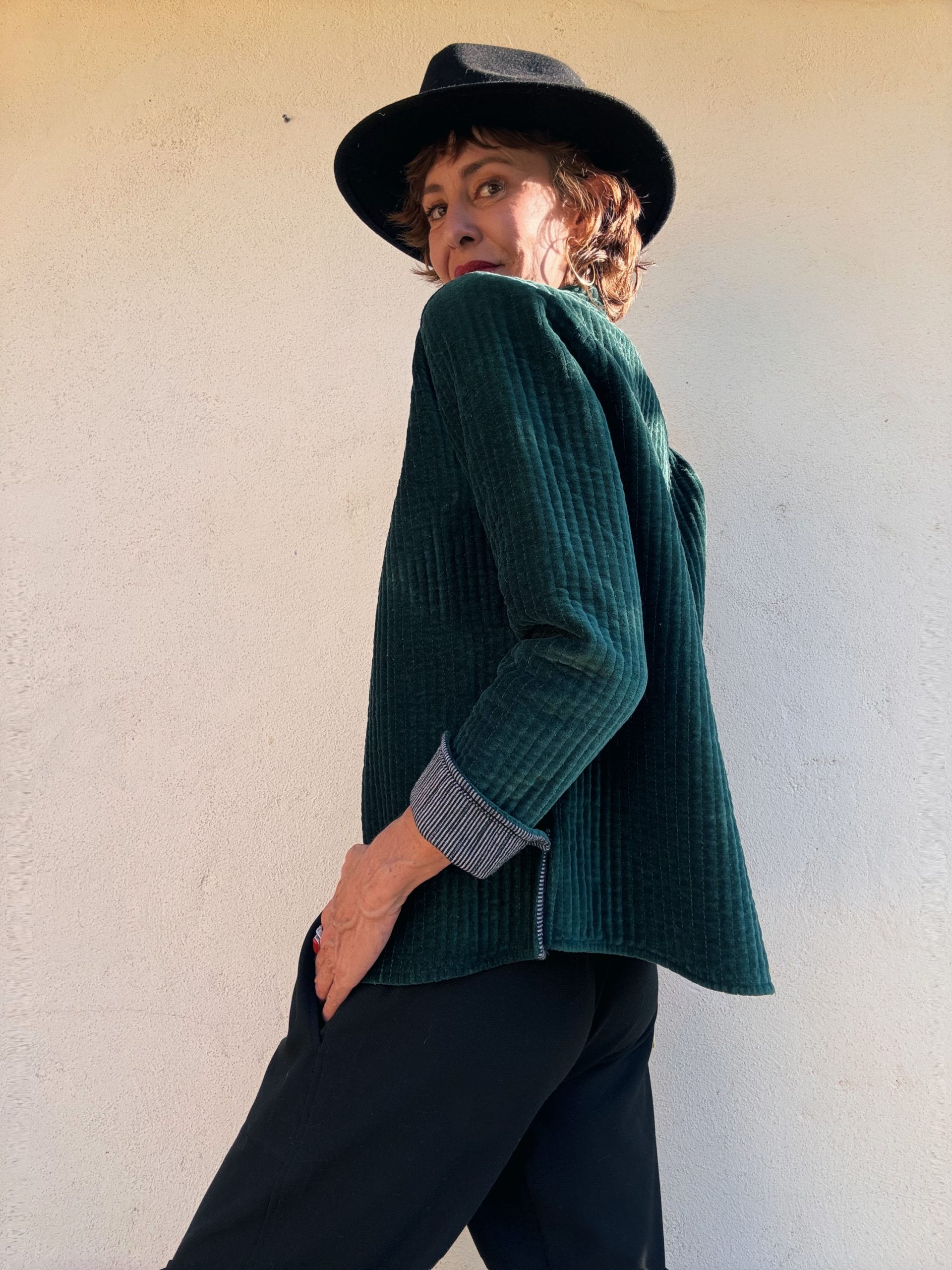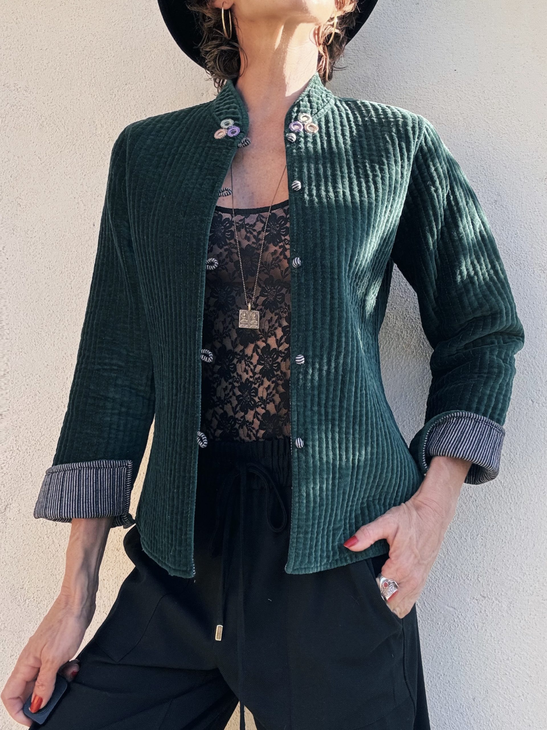 Discover our new velvet jacket, a must-have for this autumn. With mirror details sewn into the collar, this piece combines sophistication and originality. You can wear it loose for a relaxed look or tie it with the included belt to accentuate your figure. Perfect for those seeking a timeless slow fashion style. I wear size S/M, and it’s ideal for any occasion.