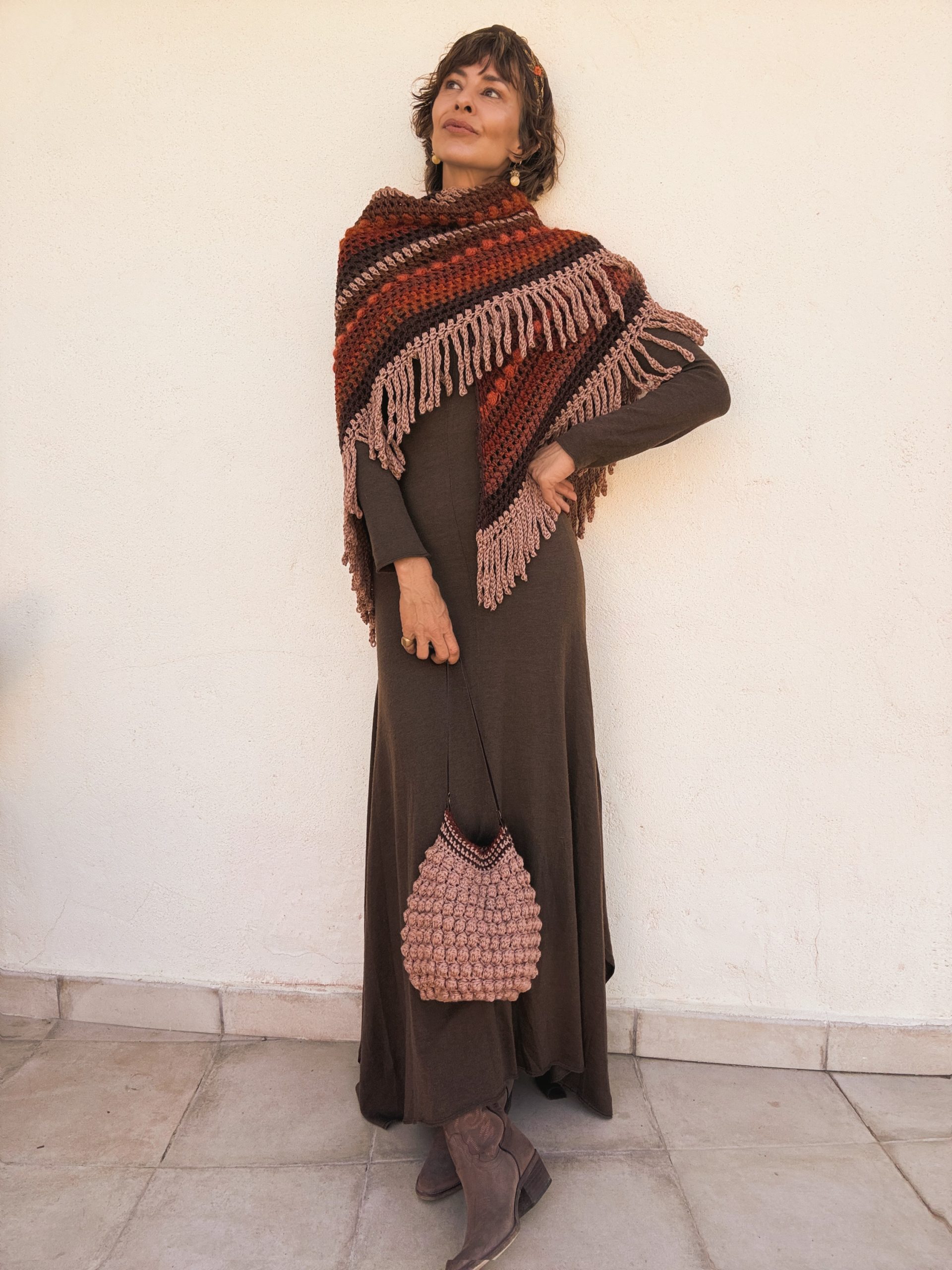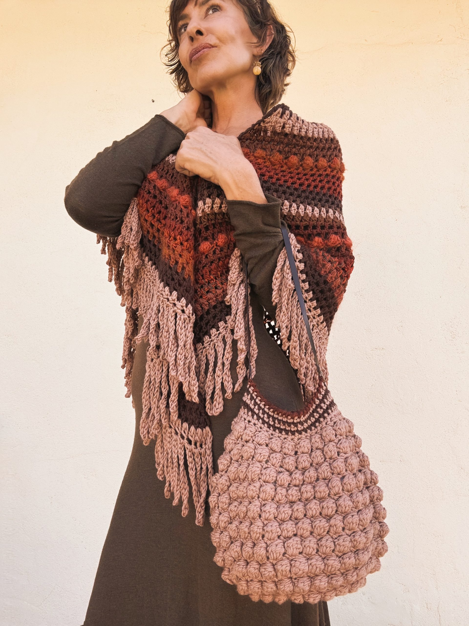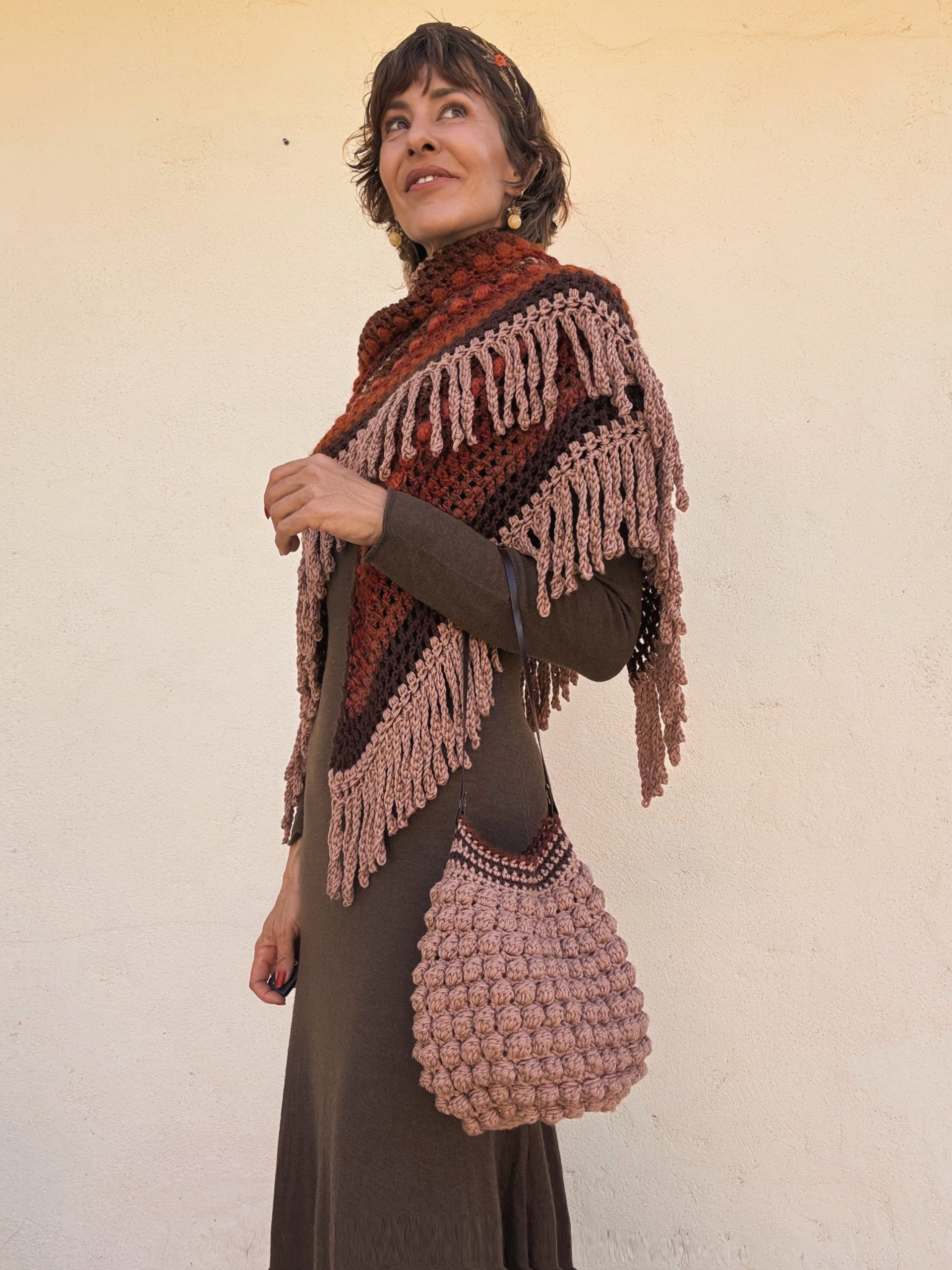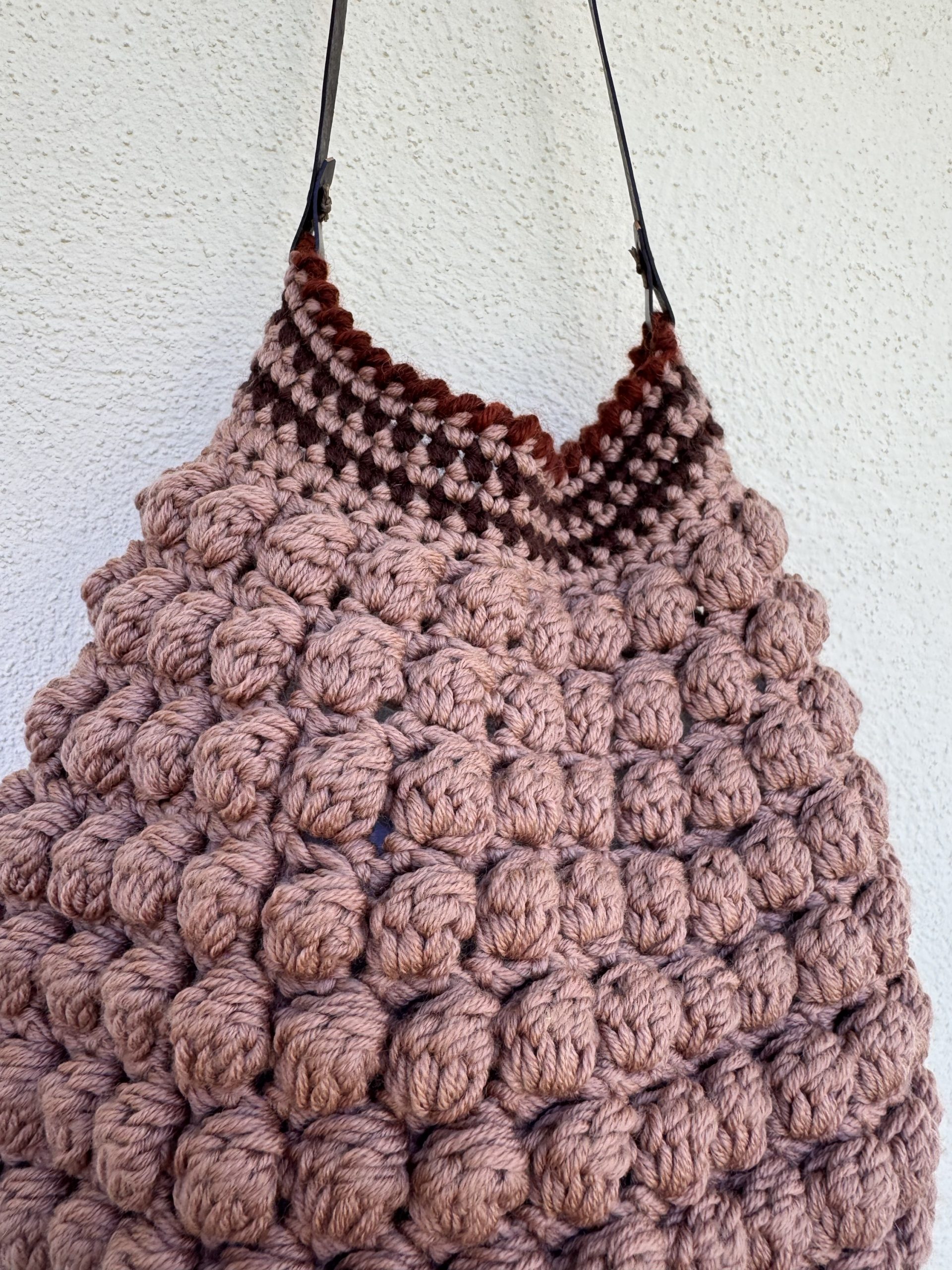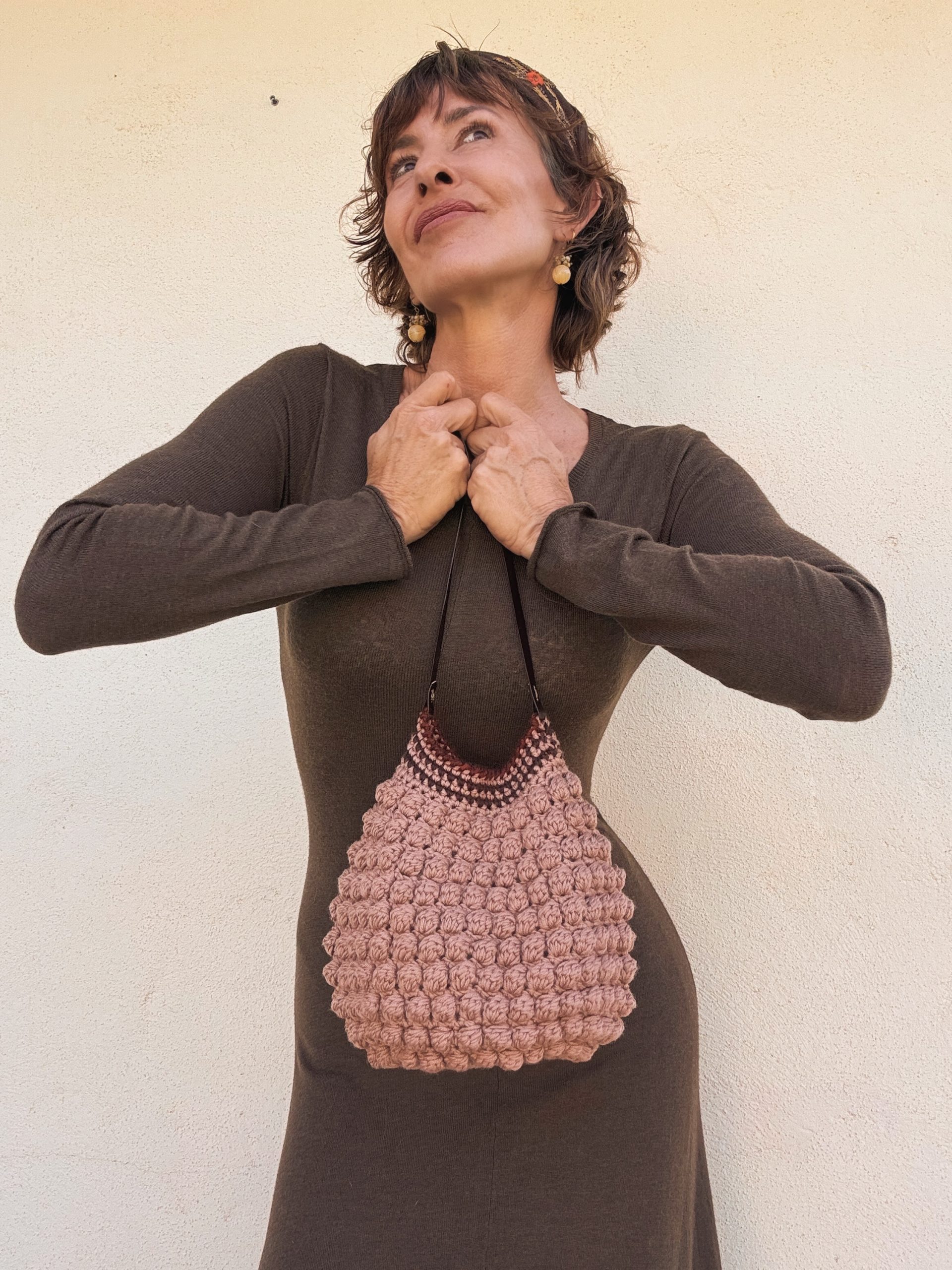 Bolso tejido a mano en lana Merino con técnica de crochet. Su tono rosa tostado y la textura suave de la fibra natural le dan un aire cálido y elegante. El asa de cuero aporta contraste y resistencia, creando una pieza funcional y sofisticada. Un accesorio artesanal que combina comodidad, estilo y autenticidad