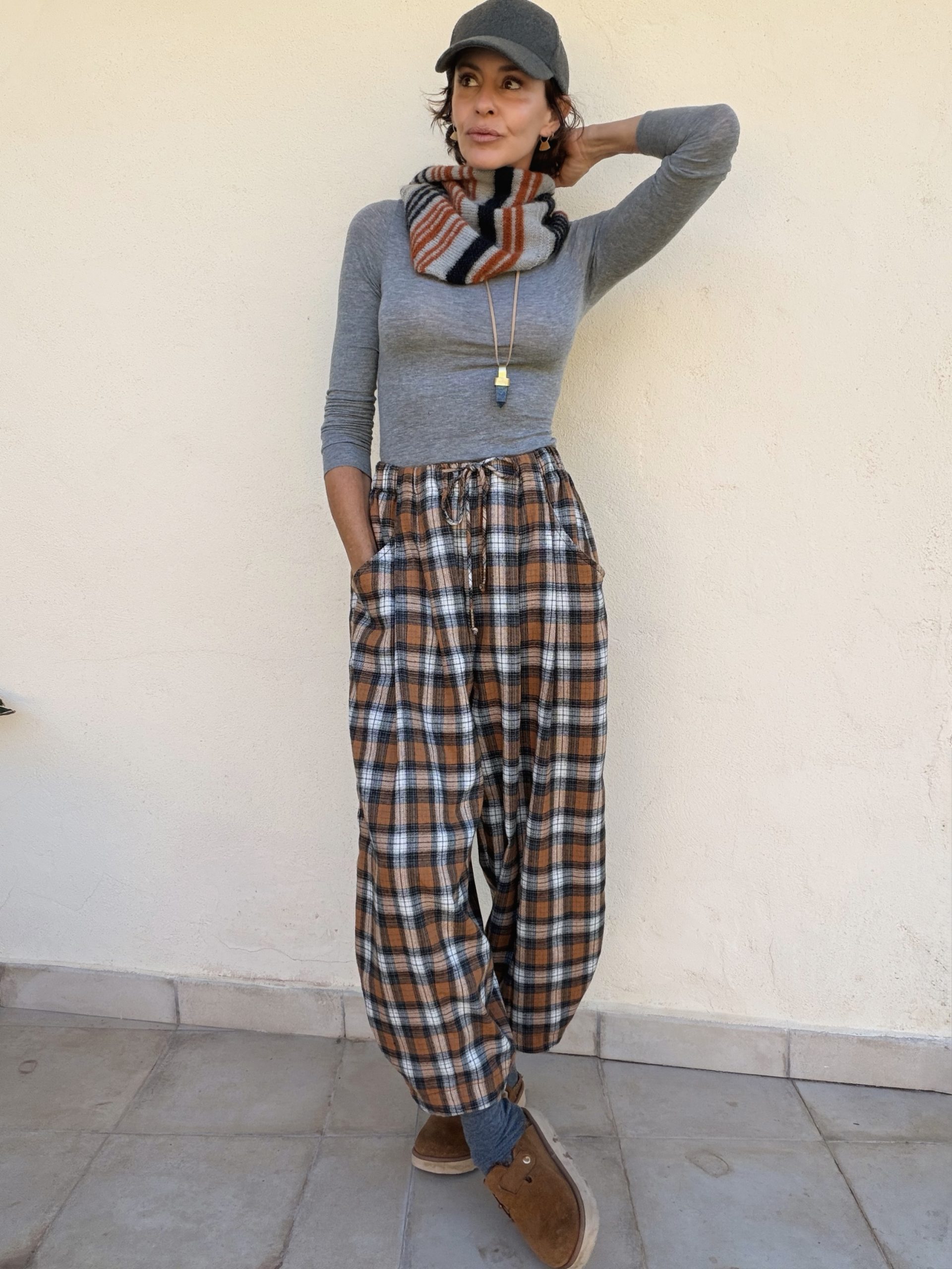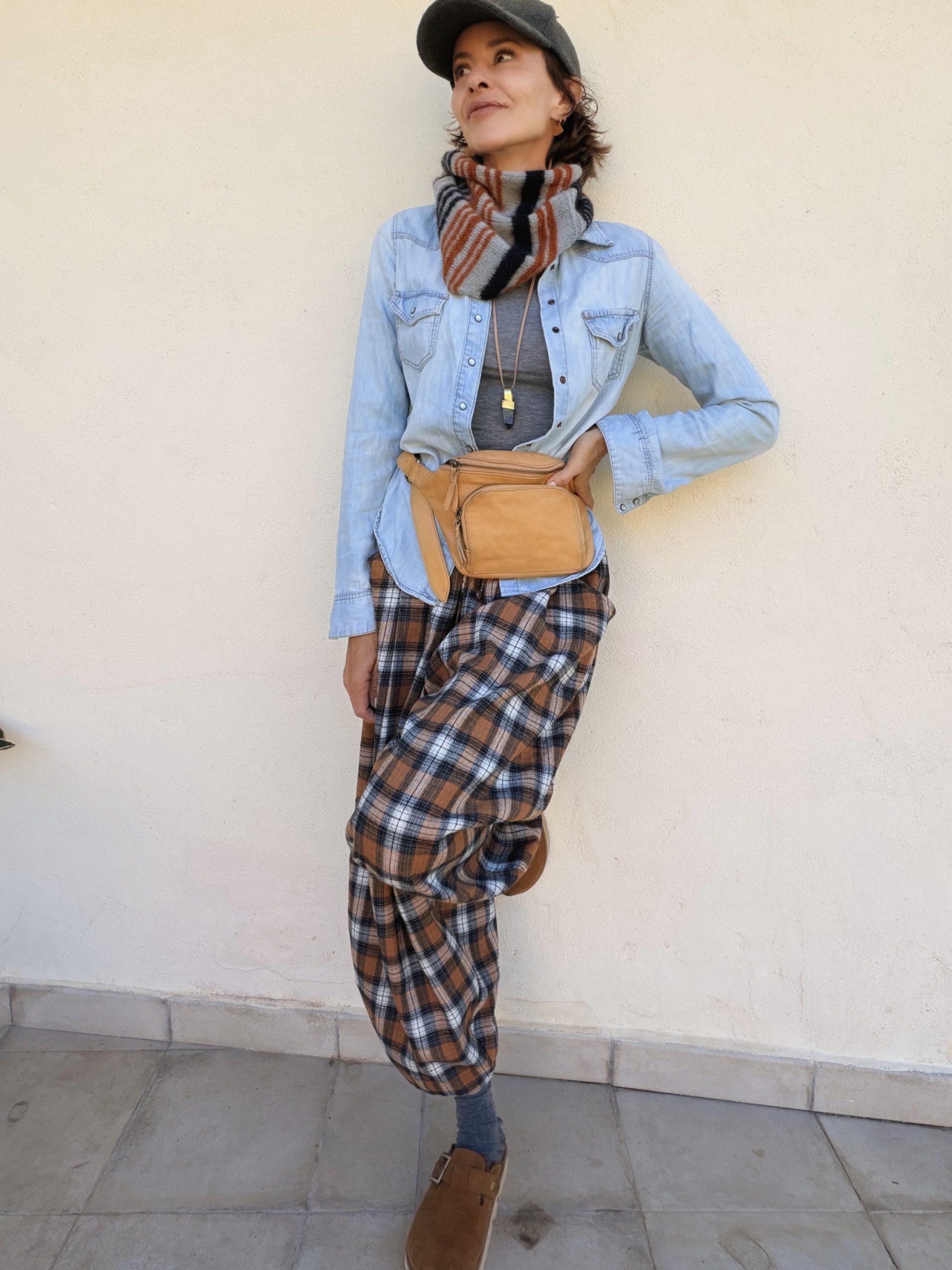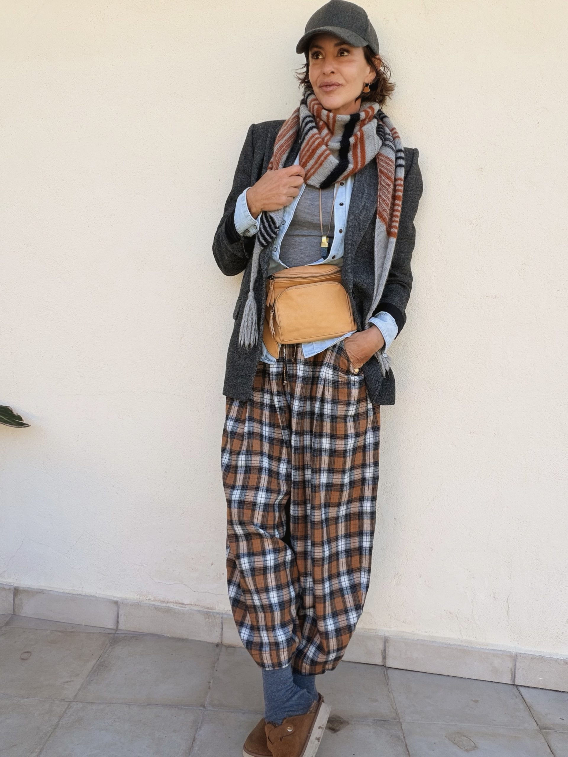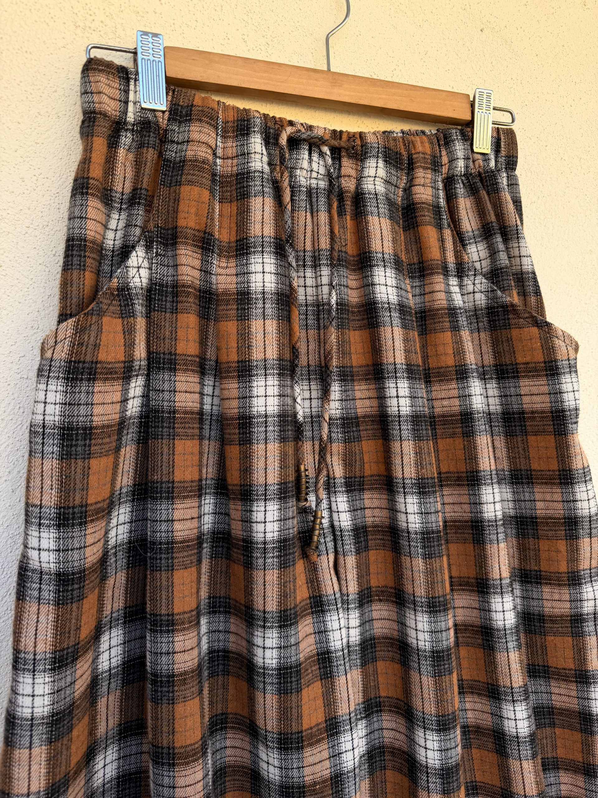 El diseño incorpora dos bolsillos frontales grandes, prácticos y funcionales, que refuerzan su carácter casual. El estampado de cuadros en tonos cálidos aporta personalidad y un aire atemporal, fácil de combinar con prendas lisas o de punto.