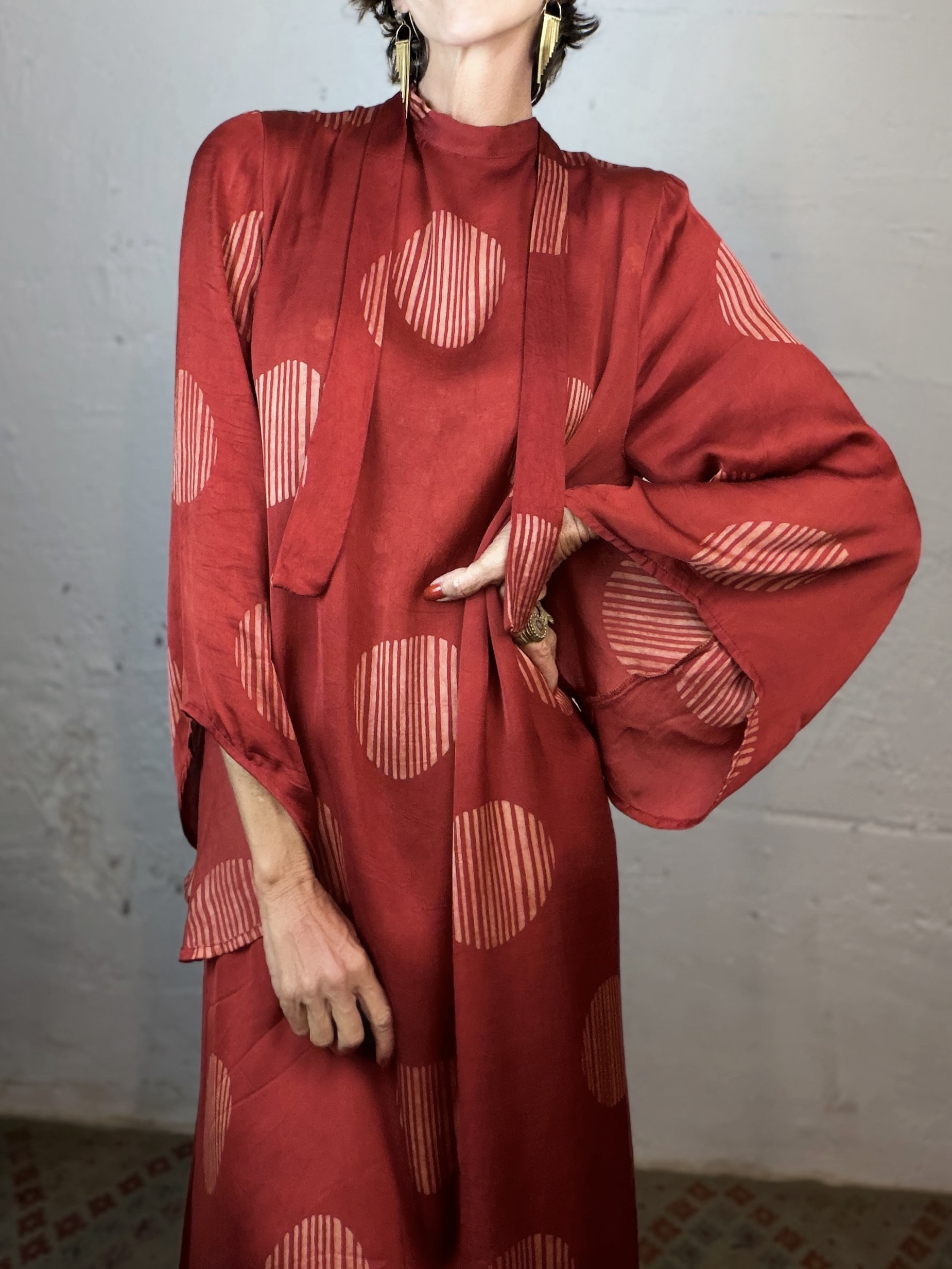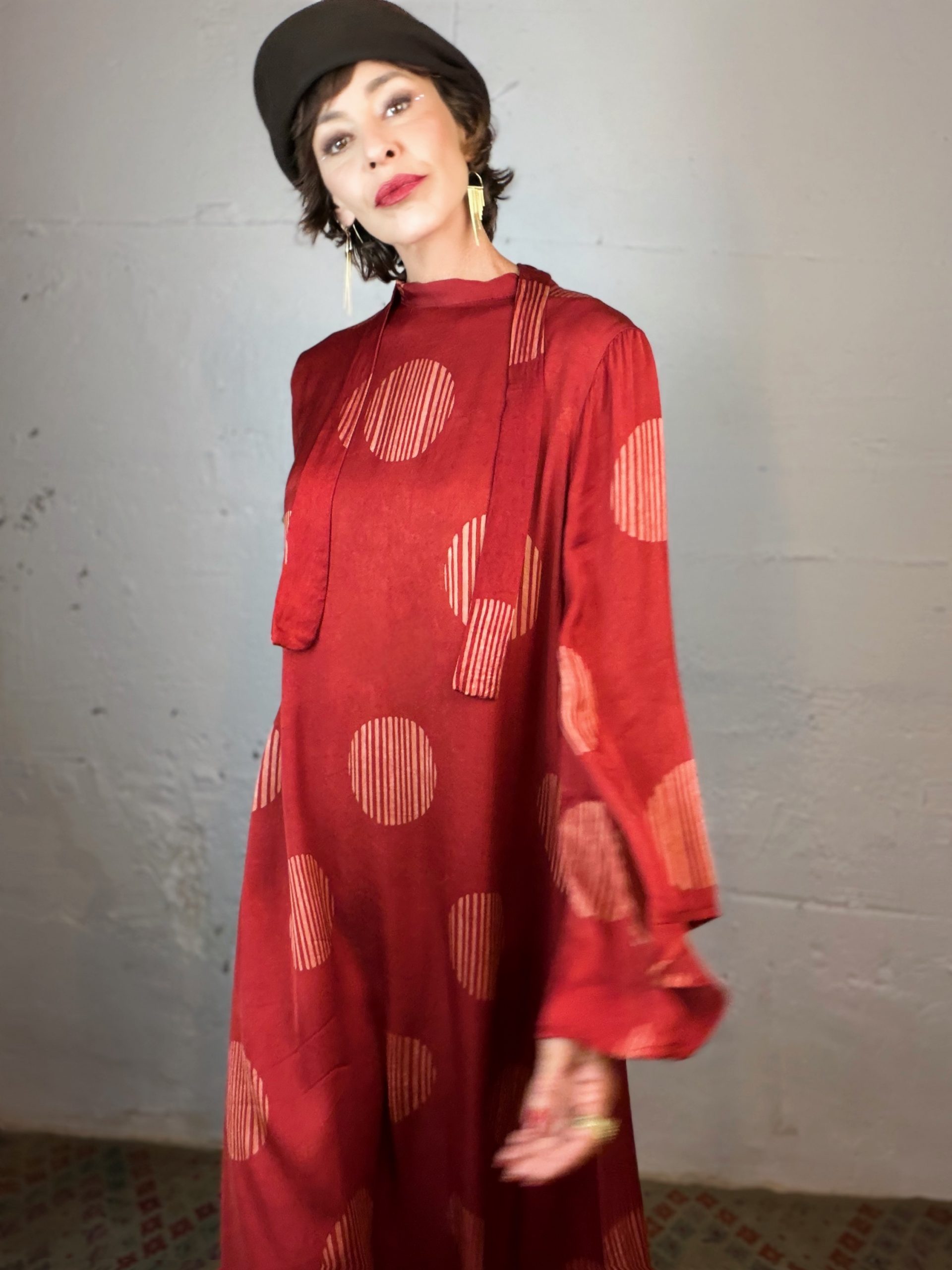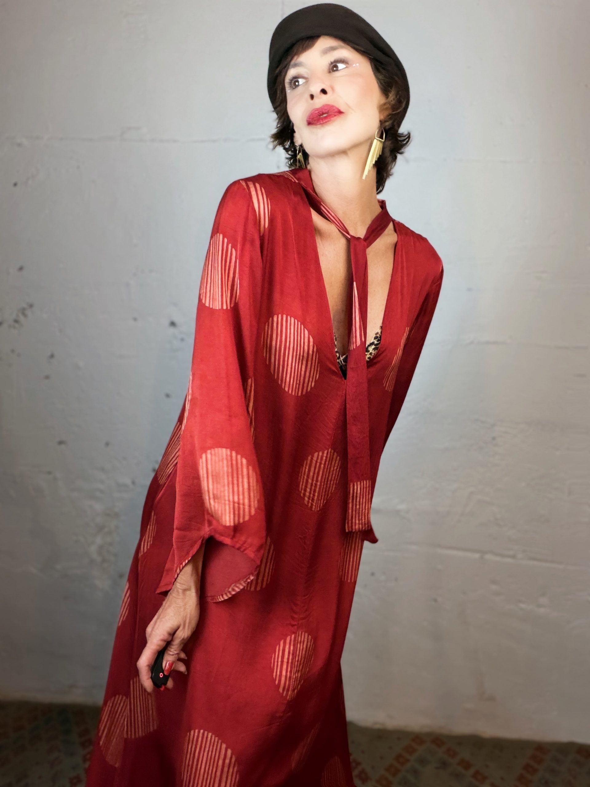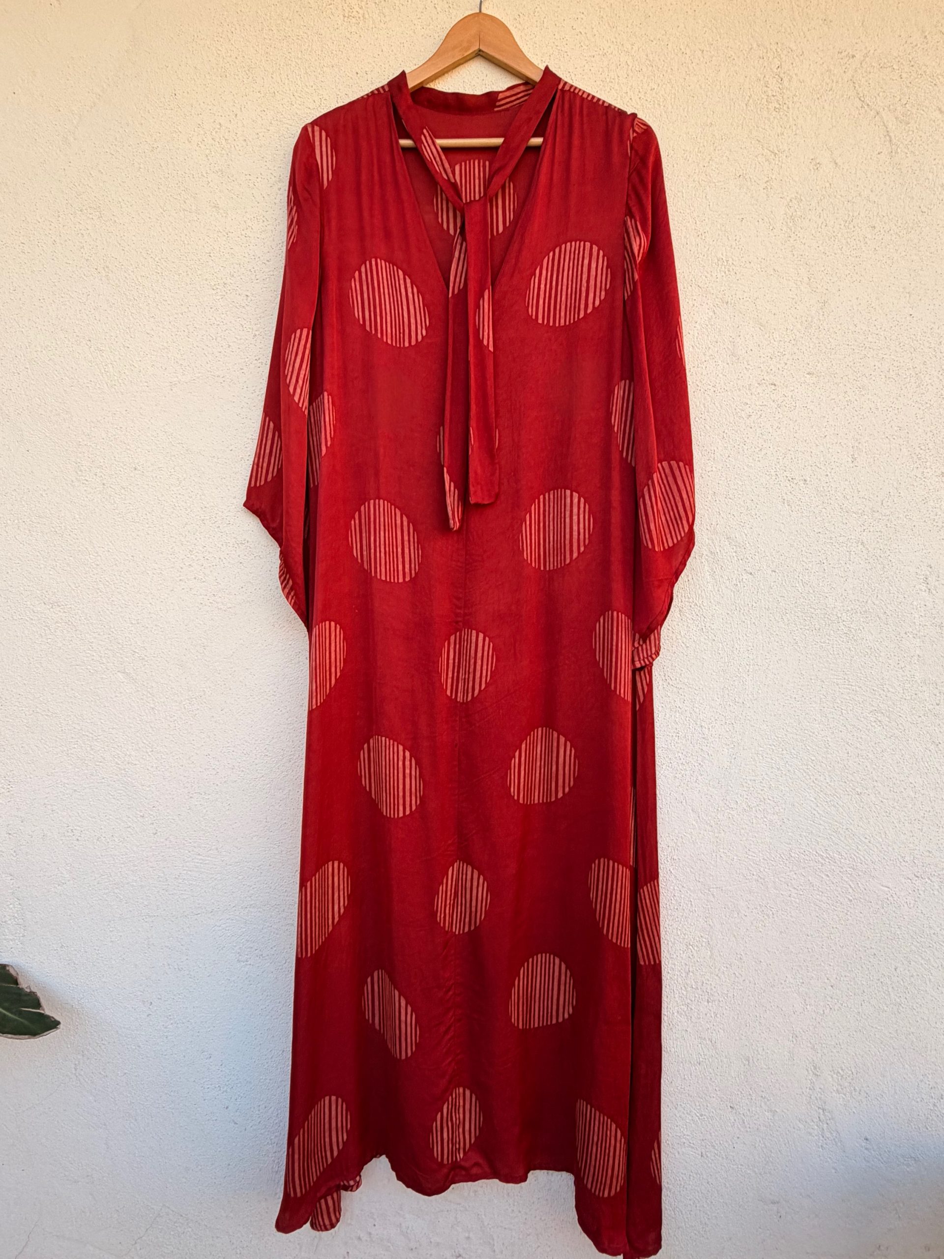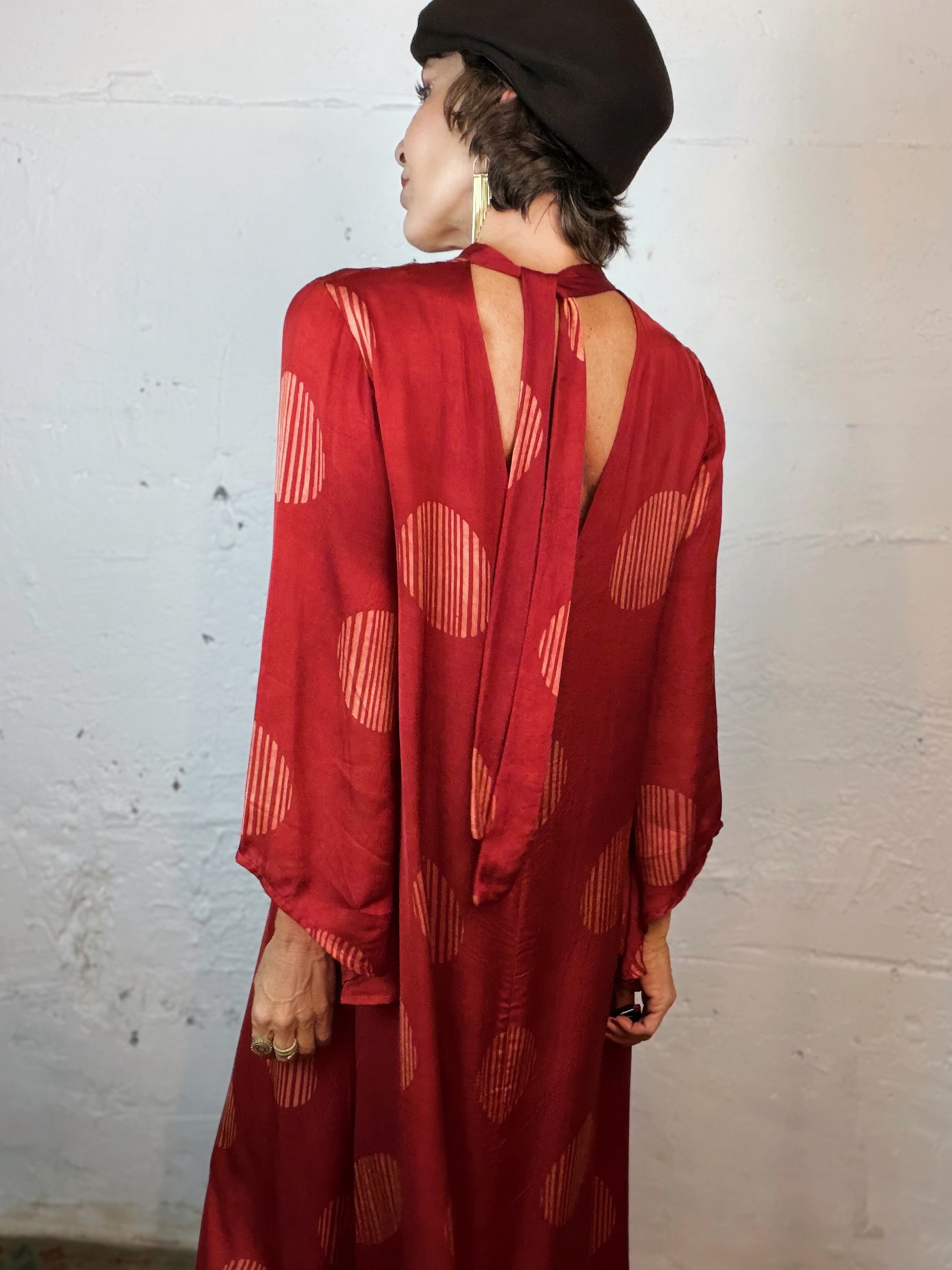 El diseño destaca por su lazada en el cuello, un detalle versátil que permite llevarla atada tanto delante como en la espalda, cambiando el estilo según la ocasión. Mangas largas con caída suave y un largo hasta los tobillos que estiliza la figura.