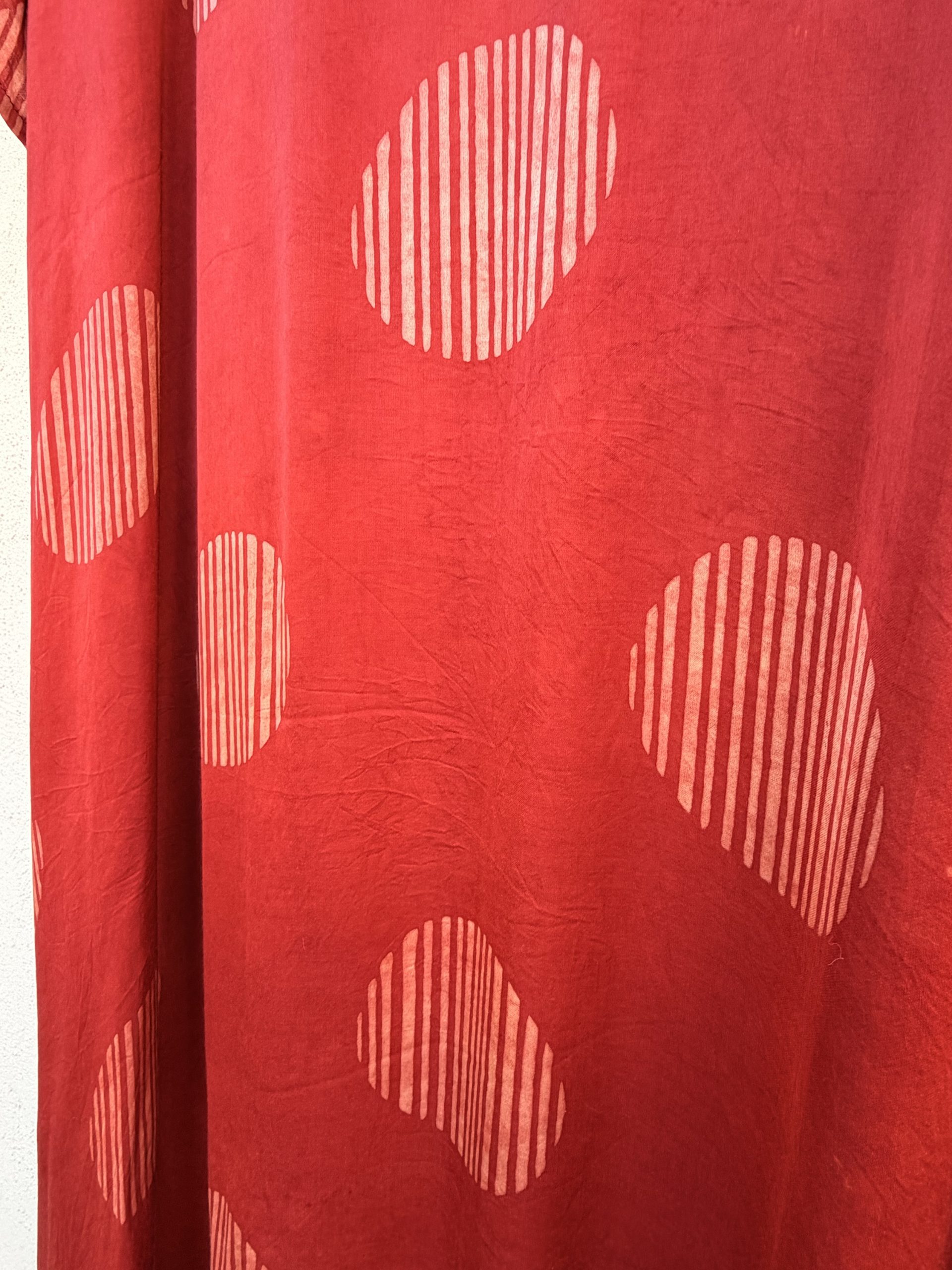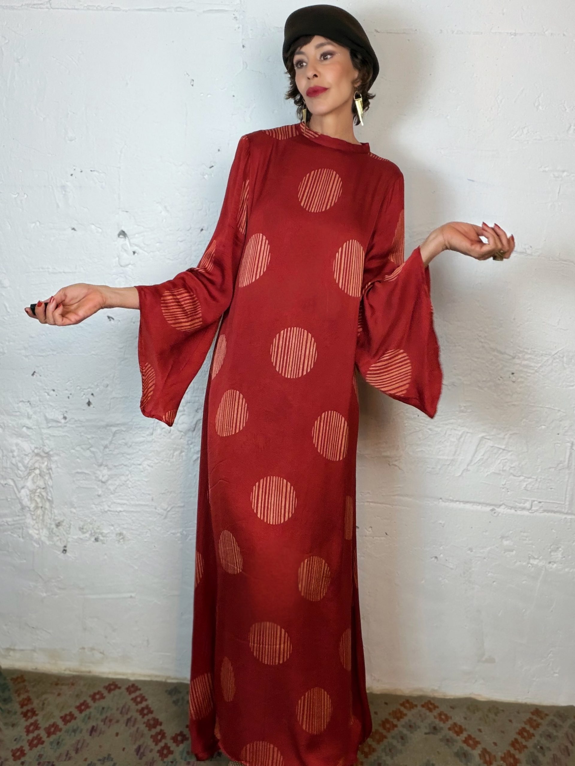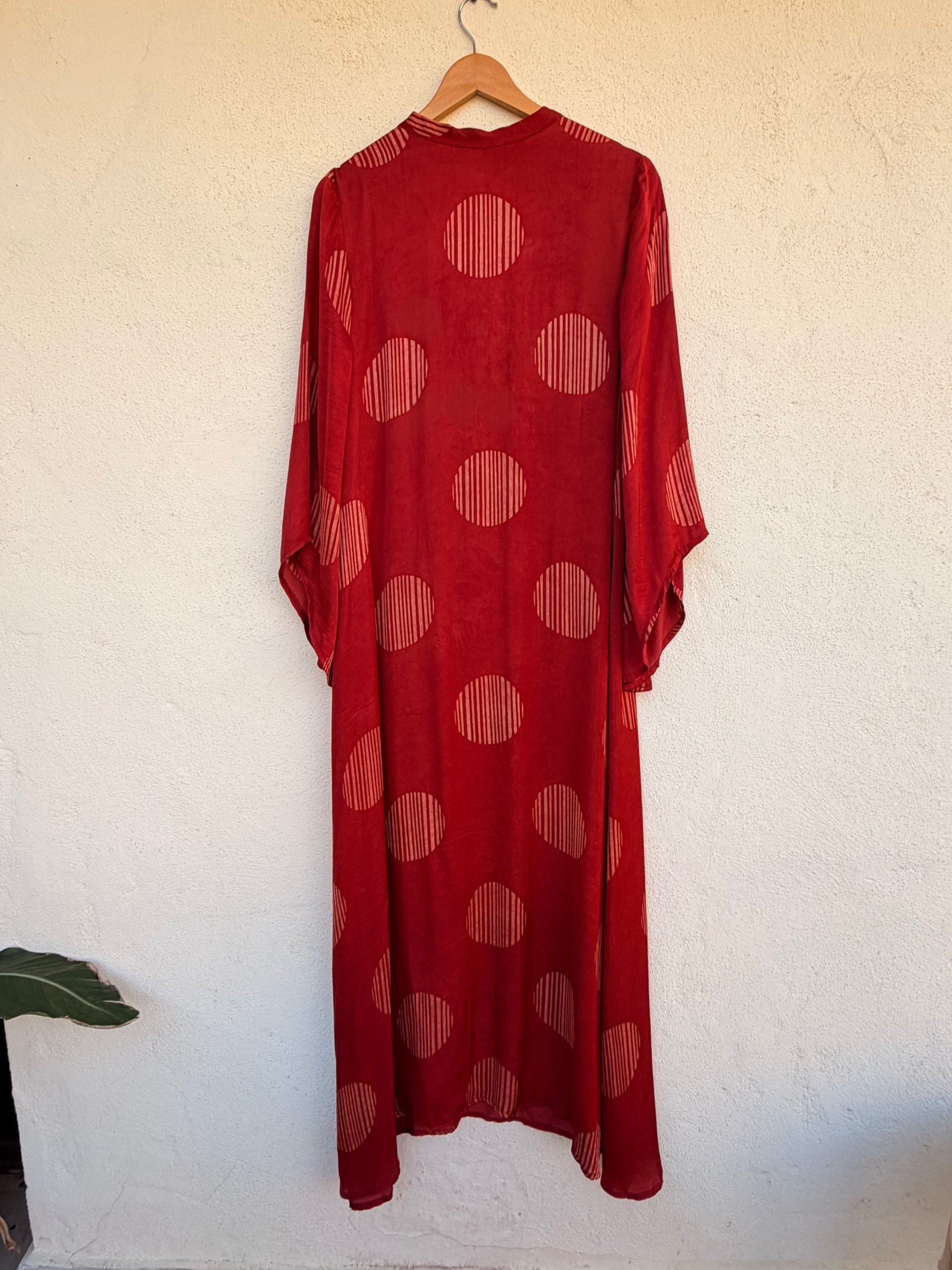 Vestido largo confeccionado en seda estampada, ligero y fluido, con una caída elegante que acompaña el movimiento del cuerpo. Su talla única se adapta cómodamente a distintas siluetas gracias a su patrón amplio y relajado.