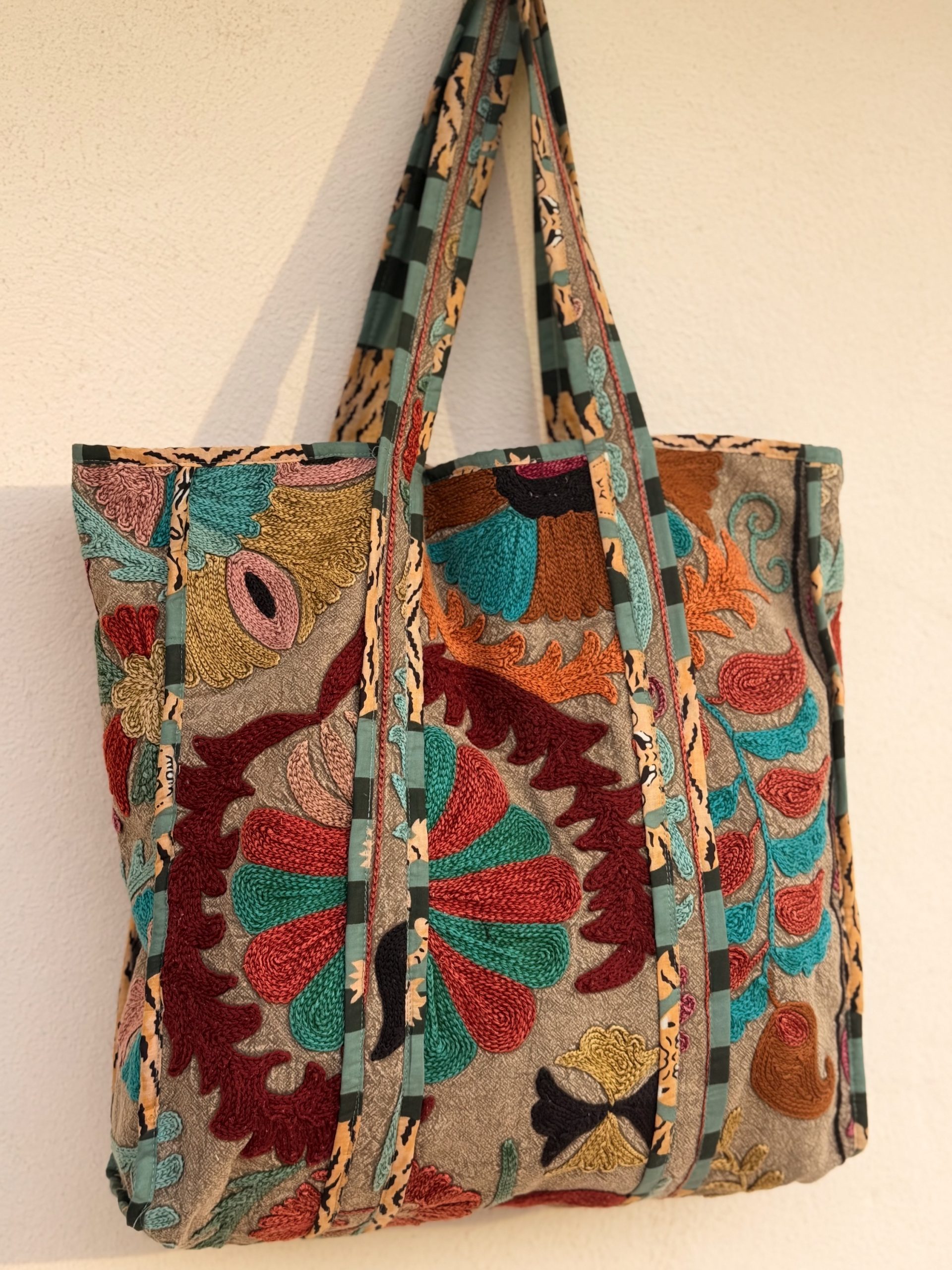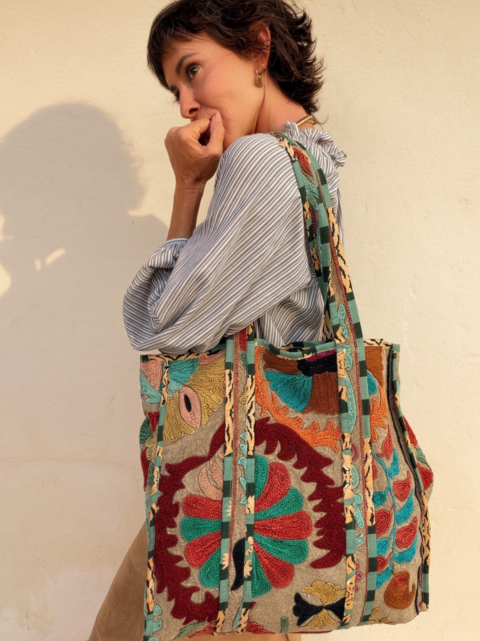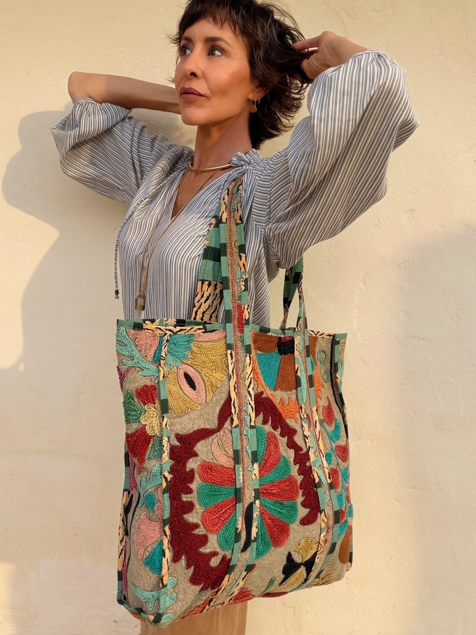Bolso Suzani bordado a mano con delicados motivos tradicionales que hacen de cada pieza un diseño único. Confeccionado en tejido de algodón y forro interior para mayor durabilidad y practicidad.