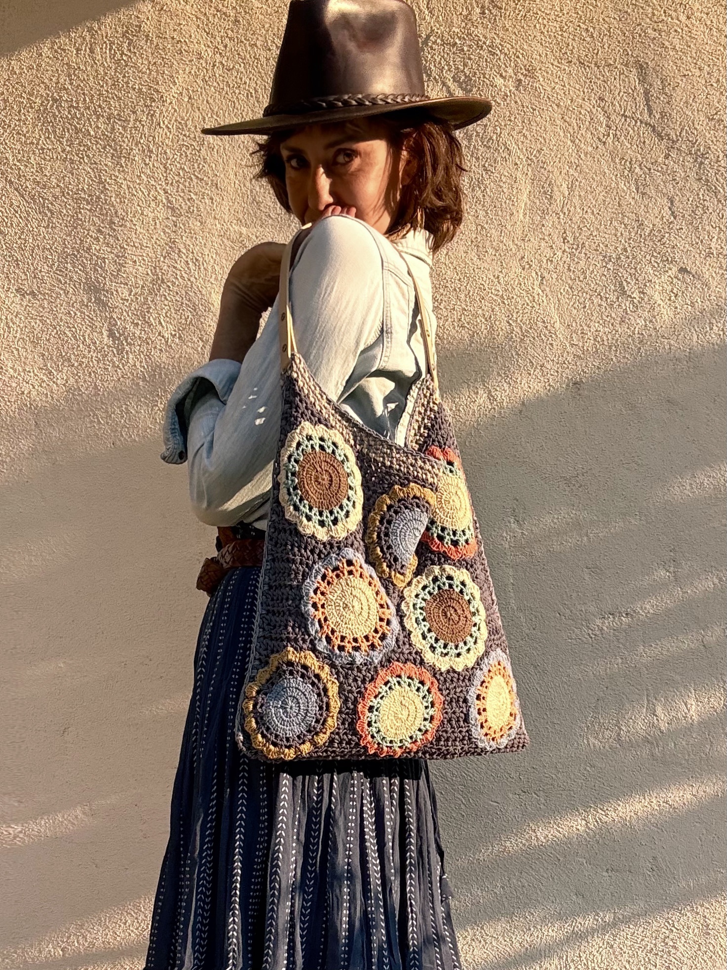 Bolso Tote tejido a crochet con original patrón de flores circulares. Elaborado en algodón 100% y con asa de cuero para mayor resistencia y estilo. Una pieza hecha a mano que combina artesanía, color y diseño bohemio, perfecta para dar un toque único y artesanal a cualquier look.