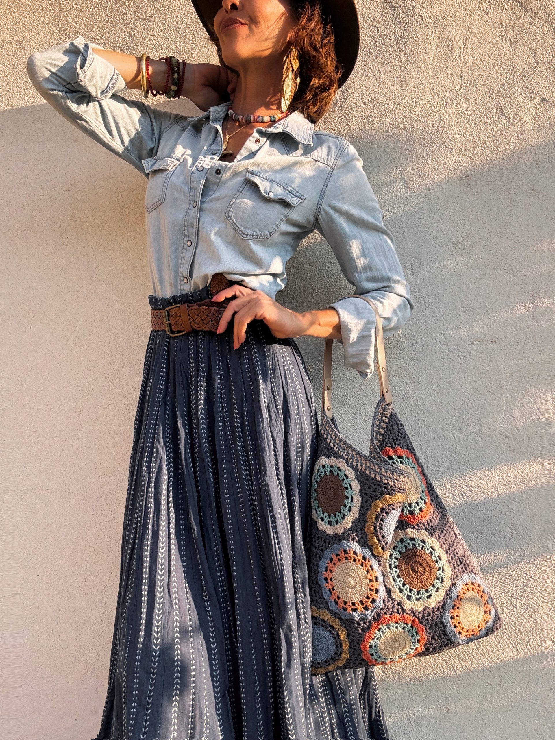 Crochet Tote Bag featuring a unique circular flower pattern. Handmade with 100% cotton yarn and finished with a leather strap for durability and style. A handcrafted piece that blends artisan charm, color, and bohemian design, perfect to add a unique and natural touch to any outfit