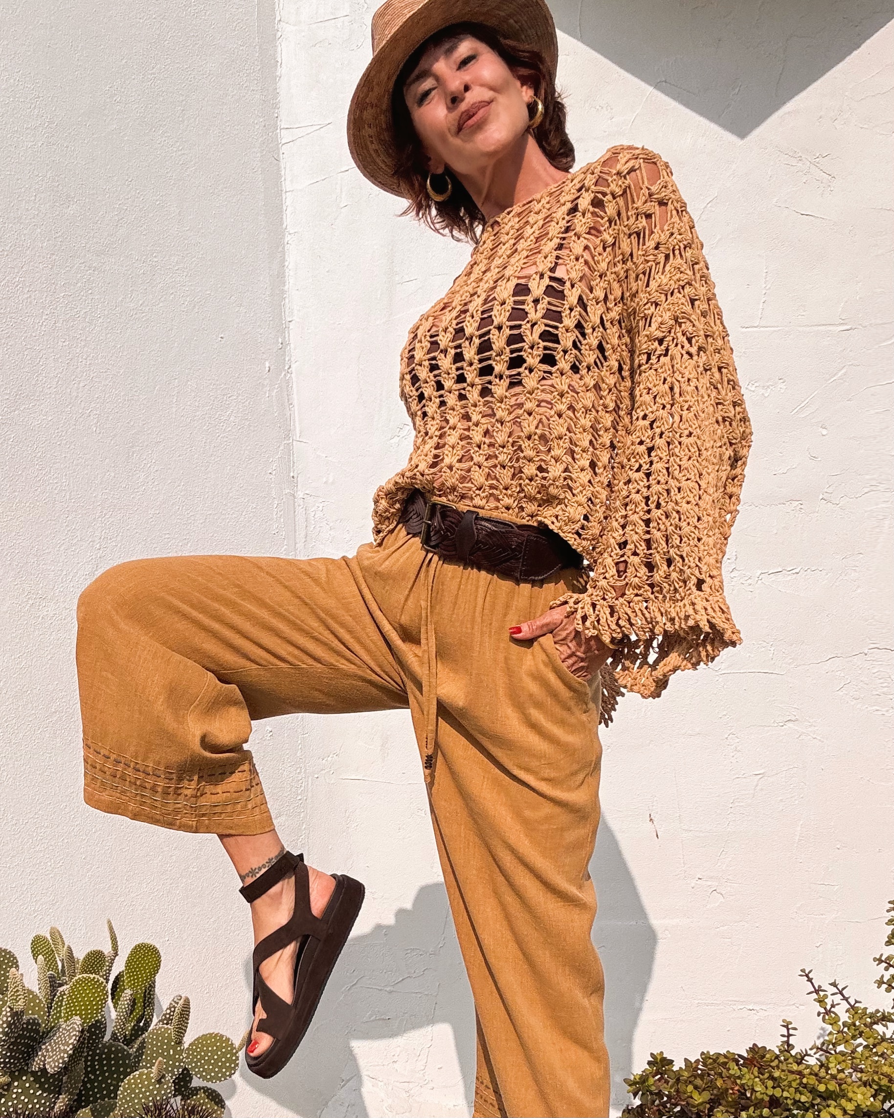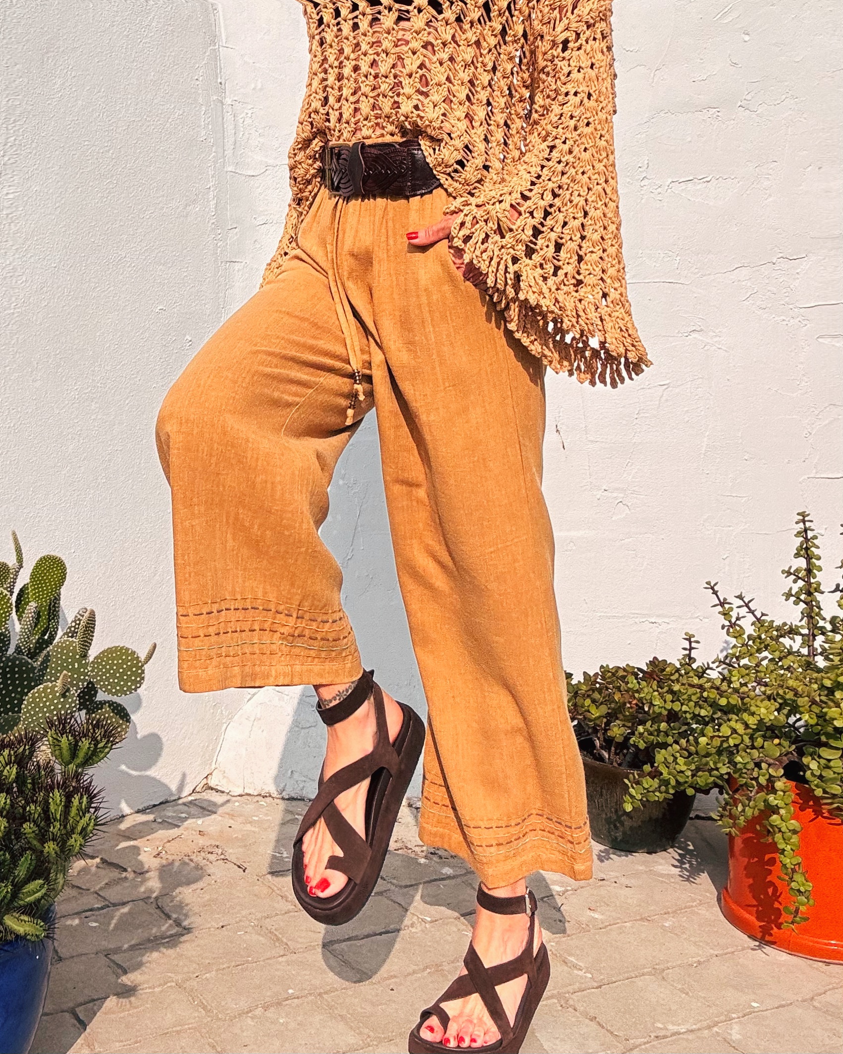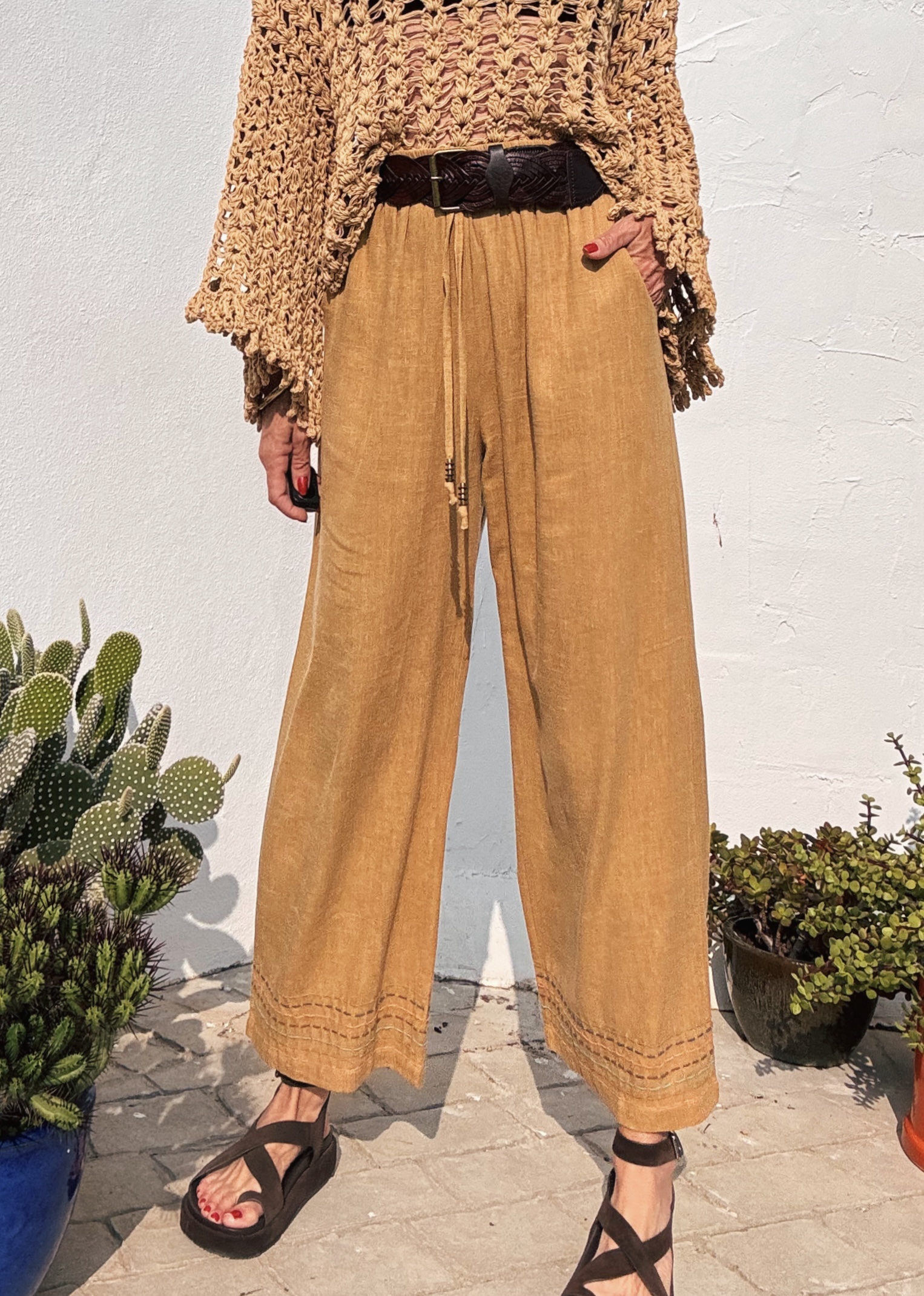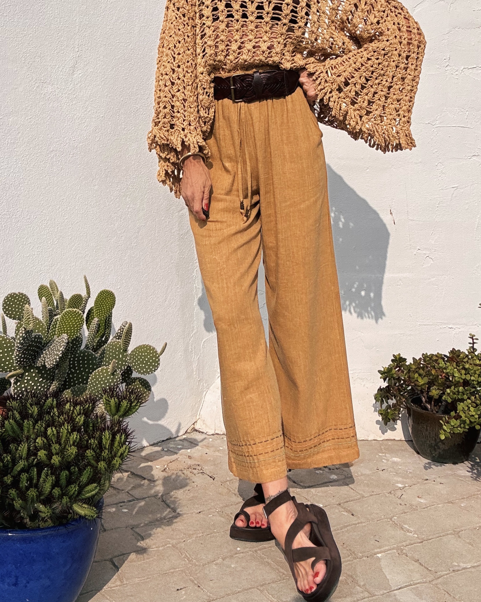 Pantalón de lino lavado en color arena con suave caída y corte recto. Cintura elástica con cordón ajustable rematado en cuentas de madera. Bolsillos laterales y detalle de pespuntes decorativos en el bajo. Un básico con alma artesanal, cómodo y fresco para el día a día.